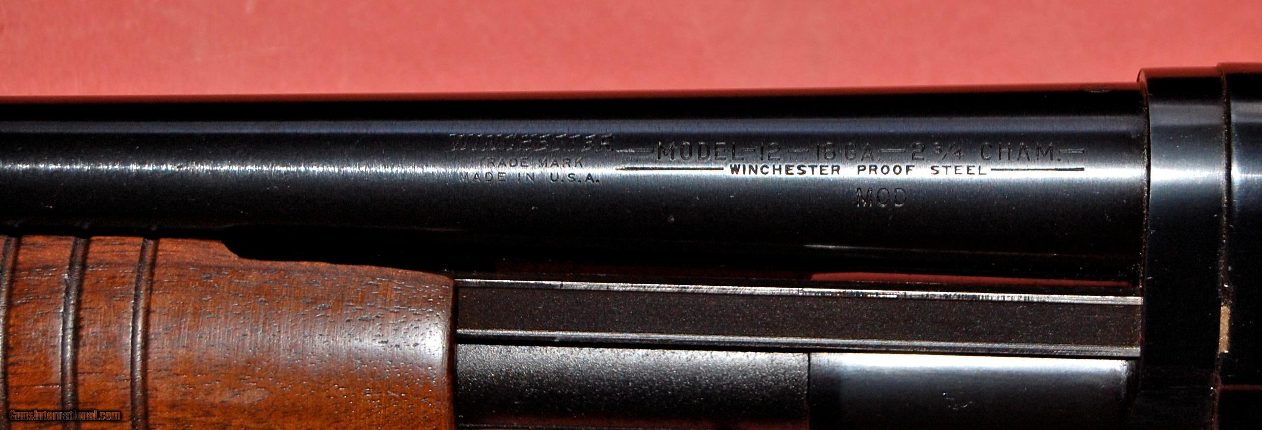 Description: Winchester pre 64 model 12 field grade in mint as new condition.Built in 1958,this gun retains 100% of the original blue and wood finish.It has a 28" plain barrel choked modified.The forend is the large semi beavertail that was used on the late 50s and 60s guns.All the roll marks and inspectors stamps are crisp and sharp.The gun retains the original Winchester buttplate.This is a classic model 12 in nearly new condition.C&R eligible. SOLD Curio/Relic: Yes Manufacturer: Winchester Model: 12 field Serial Number: 1677481 Chambers: 23/4 Metal Condition: mint Wood Condition: mint Bore Condition: mint Barrel Type: Winchester proof steel Action: pump Gauge Info: 16ga Manufacture Date: 1958 Chokes: modified |