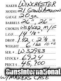 Description: Winchester 21 Grand American 20 gauge , with makers case SOLD Serial Number: W32983 Barrels: 26" 26 Stock Comb: 1 1/2 Stock Heel: 2 1/8" LOP: 14 1/8 Weight: 6lbs 10oz Chokes: WS1/WS2, M/F |