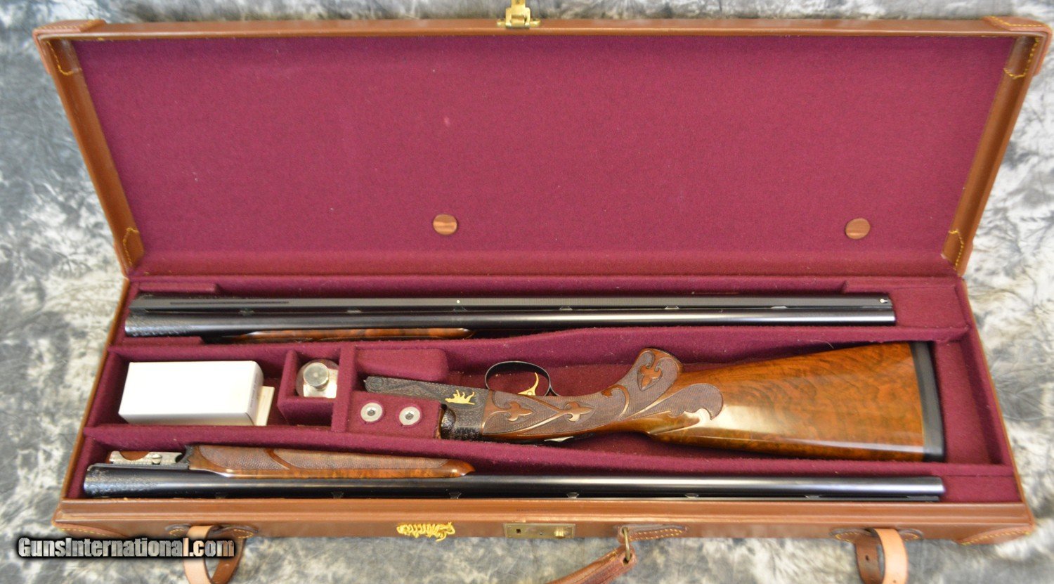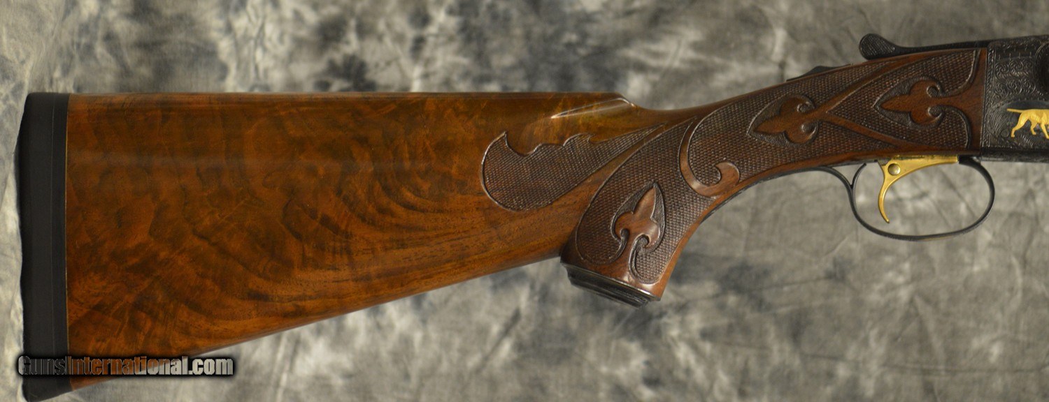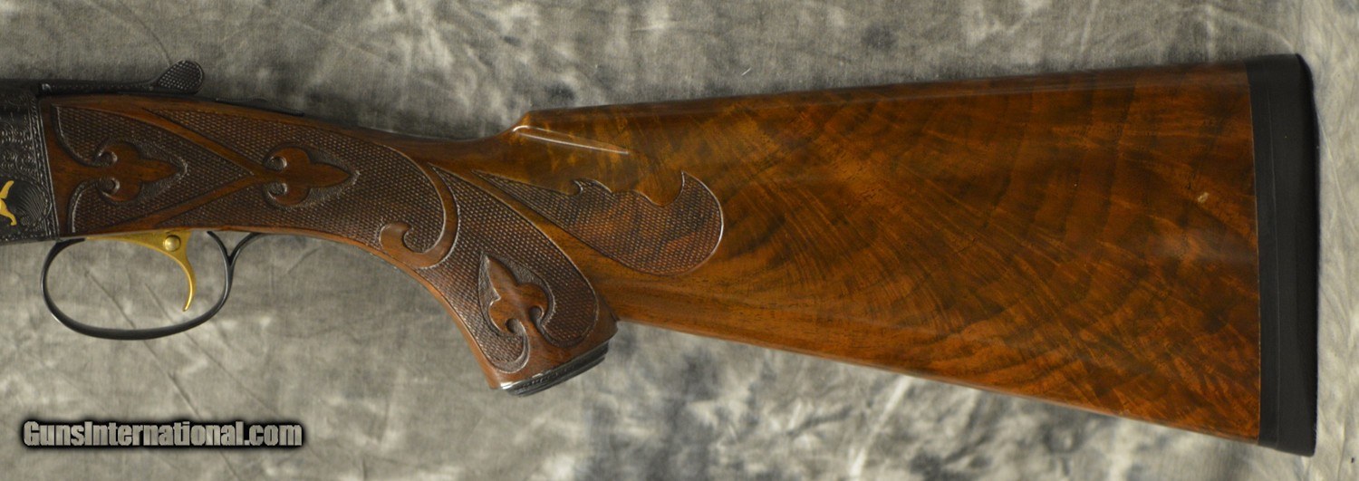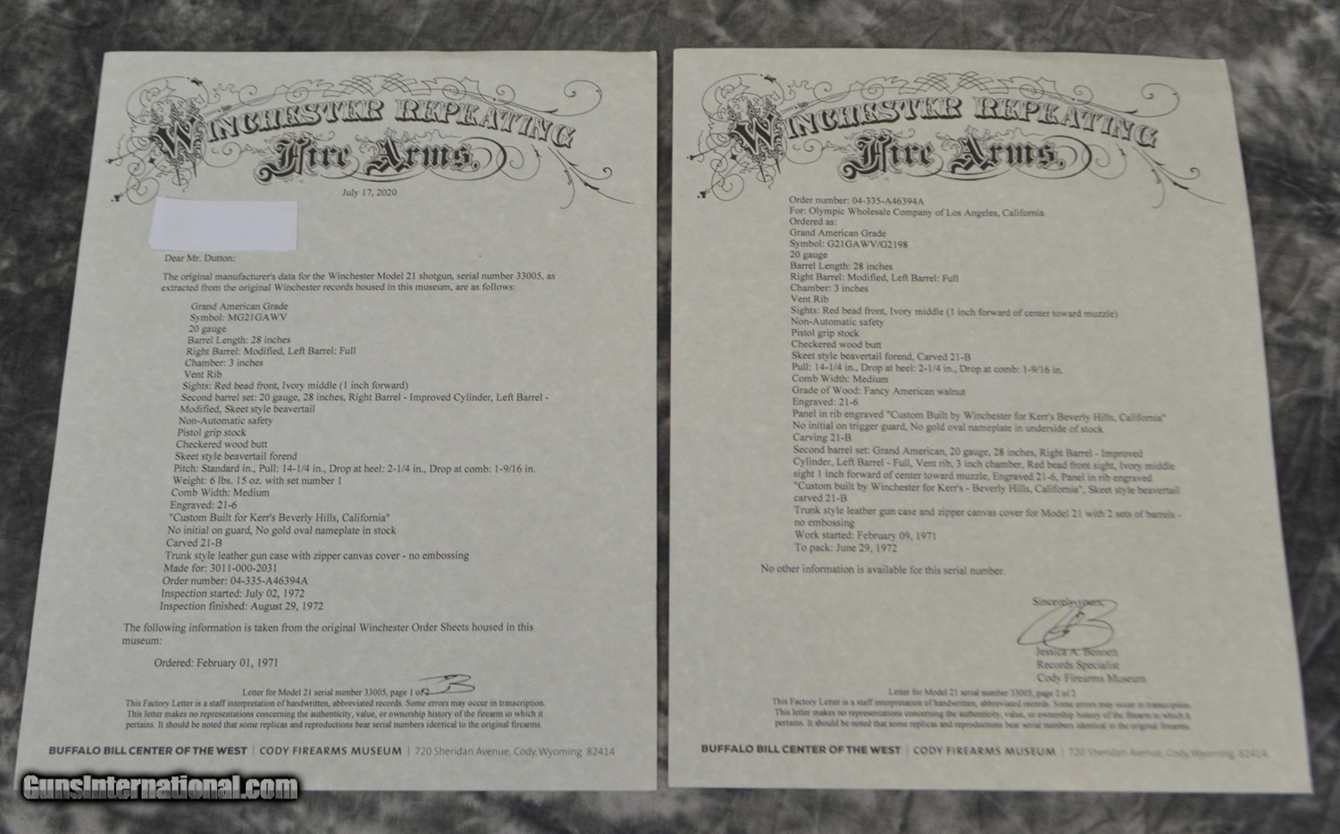 Description: Pre-Owned Winchester Model 21 Grand American 2 Barrel set 20GA/20GA with 28" fixed (MOD/FULL) and 28" fixed (IMP Cyl. / Full). Factory ventilated ribs marked "Custom Built for Kerr's Beverly Hills, California". Fully factory engraved "21-6" pattern featuring game scenes in gold and scroll engraving on flat sided receiver. Factory pistol grip stock with 21-B upgraded checkering featuring Fleur-Di-Lis and deep carving. Factory case, minor handling marks and minor signs of use, checkered butt has been replaced with a Pachmayr recoil pad. Features 3" chambers, selective single trigger. Factory original Grand American 2 Barrel set, includes letter confirming configuration from the Buffalo Bill/Cody Firearms Museum. Consignment, ineligible for trade-ins. SOLD Shotgun Gauge: 20 Gauge |