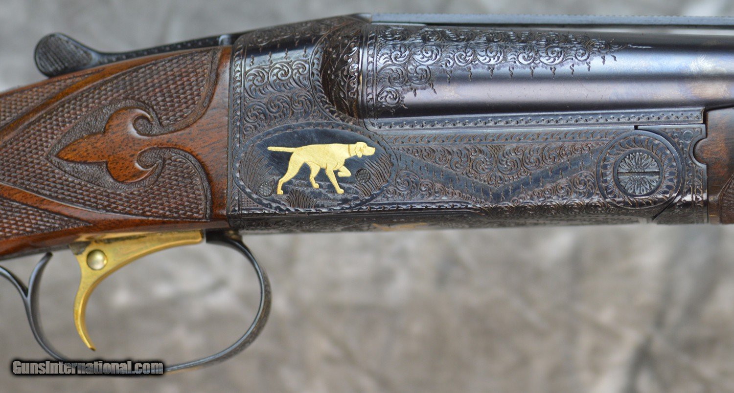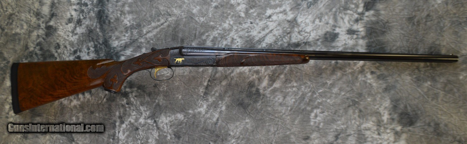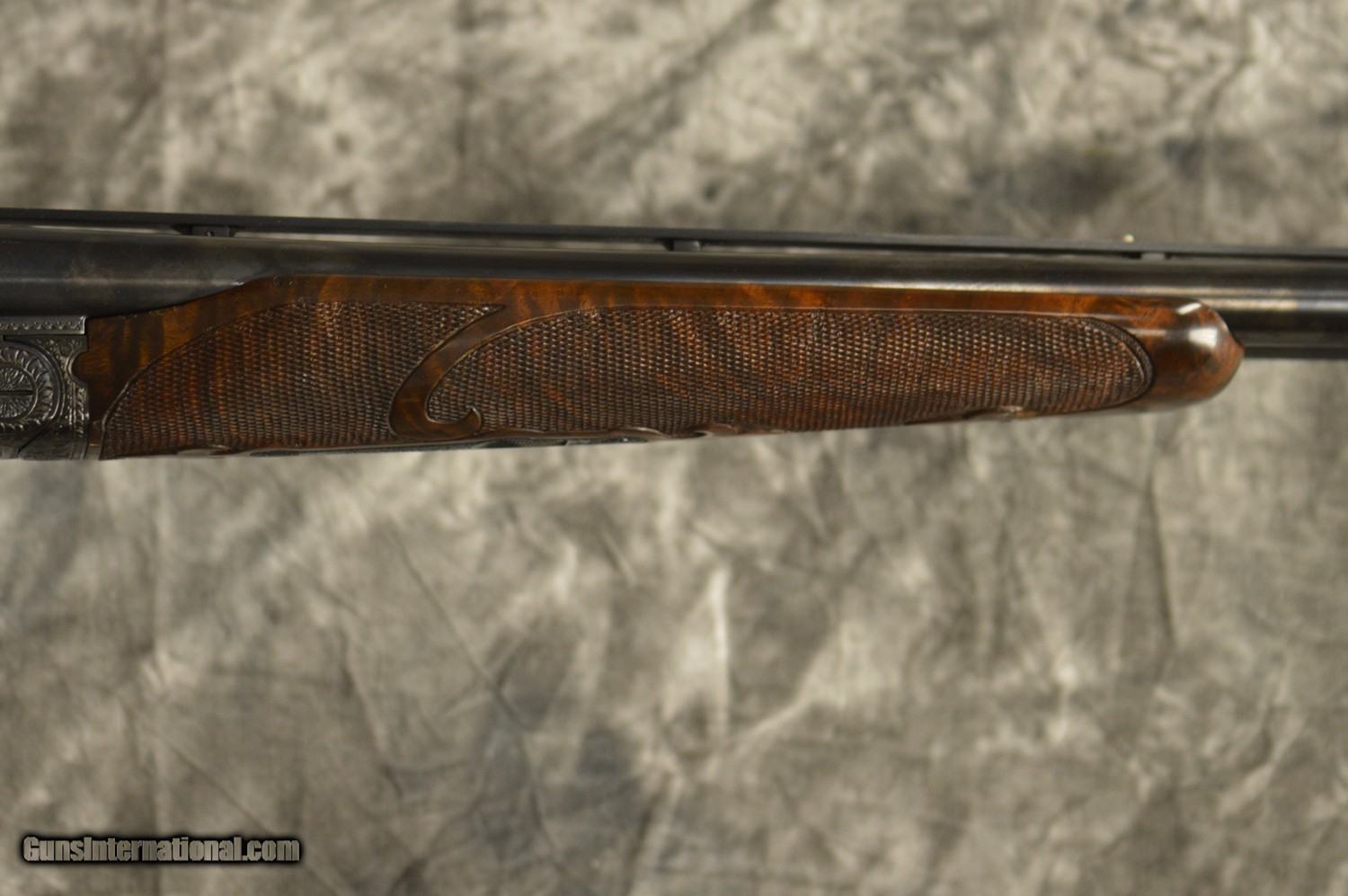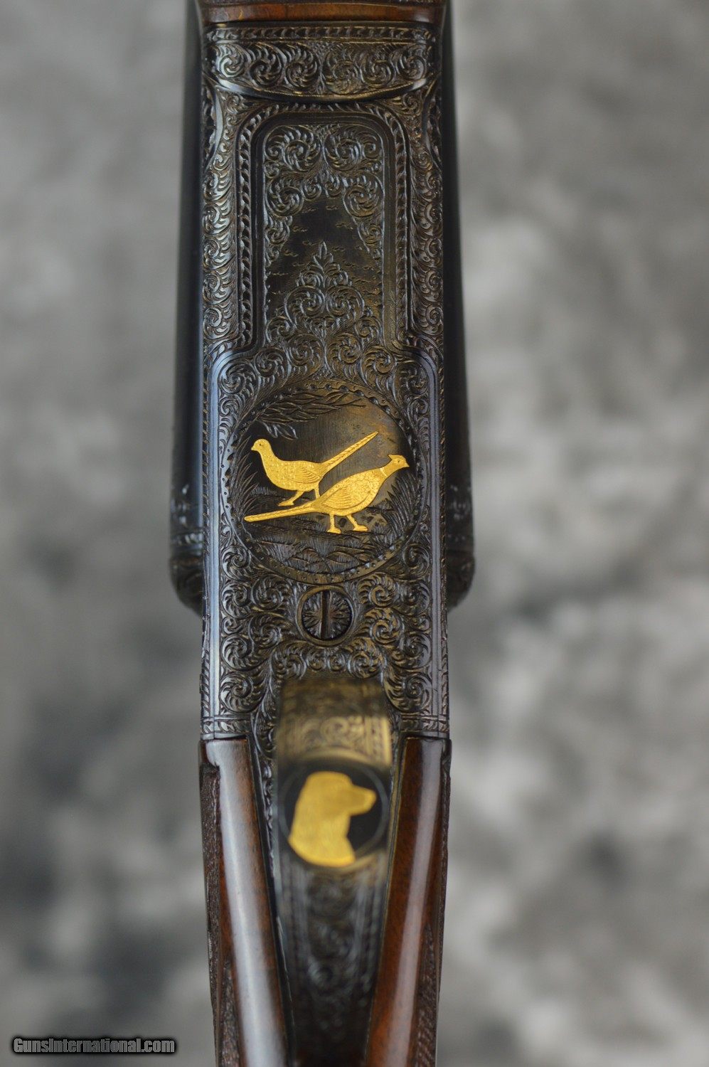 Description: Pre-Owned Winchester Model 21 Grand American 2 Barrel set 20GA/20GA with 28" fixed (MOD/FULL) and 28" fixed (IMP Cyl. / Full). Factory ventilated ribs marked "Custom Built for Kerr's Beverly Hills, California". Fully factory engraved "21-6" pattern featuring game scenes in gold and scroll engraving on flat sided receiver. Factory pistol grip stock with 21-B upgraded checkering featuring Fleur-Di-Lis and deep carving. Factory case, minor handling marks and minor signs of use, checkered butt has been replaced with a Pachmayr recoil pad. Features 3" chambers, selective single trigger. Factory original Grand American 2 Barrel set, includes letter confirming configuration from the Buffalo Bill/Cody Firearms Museum. Consignment, ineligible for trade-ins. SOLD Shotgun Gauge: 20 Gauge |