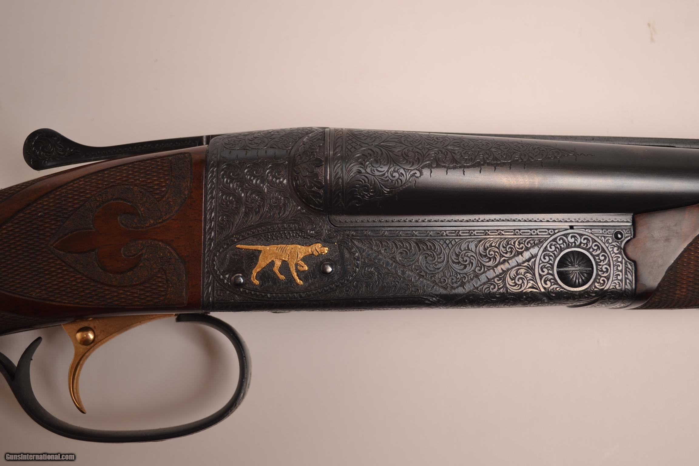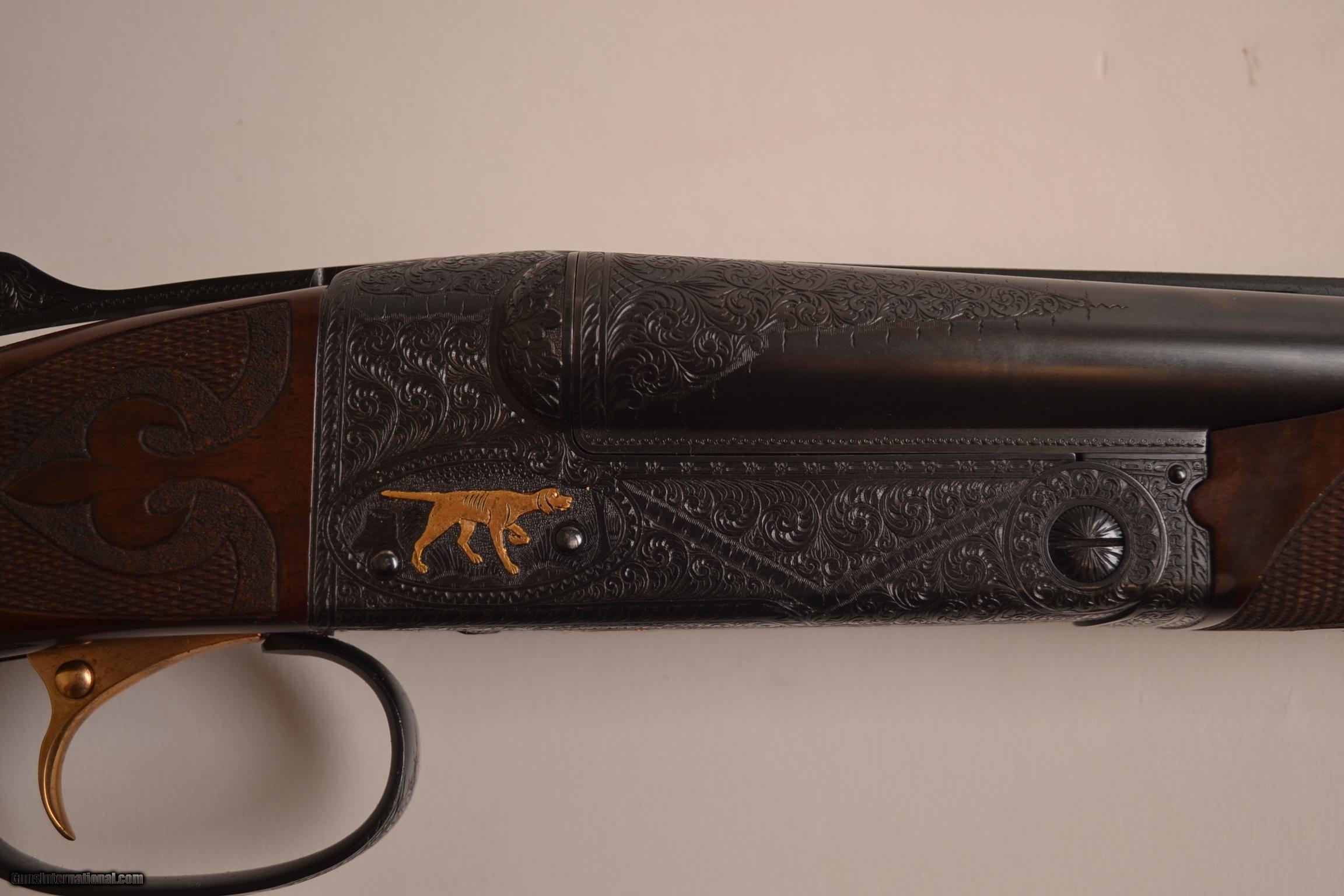 Description: Inv#: 30978 Winchester Model 21 Grand American, 28ga & .410. , 28ga. 28” IC/Mod and .410 28” IC/Mod, vent ribs on both sets of barrels, 2 beavertail forends with ebony tips, full fancy AAA Winchester cut metal capped pistol grip stock, checkered butt, GRAND AMERICAN engraved in gold on grip cap, gold single selective trigger, automatic ejectors, gold oval, checkered butt, b-carve checkering, marvelous Grand American engraving pattern with gold inlayed pointer, setter, pheasants and lab bust surrounded by full coverage Grand American scroll engraving, ribs marked CUSTOM BUILT BY WINCHESTER, flat side round frame, lightening cuts in receiver, jeweled flats, fully cased, available for immediate delivery, call for special price. Inv# 30978 P.O.R. SOLD |