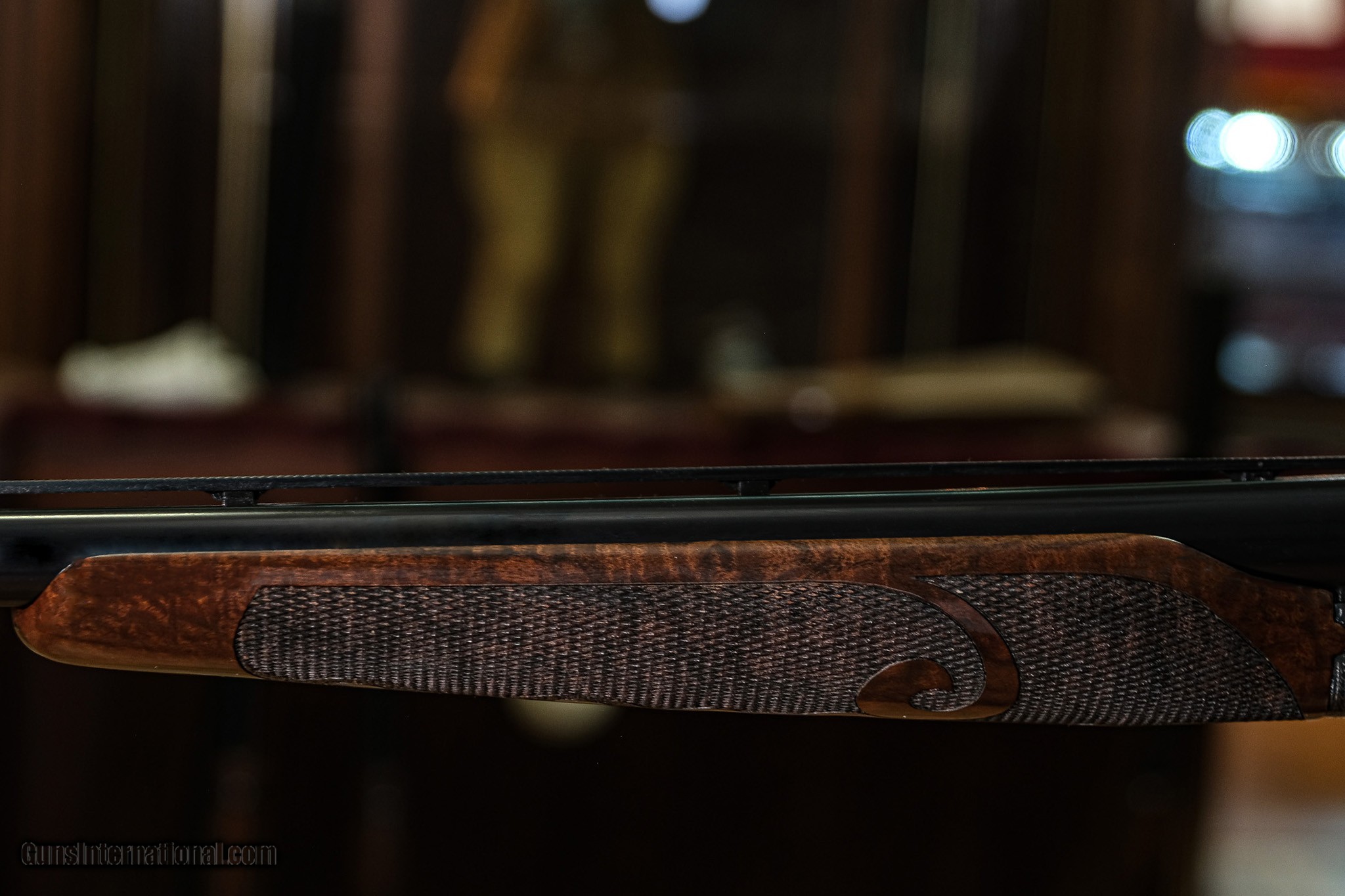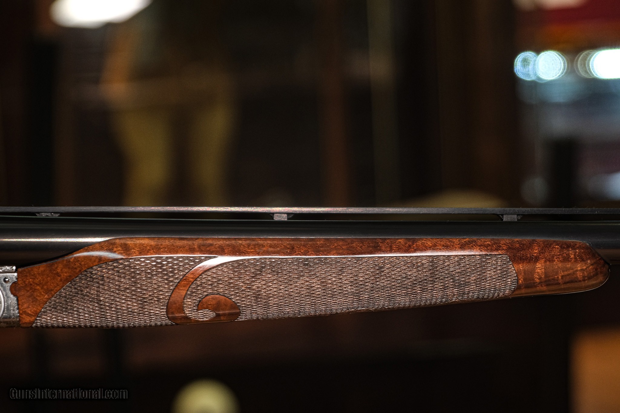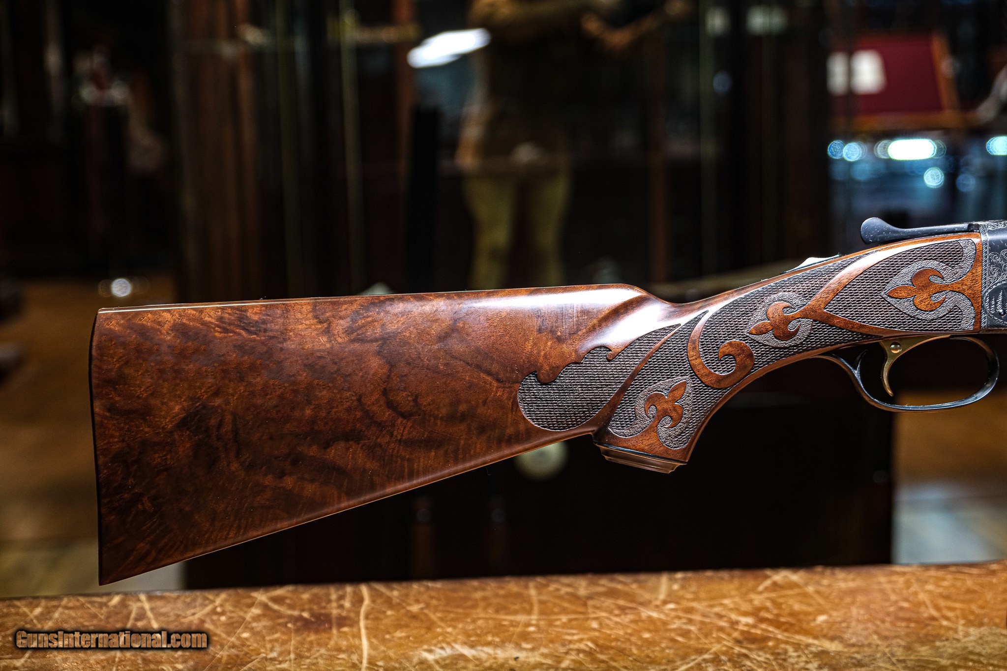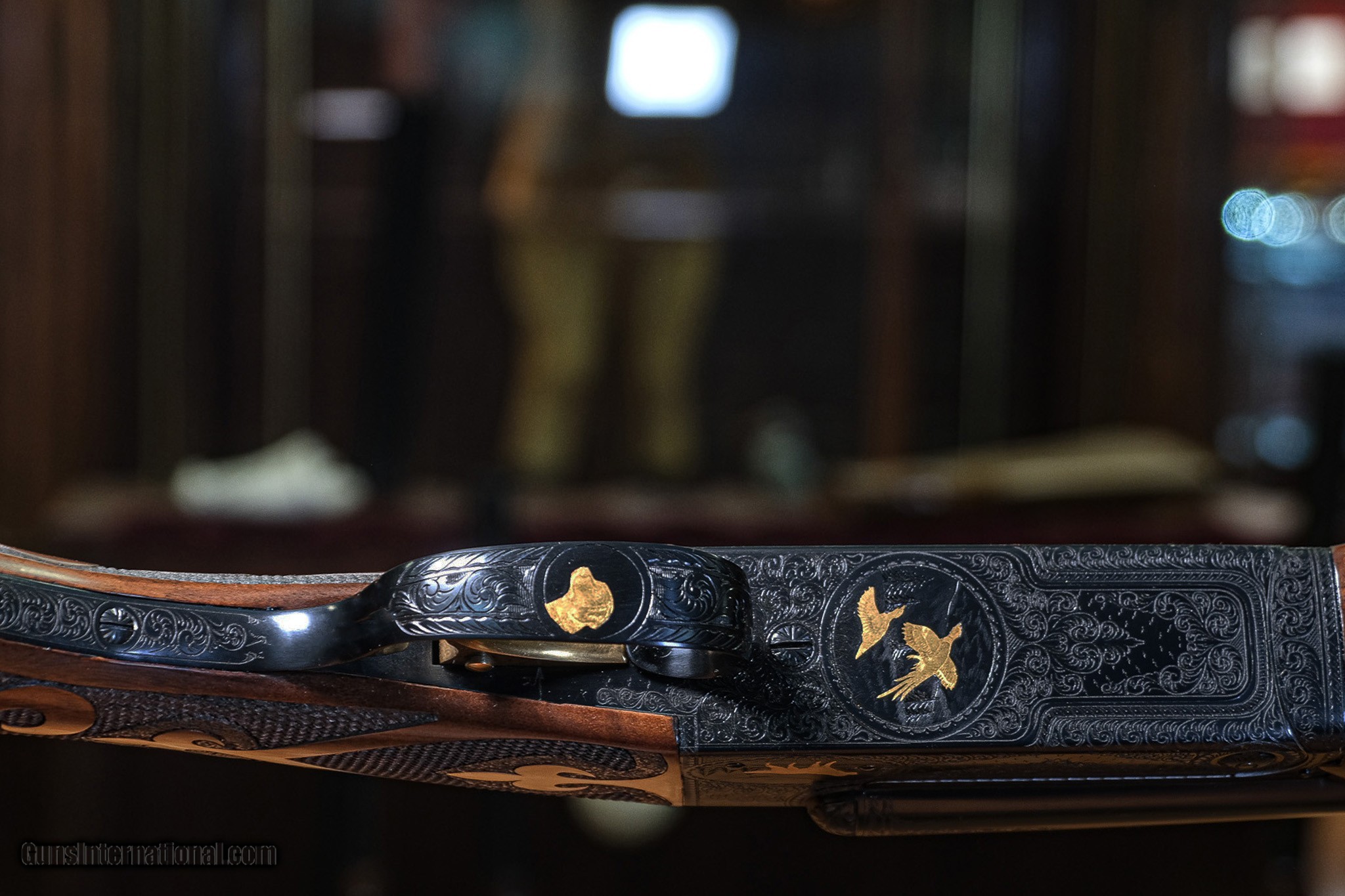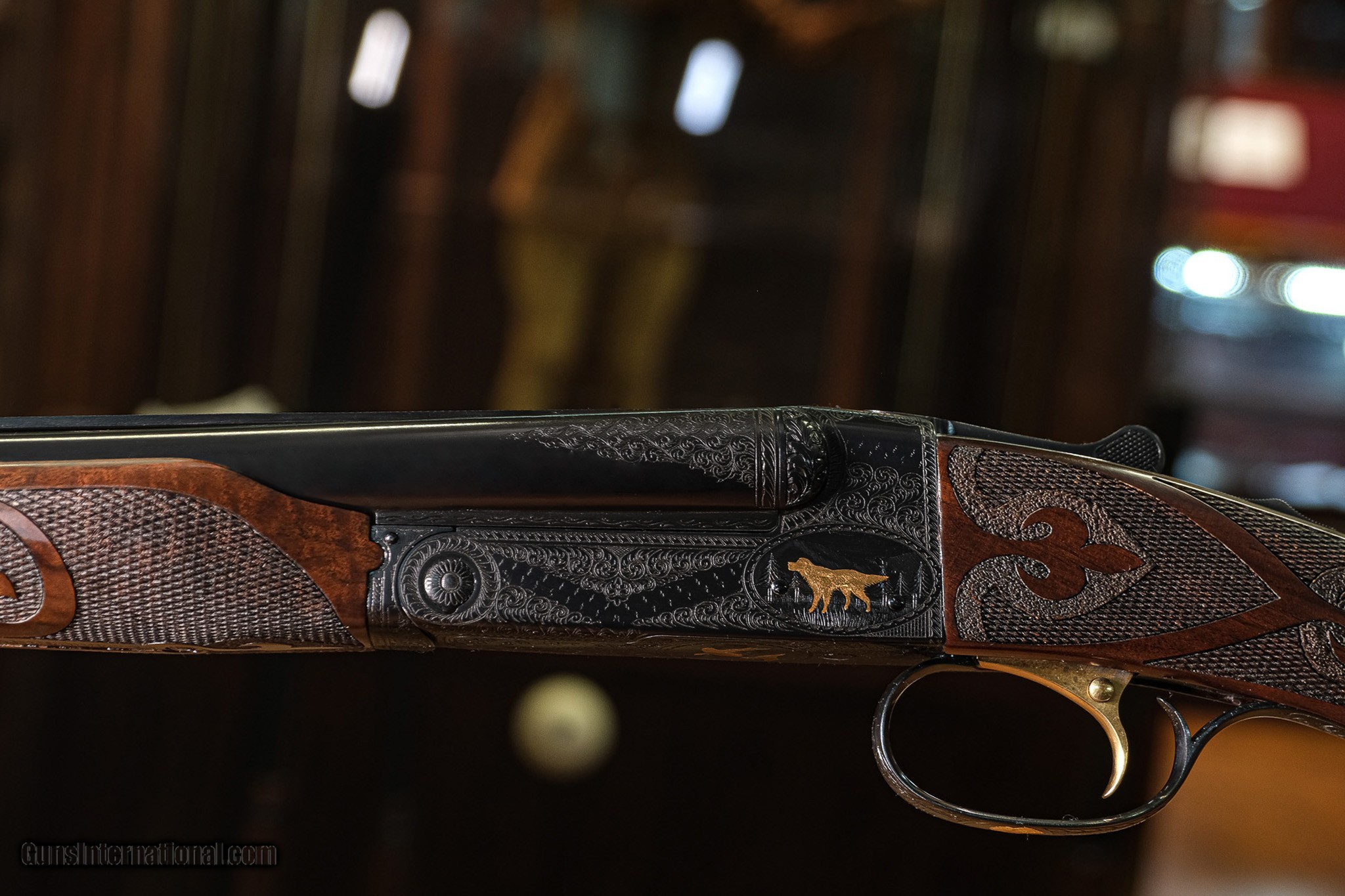 Description: Winchester - Model 21, SxS, Grand American, Three Barrel Set, 20ga/28ga/.410. 30" Barrels Choked IC/M. We just received this gun from a long-standing collector needing to settle an estate. It has the original box and shipping paperwork. Engraved by Nick Kusmit. Gold inlay of setter on the left, pointer on the right, pheasant on the bottom, lab on the trigger guard all surround by the most detailed scroll. Capped pistol grip, checkered butt, highest figured black walnut that Winchester had available. Has three beavertail forends that are B carved with black tips. The stock is B carved, gold single selective trigger, automatic ejectors, FACTORY VENT RIB MARKED CUSTOM BUILT BY WINCHESTER. Jeweled water table, barrel flats and forend iron. This set is simply superb and ultra rare being 30-inch barrels on all three barrels. This outstanding gun is unfired and new. Similar sets have been sold for over $60,000. Lifetime warranty courtesy of Connecticut Shotgun. Inv: 85983 6 lbs. 14 oz. (with 20ga barrels) 14 ¼" x 1 ½" x 2 ¼" $38,500.00 CT Shotgun/Galazan buys sells and trades the world’s largest inventory on Model 21 shotguns. we are experts in all phases of buying, selling, and repairing as well as restoration of these very complex guns we have handled more Model 21 in all regards than all other companies put together. we have bought sold and manufactured most of the Grand Royal and Grand American grade guns and we understand them intimately. In 1994, Galazan/CT Shotgun purchased the Winchester Custom Shop from U.S. Repeating Arms Company and at that time designated the sole manufacturer and authorized repair for the Model 21, we purchased all of the inventory machining tooling and highly regarded trade secrets in regards to manufacturing and repairing maintaining these intricate shotguns. CT Shotgun/Galazan continues to perform the only authorized factory service on all these fine guns if you are interested in purchasing repairing or altering a Model 21 we should be your sole source when it comes to a Model 21 every gun we sell is serviced and inspected, comes with our lifetime warranty. CT/Galazan also has all assorted accessories, original style cases and recoil pads. WHY BUY A MODEL 21? 1. No one knows the gun better than us. 2. We are the only authorized repair facility for Model 21s. 3. We build the new Winchester Model 21. 4. We build the CSMC Model 21. 5. Every gun receives a safety inspection before sold to a customer. 6. Most guns are detailed, cleaned & lubricated and any parts charged to make them as factory new. 7. Fair honesty, reputable dealing for over 20 years. 8. Very competitive pricing. If you compare our guns to any other gun on the market, you will find in most instance that our guns are the best value. The best are brought up to factory specs which, in some cases, can be more than the gun. 9. The largest collection of Model 21s in the world. 10. With any Model 21 SxS you buy from us; we offer a lifetime mechanical warranty. SOLD |