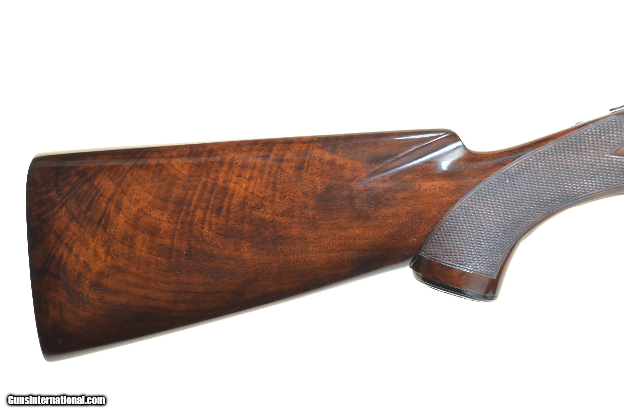 Description: Winchester Model 21 12ga. 2 barrel set, 26” barrels choked WS1/WS2 and 32” 3” magnum barrels choked Full/Full. Factory Duck Grade stamped on the bottom of frame, matte rib, capped pistol grip, kidney style checkering, 1 forend, 2 barrels, 14 1/2” LOP to a checkered butt. Great feather crotch wood, 99% as new with a lifetime warranty for Connecticut Shotgun. Inventory # - 30150 7 lb.12 oz. 14” x 1 1/2” x 2 3/8” $7995 SOLD |