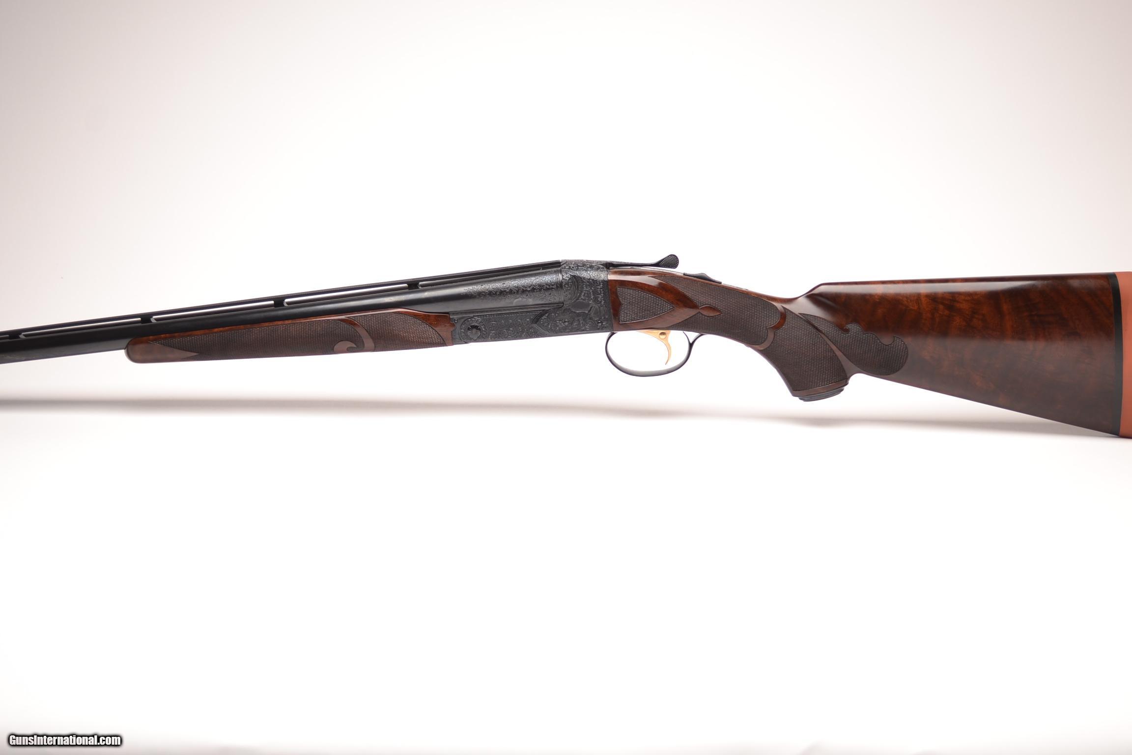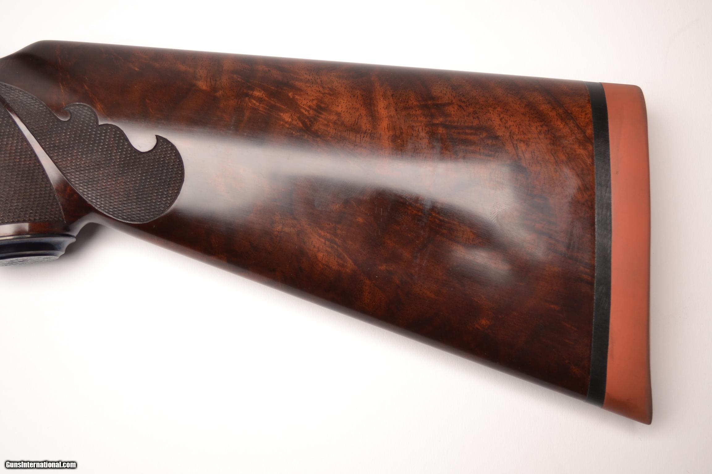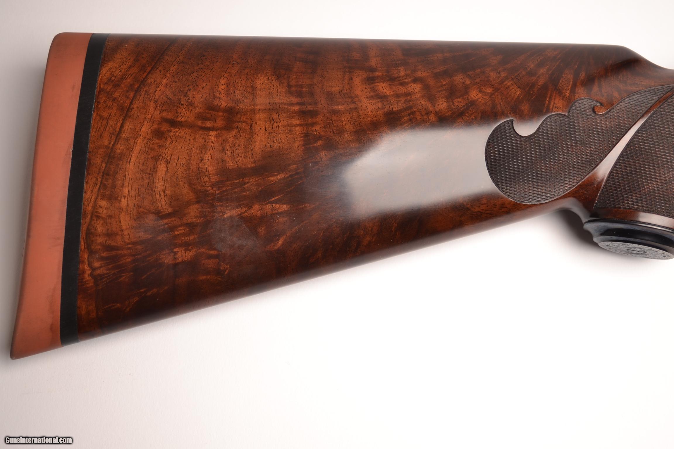 Description: Winchester Model 21, 20/20ga. Factory lettered #6, 2 barrel set, 28” F/M and 28” WS1/WS2. Factory vent rib, marked “Custom Built by Winchester for Kerrs”, Kerrs sports shop of Beverly Hill, CA. Full factory documentation with Cody letter and all manufacturing copies. This unbelievable gun features a single selective trigger, auto ejector, 2 beavertail forends and a very deeply chiseled #6 engraving. Built in 1947 and shipped in 1948. Marked finished in deluxe, factory Winchester pad, pistol grip. Highly figured feather crotch, jeweled barrel flats and forend iron. Remains new and unfired. Inventory # 38762 Price - $38,995 SOLD |