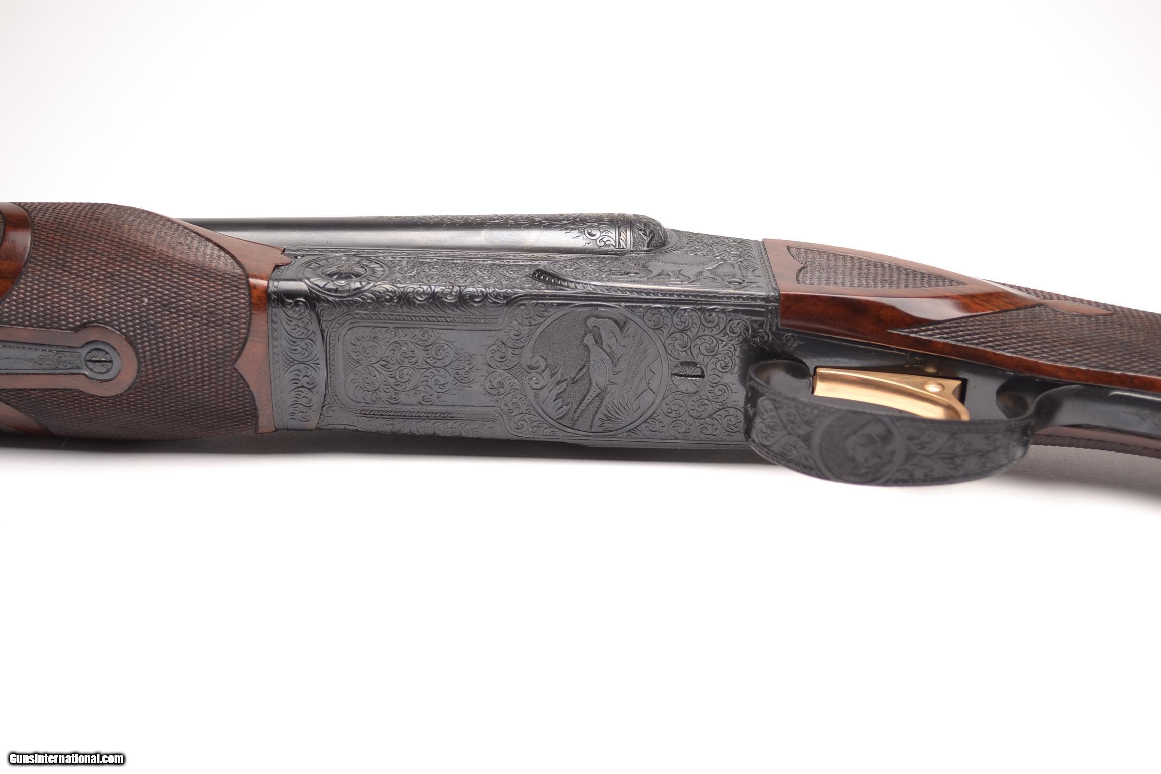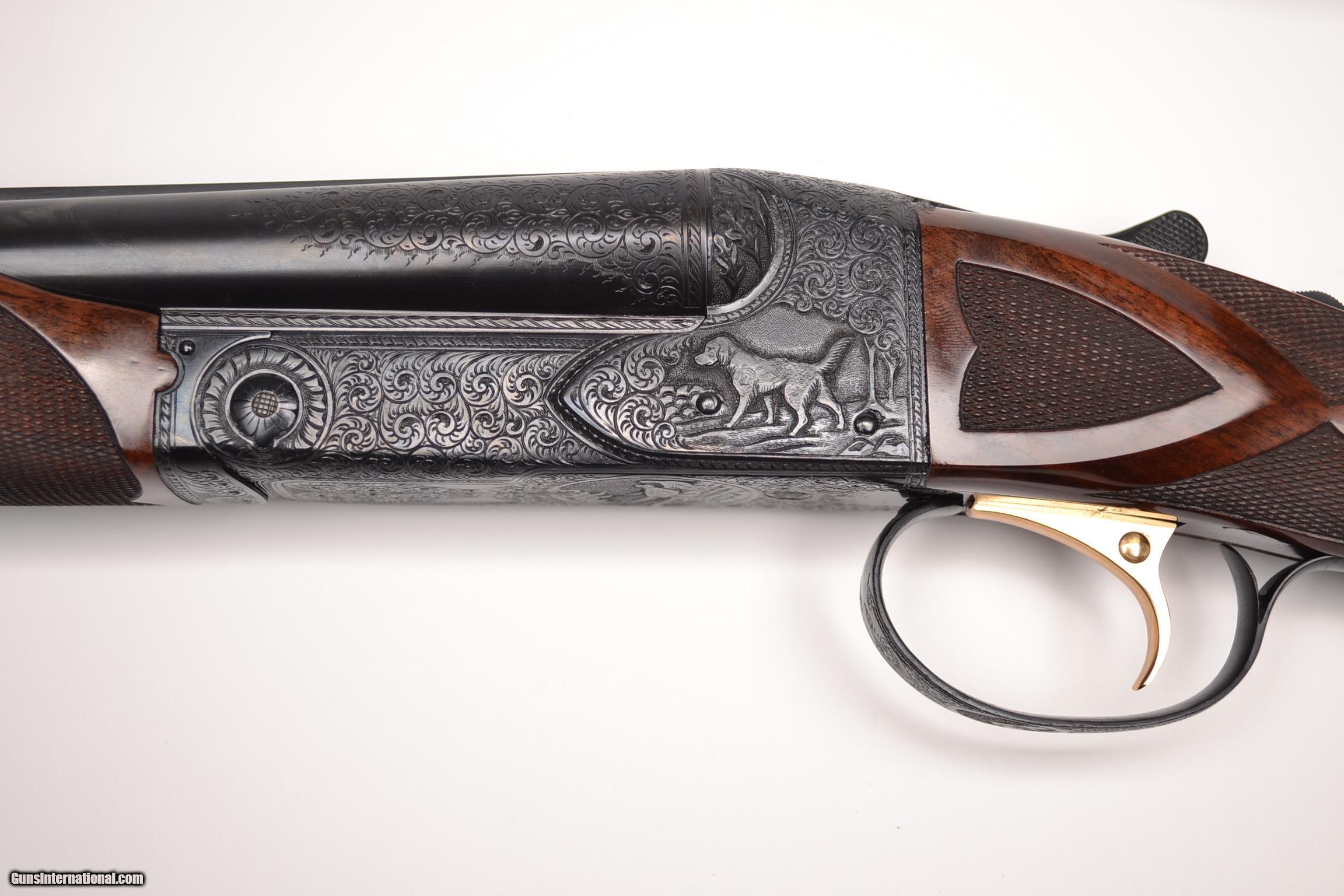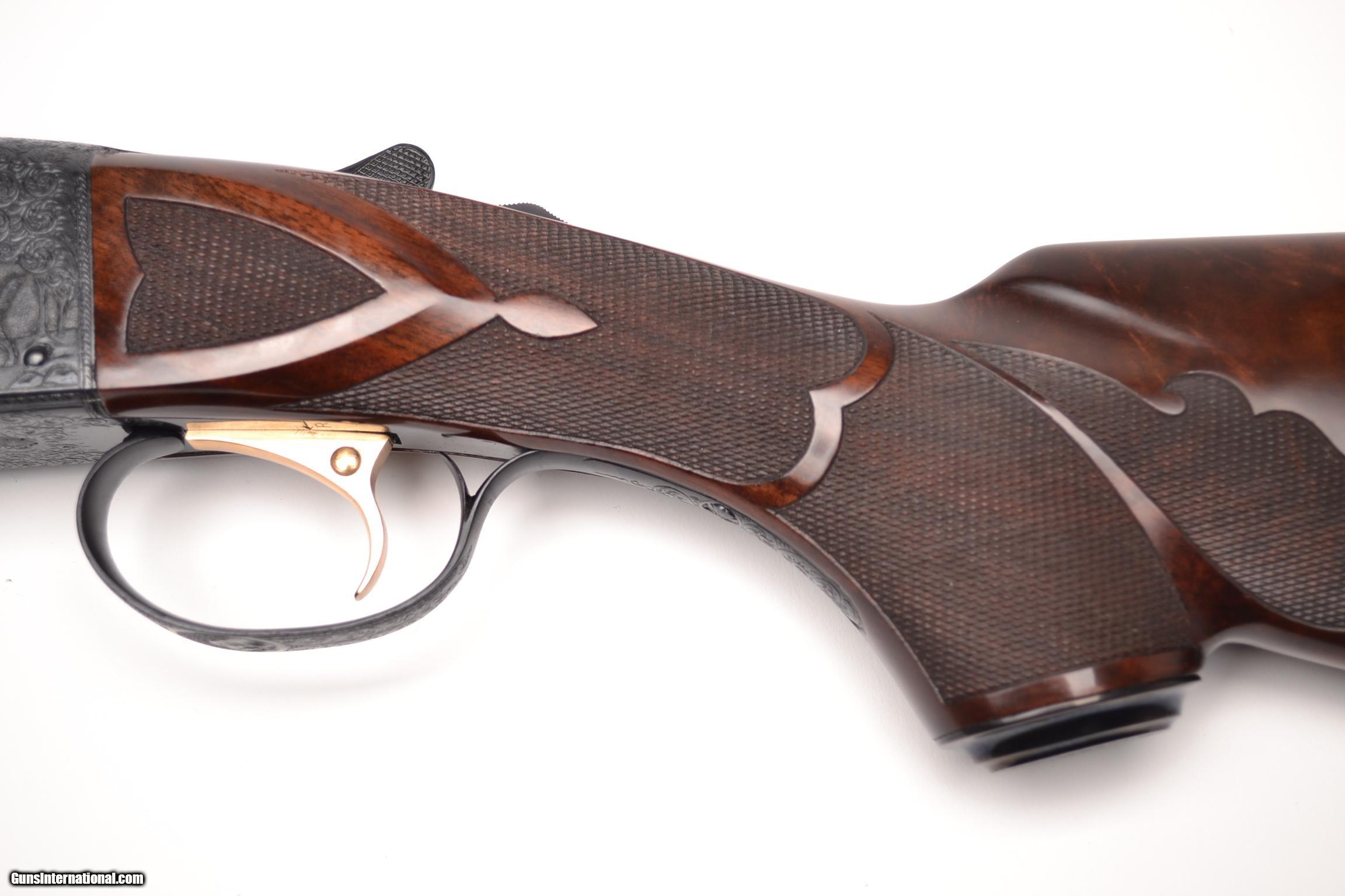 Description: Winchester Model 21, 20/20ga. Factory lettered #6, 2 barrel set, 28” F/M and 28” WS1/WS2. Factory vent rib, marked “Custom Built by Winchester for Kerrs”, Kerrs sports shop of Beverly Hill, CA. Full factory documentation with Cody letter and all manufacturing copies. This unbelievable gun features a single selective trigger, auto ejector, 2 beavertail forends and a very deeply chiseled #6 engraving. Built in 1947 and shipped in 1948. Marked finished in deluxe, factory Winchester pad, pistol grip. Highly figured feather crotch, jeweled barrel flats and forend iron. Remains new and unfired. Inventory # 38762 Price - $38,995 SOLD |