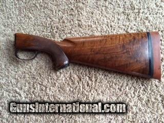 Description: Original 12 Ga M21 Buttstock and trigger guard. Similar to the one pictured on page 118 in Ned Schwings book. Highly figured and in super condition. 15 3/8 from front of wood to 1" Silvers pad with a tapered 1 1/8 - 1 1/4 spacer. Would finish to 14 1/4 - 14/3/8. SOLD |