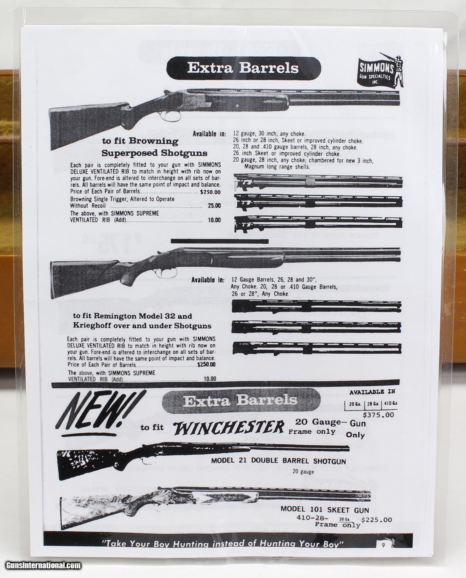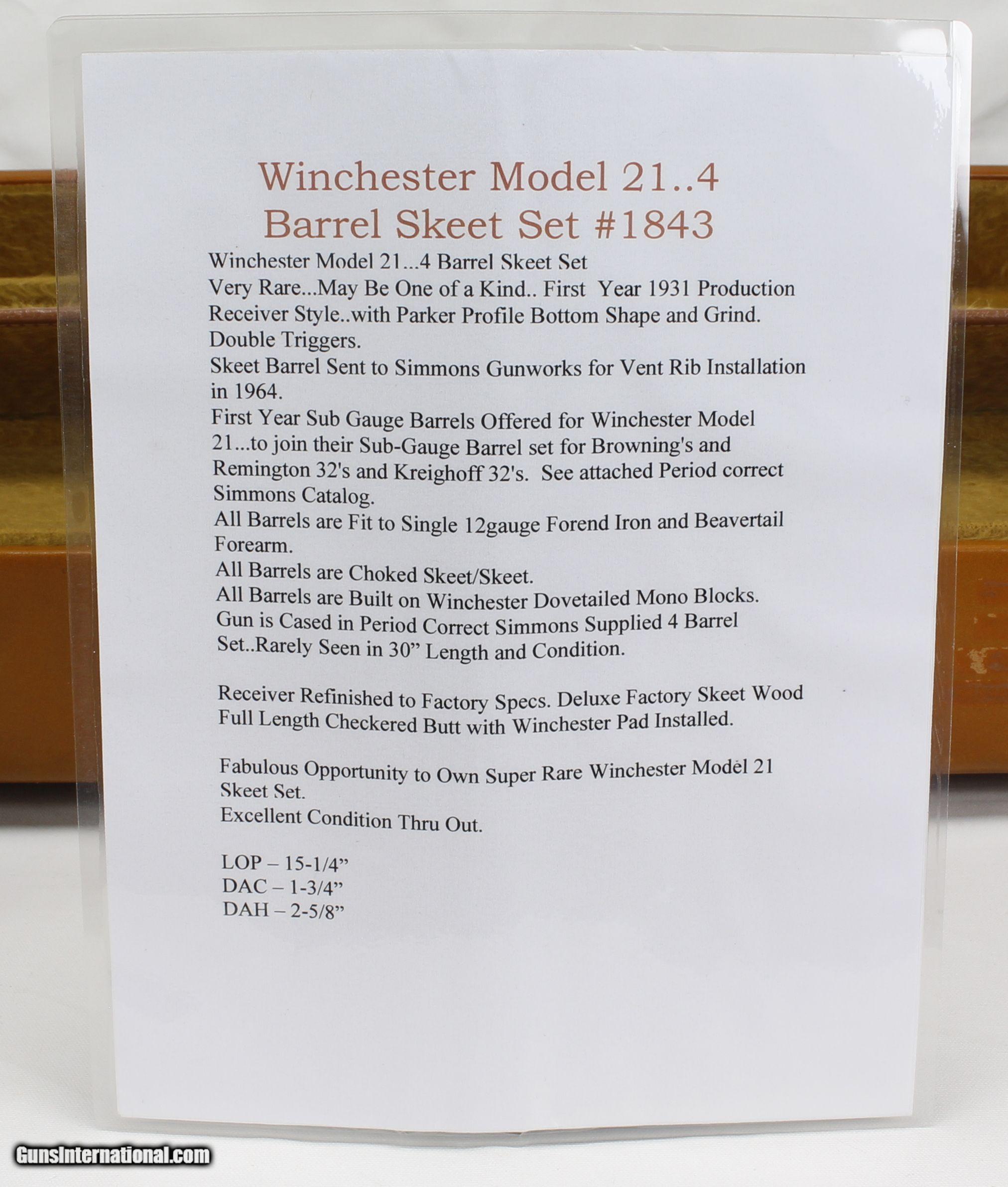 Description: WINCHESTER MODEL 21, PICTURES FOR LISTING # 101012153, 12GA, CHOKED: WS1 & WS2, ALL OTHER BARRELS CHOKED: SK & SK. REFER TO LISTING # 101012153, ALL EJECTOR BARRELS, ALL IN TIME. SOLD Manufacturer: WINCHESTER Model: 21 Serial Number: N/A Caliber Info: 12/20/28 & 410 Barrels: 26 |