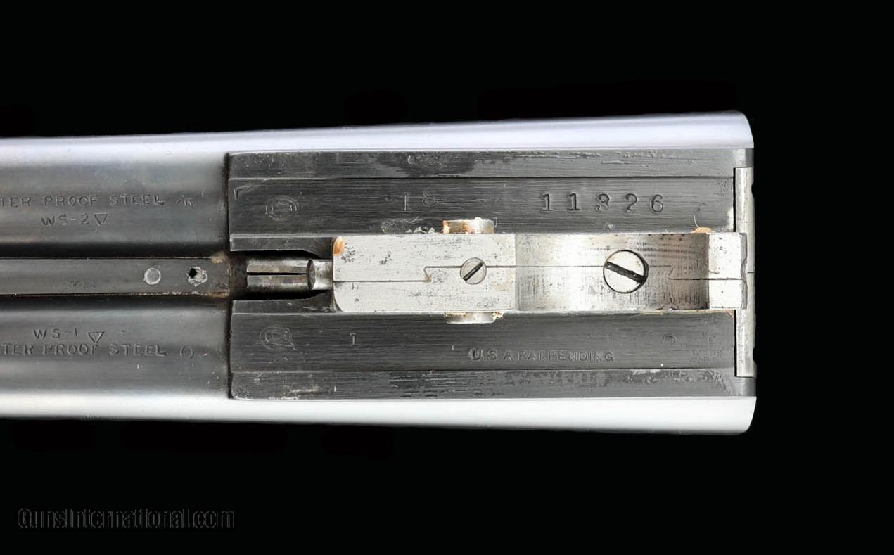 Description: A really good high condition Winchester Model 21 Skeet Grade 20ga gun built with 26" barrels with concave top rib. Beavertail forend is kidney bean checkered. Blued receiver stamped "SKEET" on trigger plate. Capped pistol grip buttstock is nicely figured as seen in the photos and terminates with a proper Winchester brand recoil pad. Gun remains in near mint overall condition. Retains virtually finishes to wood and metal surfaces. Bores are brilliant and shiny. Mechanics are excellent. Gun is nice and tight! This fine 21 is priced at $7795 plus shipping to your FFL. Please dont hesitate to contact me with any questions or reasonable offers at (704) 280-2382 or via PM on this site. SOLD Curio/Relic: Yes Shotgun Gauge: 20 Gauge Manufacturer: Winchester Model: Model 21 Serial Number: 11326 Barrel Length: 26 Chambers: 2-3/4 Ejectors: Yes Condition: Excellent Metal Condition: Excellent Wood Condition: Excellent Bore Condition: Brilliant and shiny Triggers: SST Stock Comb: 1-1/2 Stock Heel: 2-1/4 Butt Pad: Winchester brand solid red pad LOP: 14 Weight: 6lbs. 10oz. Chokes: WS1/WS2 Minimum Wall Thickness Left: Over .025 Minimum Wall Thickness Right: Over .025 |