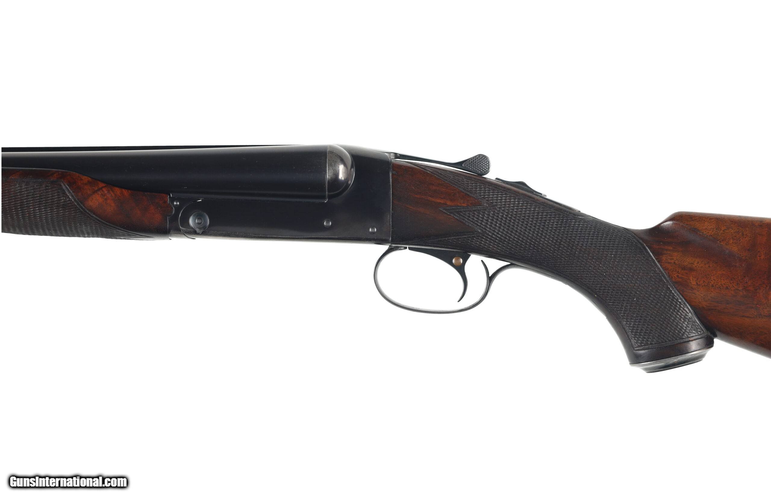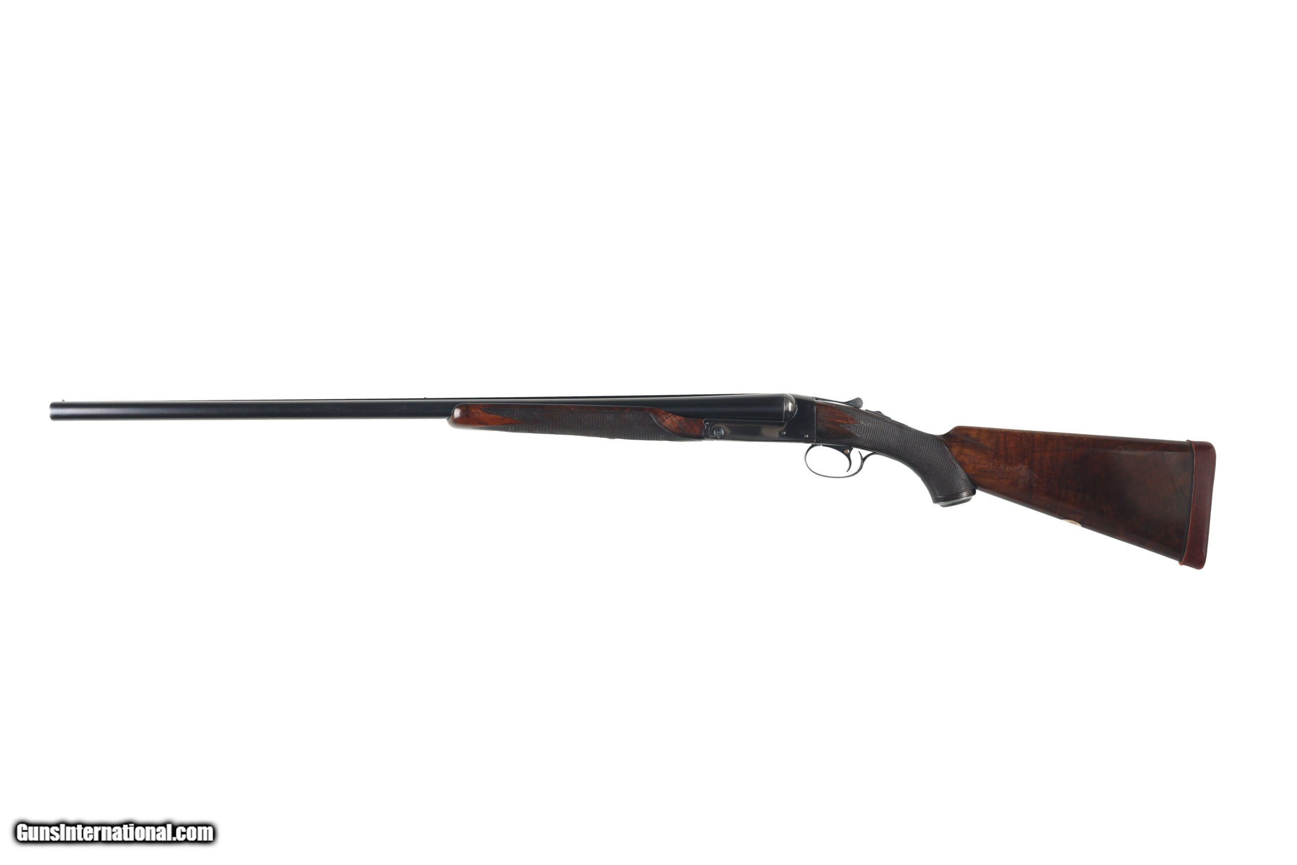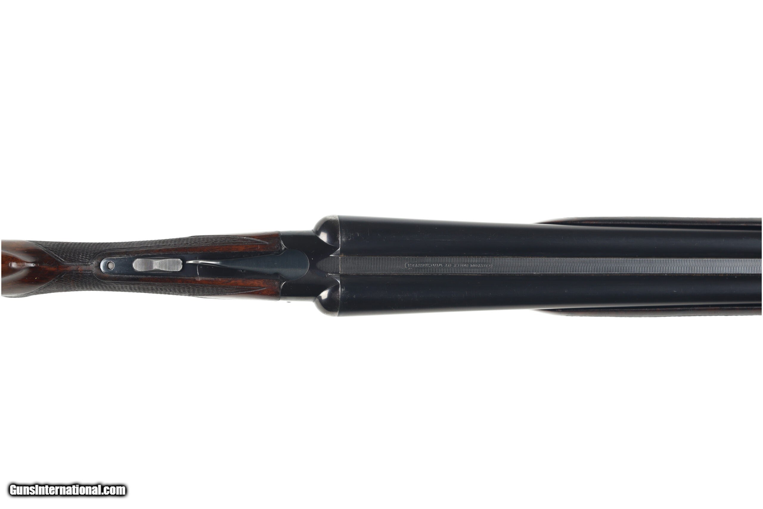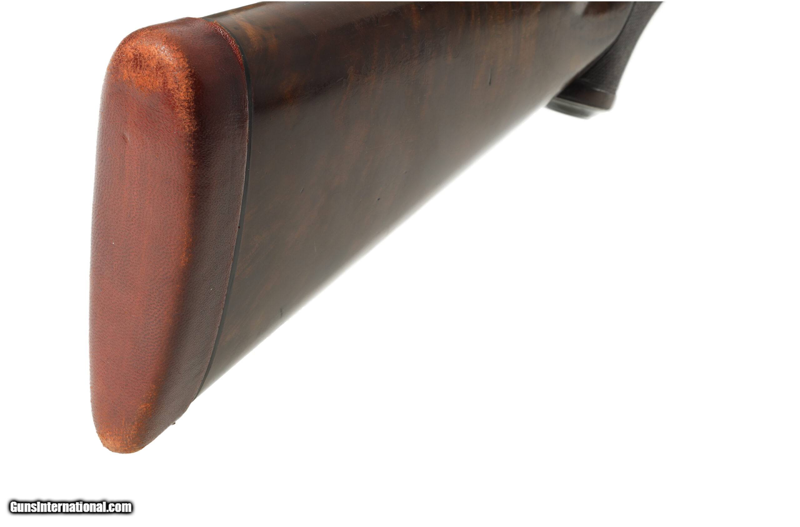 Description: The Winchester Model 21 is perhaps one of the finest side by side shotguns ever designed. This example is of a later generation, which is very difficult to determine the age of, likely being built by the Winchester custom shop. It is fitted with 30" barrels which are choked quite tightly, as well as the addition of a beavertail forend and relatively high comb stock, leads to the belief that this gun was intended for trap competition. Nevertheless, this shotgun is in good to very good overall condition, with the metal parts retaining much of the original finish and the stocks looking to have been refinished or at least re oiled. Manufactured in: USA Hand: Right Hand Action Finish: Blue Metal Finish: Original Barrel Length: 30 Inches Barrel Condition: Very Good Stock Finish: Refinished Stock Condition: Good Type of Butt: Leather Covered Pad Pad Thickness: 1 Inch Grip: Pistol Forend: Checkered Beavertail Cast Amount: 1/8" SOLD Manufacturer: Winchester Model: 21 Chambers: 2 3/4 Ejectors: Yes Condition: Preowned Metal Condition: Very Good Action: Side by Side Triggers: Single Selective Gauge Info: 12 Gauge Stock Comb: 1 3/8 Stock Heel: 2 1/8 Stock Cast: Off Fore End: Checkered Beavertail Butt Pad: 1 Inch LOP: 14 7/8 Rib: Flat Matte Finish: Original Weight: 7.8 lbs Chokes: IM/F Case: Leather Motor Case |
