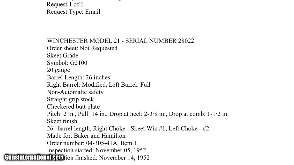 Description: Nice little Winchester bird gun. Model 21-20ga. Has been refinished and Briley choke tubes added. Single trigger. Early gun. Tight lock up. If it wasn't refinished it would be in the $8-10k range. Letter shows all special order features. SOLD Curio/Relic: Yes |