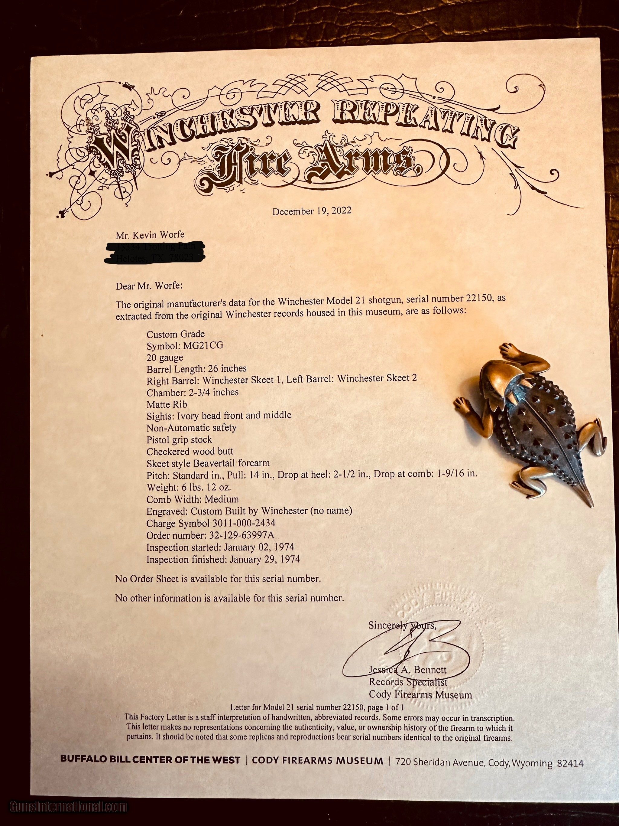 Description: Winchester Model 21–#1 - 20ga - 26” - All Original - Cody Letter 100% - WS1/WS2 - Checkered Butt - Beavertail - Deluxe Checkering - Personal Shotgun recently shot at Joshua Creek Ranch Pheasant Drive - I have circled some areas that show the original finish exhibiting some "Winchester Crazing" the forend also shows some field evidence - otherwise, this gun is "RIGHT" - SEE CODY LETTER FOR SPECS Quillen & Worfe Fine Guns Disclosures and Important Information: