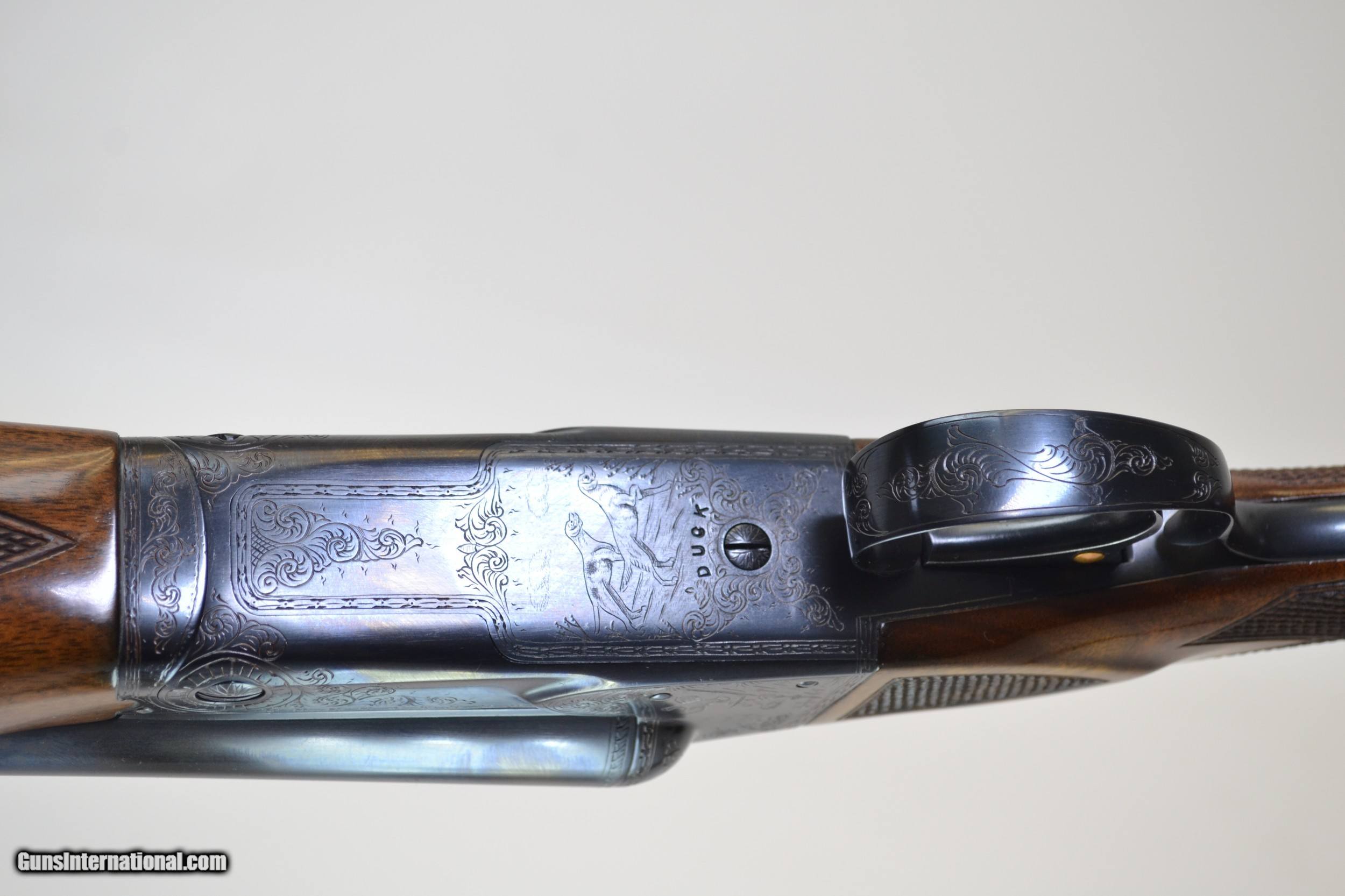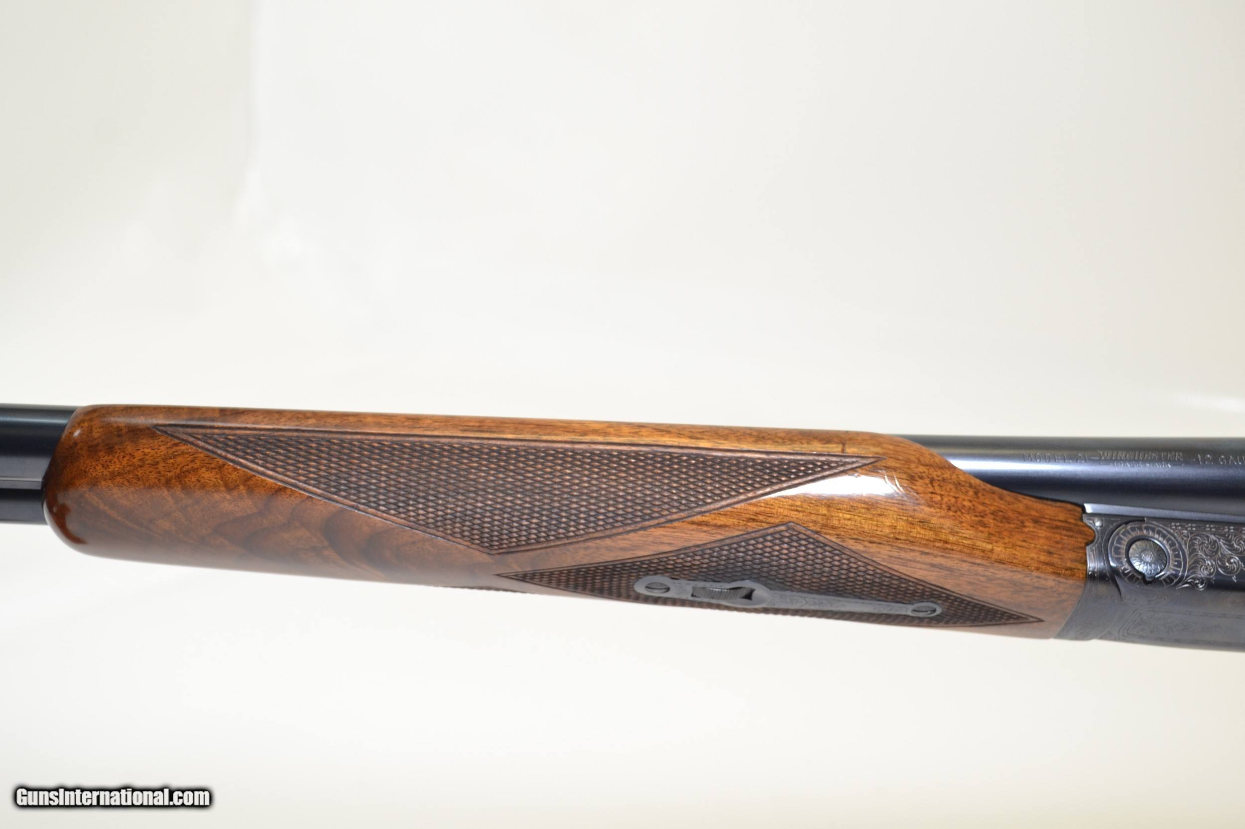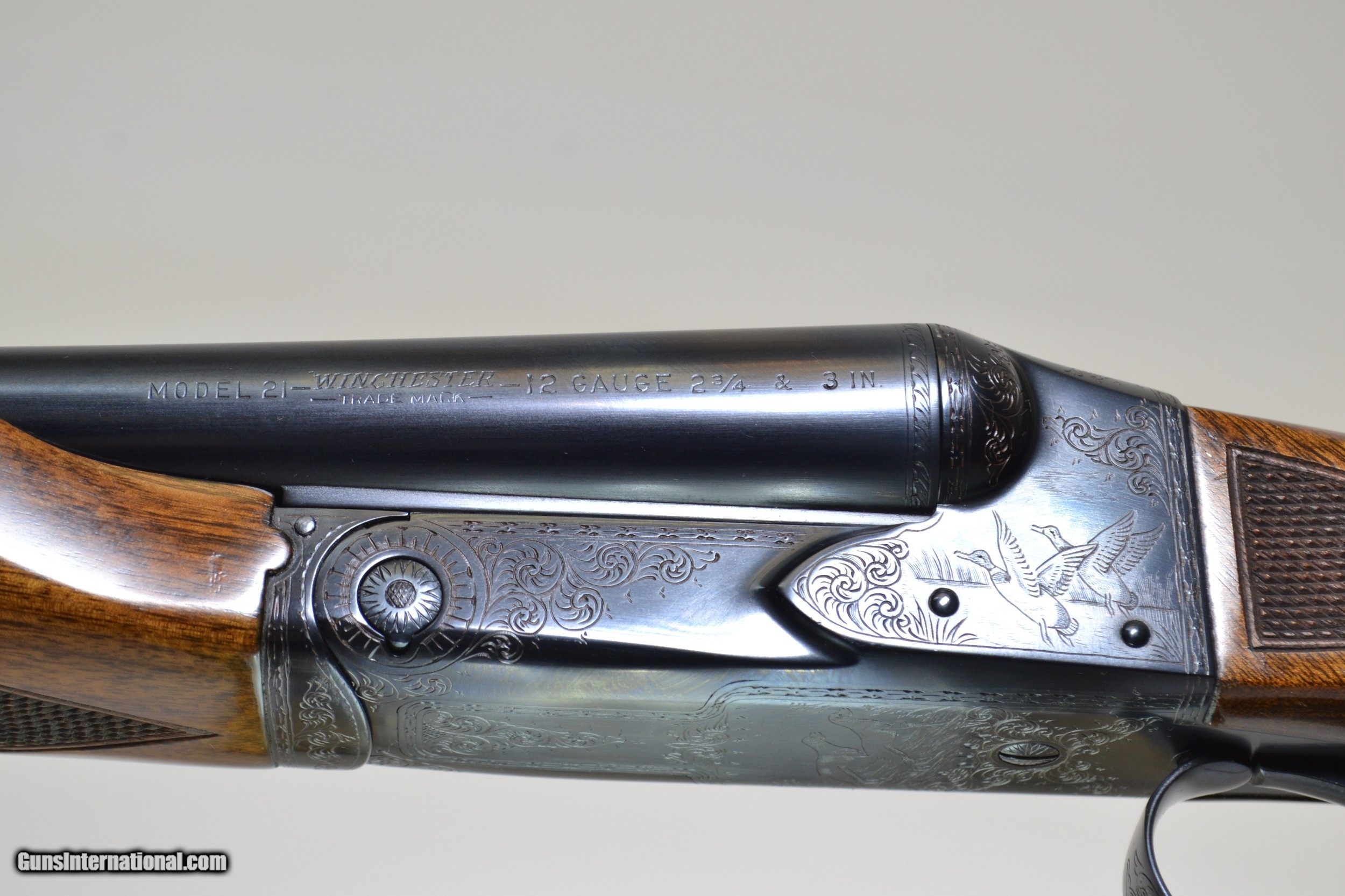 Description: WINCHESTER –Model 21, 12ga, 32” choked F/F, 3” chamber, nicely figured pistol grip stock, solid rib, factory Winchester recoil pad, single selective trigger, checkered side panels, beavertail forend with diamond pattern checkering, auto ejectors, #4 engraving pattern, extra clean and tight in excellent condition throughout, available for immediate delivery.