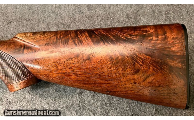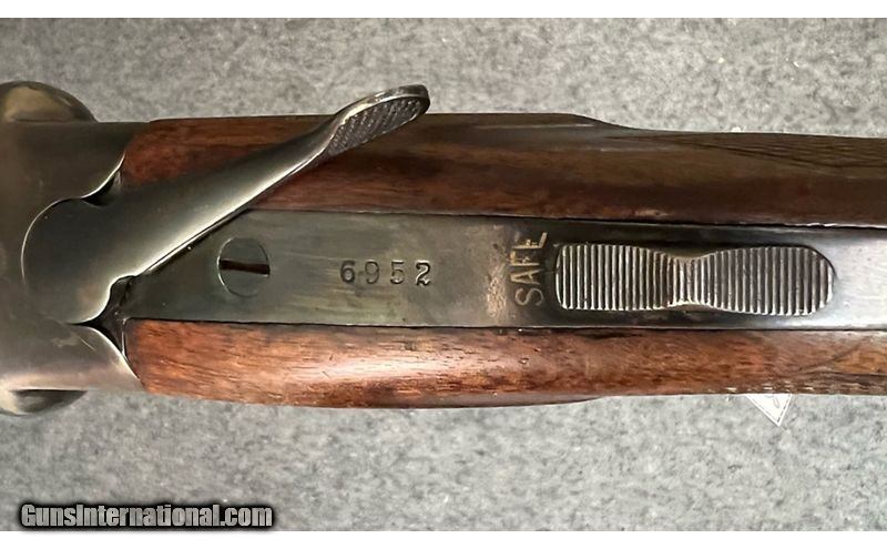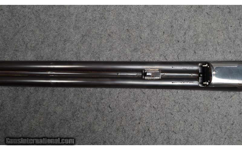 Description: This highly sought after double is a Winchester Model 21 chambered in 16 Gauge (1937). The Winchester 21 owes its fame to a number of manufacturing techniques and design features that had never before been incorporated in a side-by-side shotgun. The action brakes open at an unusually shallow angle, to reduce ejecting and reloading time. Moreover, the Model 21 ignored traditional shotgun manufacturing techniques by foregoing the standard practice of brazing the twin barrels together, a process that often weakened the steel. Instead, the right and left tubes were each forged with an integral chopper lump lug, which, in turn, was cut with a dovetail that locked into the corresponding dovetail of the matching barrel and then soldered. This gives incredible strength to these dovetailed barrels. To give additional strength to this already muscular design, the receiver and barrels were forged of Winchester's proprietary chrome molybdenum "Proof Steel," which was developed especially for the Model 21. Wood is solid with crisp checkering, a few minor handling marks, and retains most of its fine hand rubbed oil finish. The fore end has similarly crisp checkering, a couple minor handling marks, and virtually all of its fine hand rubbed oil finish. Mechanics are crisp with strong ejectors, non-automatic safety, and bright shiny bores. Metal finishes on a Model 21 are unusual in that they have salt blue frames and rust blue barrels - this explains the difference in coloration between these metal surfaces. This shotgun has a Simmons vent rib. This Model 21 is in remarkably good condition furniture and metal, considering its age. 16 Gauge SOLD Chambers: 2¾ inch chambers Metal Condition: "Most of the original bluing is intact, with one scuff mark at muzzle and one midway on left barrel (see photos) Wood Condition: Excellent condition with some observable handling wear to left side of stock Bore Condition: Bore is bright and shiny Barrels: 26 inch barrel Triggers: Inertia-driven single selective trigger prevents doubling and enables the shooter to choose either right or left barrel by pushing the button to the right or left. Stock Dimensions: "13¾ Length of pull, 42½ overall length Fore End: Beavertail fore arm with diamond pattern checkering Butt Pad: Original Winchester butt plate Weight: 7 lbs Sights: White bead front sight Chokes: Modified and Improved Cylinder Item Location: Wichita, KS |