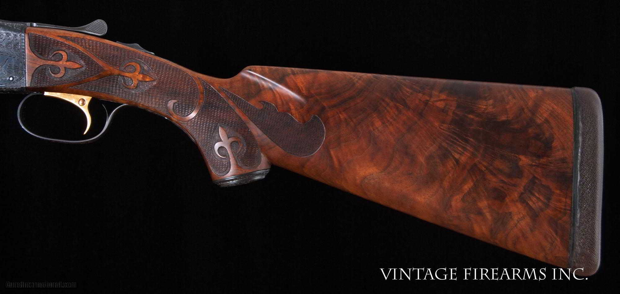 Description: Winchester Model 21 16 Gauge SxS Shotgun #6 ENGRAVED, B CARVED WOOD, CASED General Specs: Winchester, Year 1947, 16 Gauge, 7lbs 3oz, Side-by-Side Serial Number: 18386 When John Olin wanted to have title to the strongest side by side shotgun in the world, he went to work and got it done. The Model 21 is an American icon and its reputation is well deserved. A strikingly handsome gun with the finest steels, gunners in the know have utilized this Winchester in the field and at the club to shoot thousands of rounds without failure. IF YOU LIKE HEAVY LOADS FOR PHEASANTS OR OTHER TOUGH GAME, THIS IS THE GUN. Most double gun enthusiasts are well aware of the reputation earned by the Winchester Model 21; a gun of mechanical genius that was under the micro management of John Olin himself. With only 30,000 produced (compared to 250,000 Parkers!), any high condition Model 21 is a valuable, investment quality firearm. This gorgeous 16ga., sn18386 made in 1947, is a stunning example of the highest level of the Model 21 platform. Engraved by the Custom Shop employee Pauline Muerrle in #6 style, custom stocked with exhibition black walnut and checkered in B Carved style to perfection by Custom Shop employee John Durkin, this could be a very expensive M21. I say "COULD" as this is not a factory engraved gun, but rather a gun finished by Winchester Custom Shop employees outside of the work place. We do have a factory letter documenting the gun as a Standard Grade 16ga. with 28" barrels and documentation of the work done to upgrade the gun to its current status by the above mentioned Winchester employees. Cased in an oak and leather case with all accessories and maker's label, this is a gun to be proud of. Additional features include jeweled water table, standing breech, barrel flats, and forend metal; mirror bores, 28" LM/IM barrels with 3" wedge of engraving; gorgeous oil finished wood with 14 5/16" LOP to a leather covered pad; diminutive Hessian style forend; perfect mechanics, 99% condition overall. What a great chance to own such a gorgeous gun engraved and stocked by Winchester Custom Shop employees, and at 1/2 the price you would expect to pay. A great gun for field or clays, and one you will never tire of looking at! Thanks for looking. Barrels Barrel Length: 28" Chokes: .009/.014 M/IM Bores: perfect mirrors Bore Diameter: .666/.673 Wall Thickness: .032/.025 % Blue: 100% Chambers: 2 3/4" Ribs: tight Sights: silver mid, red bradley front Action Action: tight centered Ejectors or Extractors: ejectors, strong, timed Case Color: blue 100% Screws: perfect Engraving: 21-6 after market engraved Trigger Type: single selective trigger, crisp Trigger Guard Color: 99% Stock Type: capped pistol grip/beavertail Hession style, B CARVED LOP: 14 5/16" LOP To End Of Wood: 13 7/16" DAH: 2 1/2" DAC: 1 9/16" Cast: 1/8" off Checkering Condition: excellent B Carved Butt Treatment: leather covered pad Other There are more photos upon request. We offer a 30 day mechanical warranty on this fine shotgun. Call us for full details. PLEASE SEE MY OTHER FINE VINTAGE FIREARMS. Just open one of my ads and click on the line that says “see all items from this seller” and a very nice list of fine sporting and collectible arms will appear. I have many more fine sxs shotguns not yet listed. Thanks for looking! We employ a full time gunsmith on premises and can perform alterations to suit your needs within a few weeks of purchase. Payment Methods: Money Order, Certified Check, Personal Check, Wire Transfer Inspection Period / Return Policy: Three Days from the date the item was received. Sales Tax: 6% Michigan Only Shipping & Insurance: Ground $140.00 We ship internationally! Item Condition: Used Requires FFL?: Yes If you have any questions about this item or payment, please email or call us directly, at #616-292-6240. Thanks! Jay Shachter, Vintage Firearms, Inc SOLD Curio/Relic: Yes |