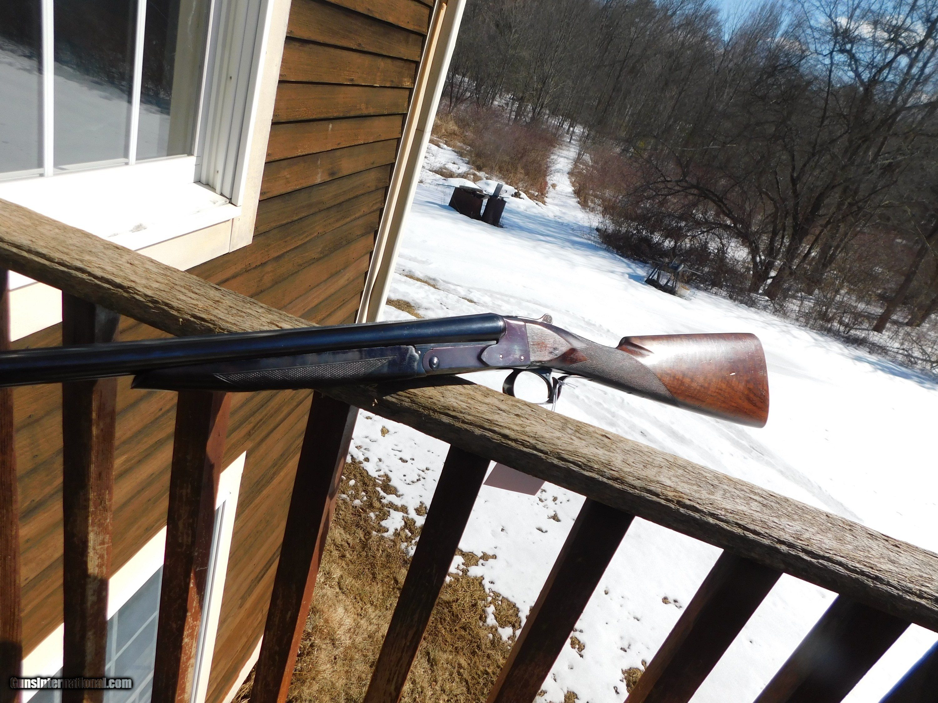 Description: SOLD Somewhat rare find is this 1933 or 1934 20 ga model 21. Features a straight stock with checkered butt, splinter forend, single selective trigger with ejectors. This gun is uncommonly light (6 1/4 lbs). Blue on 26" solid rib barrels appeares original with light freckling outside first 7 or 8 inches forward of receiver (not deep) on the right side, with a very little on rib. Recever has been reblued at one time and has taken on a puruple color generally attributed to either incorrect temp of the bluing salts or too much tin or anitmony in the steel (guessing the former)...There are no polishing marks so the work was in that respect very well done, but it should be eiither reblued or case colored...IT WOULD MAKE AN EXCELLENT CANDIDATE TO BE UPGRADED. Screws are not buggered and are properly oriented, action and forend are super tight as is the action. LOP is 14 1/2 to checkered butt Barrels are 26" and have NOT been cut. Choke markings are Mod/ Mod and have not been fiddled with or changed. DAC is approx 1 1/2 and less than 2 at the heel. Fine LPI checkering is sharp and UNDAMAGED. ..Lever is straight . Stocks actually have nice figure and will be inhanced by being refinished. Shipping is 100.00 IF IT DOES NOT SAY ."SALE PENDING, UNDER DEPOSIT or ON HOLD"...IT IS AVAILABLE. WE DO NOT REPLY TO INQUIRIES THAT SAY "INTERESTED IN THIS GUN" OR "IS IT AVAILABLE" IF YOU WOULD LIKE TO BUY THIS OR ANY OF OUR GUNS WE SUGGEST YOU PHONE US; WE ARE OFTEN AVAIALABLE LONG HOURS. IF YOU ARE INTERSTED IN A GUN THAT IS UNDER DEPOSIT AND WOULD LIKE TO BE NOTIFIED IF A SIMILAR GUN COMES IN DROP US A LINE AND WE WILL MAKE EFFORTS TO CONTACT YOU WHEN ONE DOES COME IN. WE HAVE OVER 2000 SALES ON ALL SITES WITH AN A+ RATING ON ALL WE ALSO KEEP AN INVENTORY OF OLDER PERIOD CORRECT SCOPES; CALL WITH NEEDS WE MOSTLY PICK VERY CLEAN AND LIGHLTY USED GUNS. WE ARE HAPPY TO TAKE CONSIGNMENT GUNS AND COLLECTIONS OR WILL BUY YOURS OUTRIGHT. WE SOMETIMES ARE EMPLOYED FOR ESTATE PURPOSES AND VALUATIONS. AT THIS TIME WE ARE ONLY ACCEPTING US POSTAL MONEY ORDERS OR BANK CHECKS FOR PAYMENT IT IS THE BUYERS RESPONSIBILITY TO GET US A COPY OF YOUR RECEIVING FFL'S LIC AND A COPY OF YOUR PHOTO ID BEFORE THE GUN SHIPS YOU MUST CALL OR CONTACT YOUR FFL.WE DO NOT CALL FOR YOU UNLESS THEY RQUIRE IT. LAYAWAY PURCHASES NOT COMPLETED ON ANY RETURNED ITEM UNLESS NOT AS DESCRIBED OR DAMAGED ARE SUBJECT TO A 10% RELISTING/RESTOCKING FEE AND MUST BE RETURNED WITH NO NEW MARKS OR SCRATCHES, SENT BACK INSURED, PRIORITY SIGNATURE REQUIRED. ALL INFORMATION CONTAINED HEREIN IS BELIEVED TO BE ACCURATE BUT IS NOT GUARANTEED. WITH ANY OLDER OR USED GUN IT SHOULD BE INSPECTED BY A GUNSMITH PRIOR TO SHOOTING. SOLD |