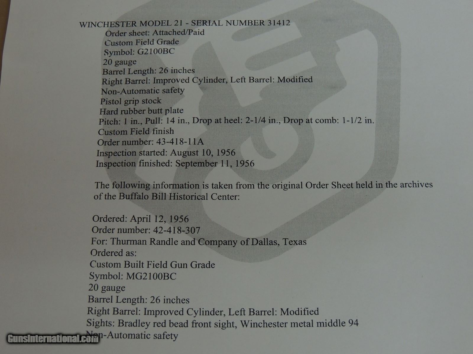 Description: WINCHESTER MODEL 21 20 GAUGE "CUSTOM BUILT BY WINCHESTER", 26" IC AND MODIFIED, NUMBER 4 ENGRAVING COVERAGE GUN SPECS MATCH BUILD SHEET, ENGRAVING IS INITIALED JK FOR JOHN KUSMIT UNDER DOGS PAW, SPECIAL STOCK CHECKERING PATTERN 98% CONDITION OVERALL, PERFECT BORES AND MECHANICS CURIO AND RELIC ELIGIBLE PRICE ON REQUEST/ SERIOUS INQUIRIES ONLY ******* (PLEASE REFERENCE OUR INVENTORY NUMBER) (PAYMENT OPTIONS) (Postal Money Order) (Cashiers Checks) (Personal Checks (Item held until Check Cleared) ***(Layaway 120 days-(No Interest)-(Pay any way, any time you like over the term) -(Deposit required)*** (Credit Cards Visa or Master Card 3% fee added to total sale) (GA residents 7% sales Tax Applies) (BEST PHONE/TEXT 229-424-8450) (SHIPPING $35.00) SOLD Curio/Relic: Yes |