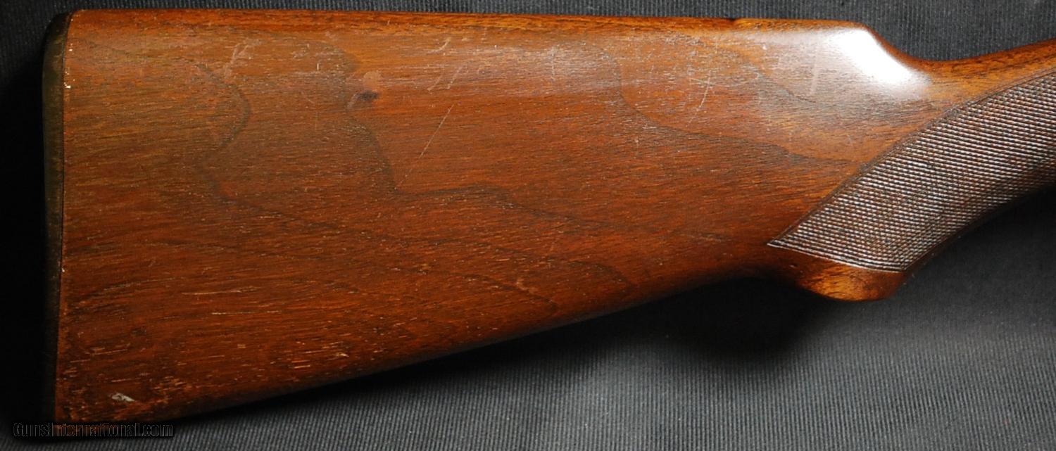 Description: WINCHESTER- Model 21, 20ga, 26” barrels choked CYL/M, scant pistol grip stock, splinter forend, original Winchester butt plate, double trigger, extractor gun, solid rib, early production gun with squared frame, handling marks on wood, normal bluing wear on edges of receiver, most bluing worn on trigger bow, and forend iron.