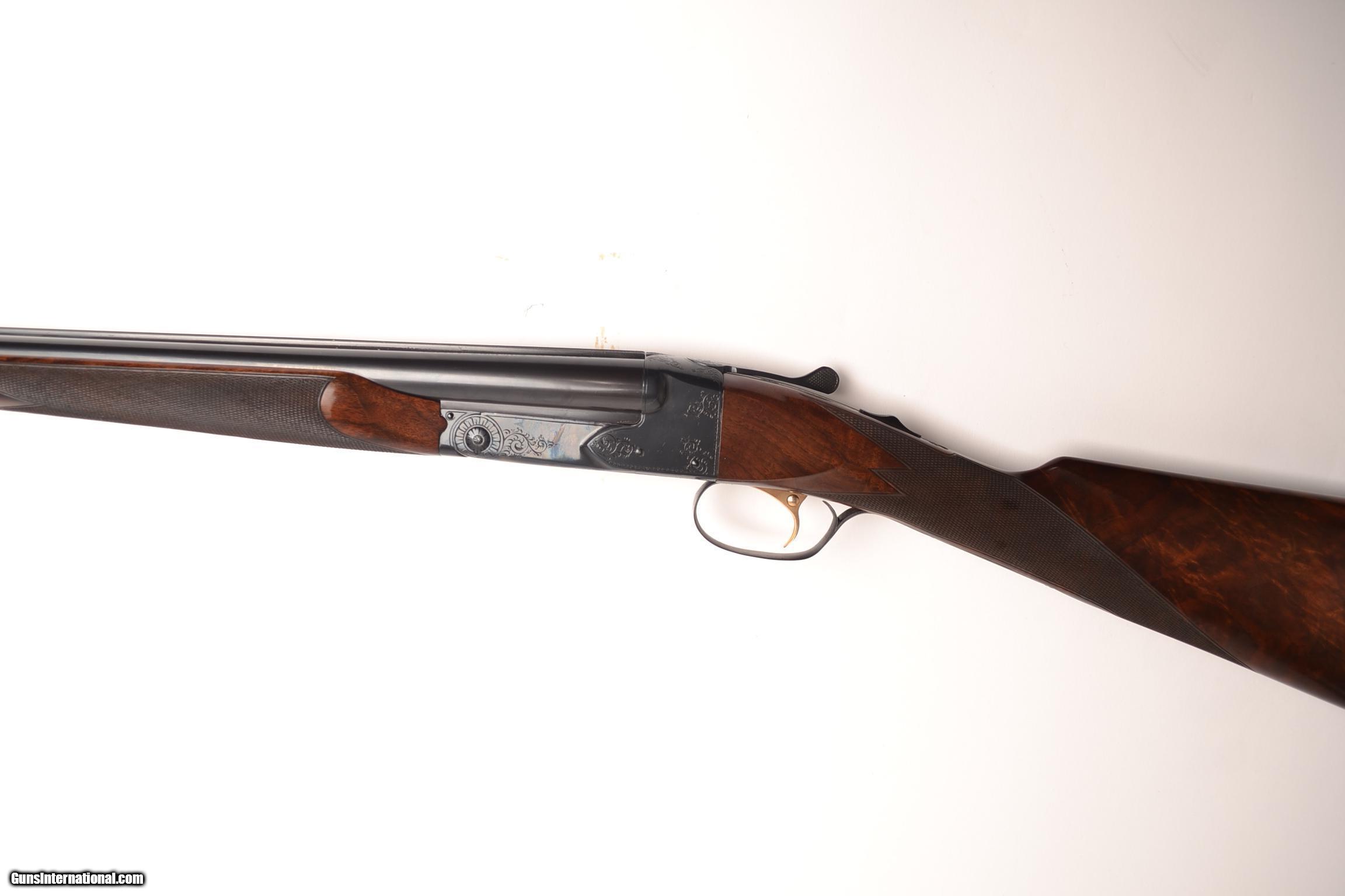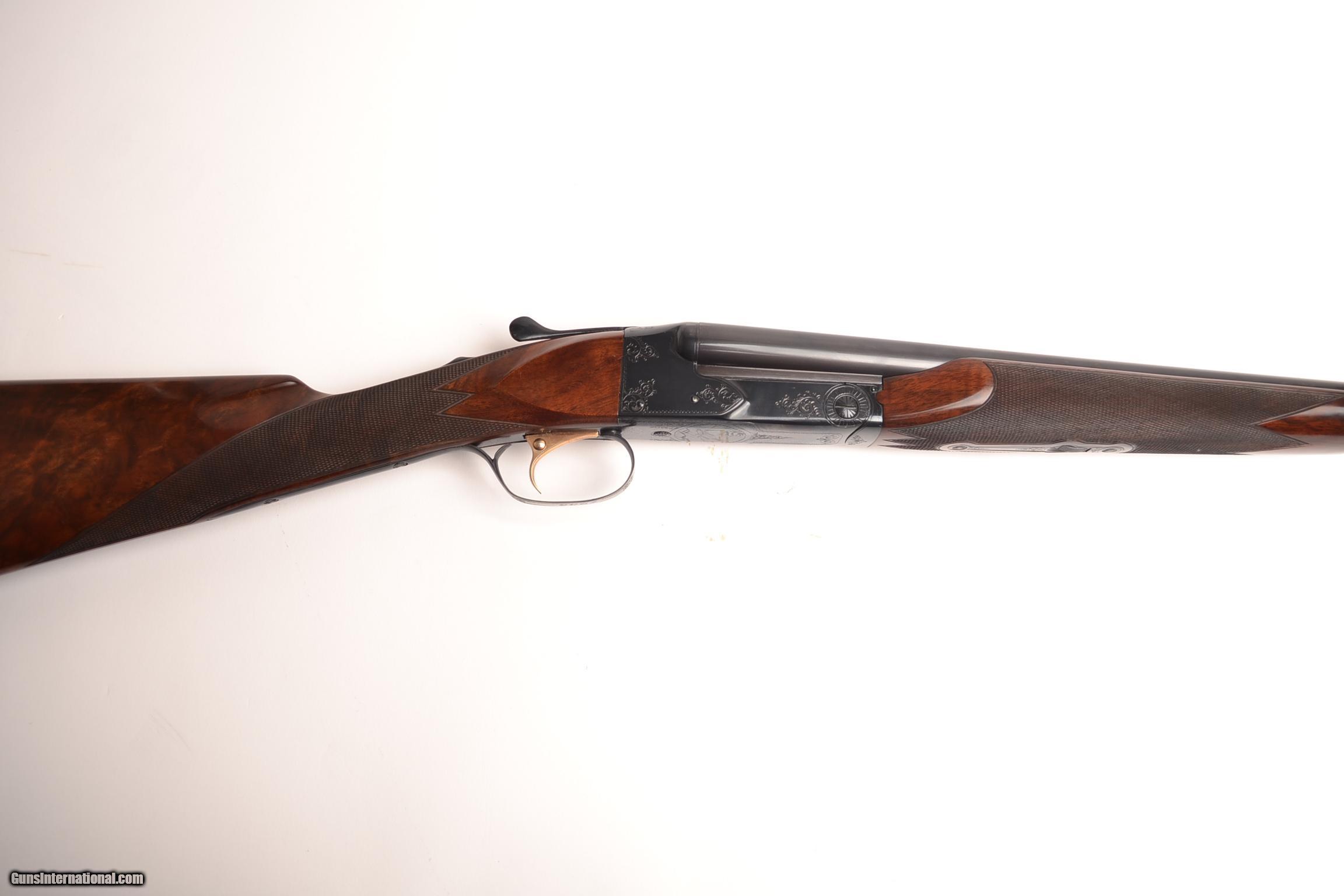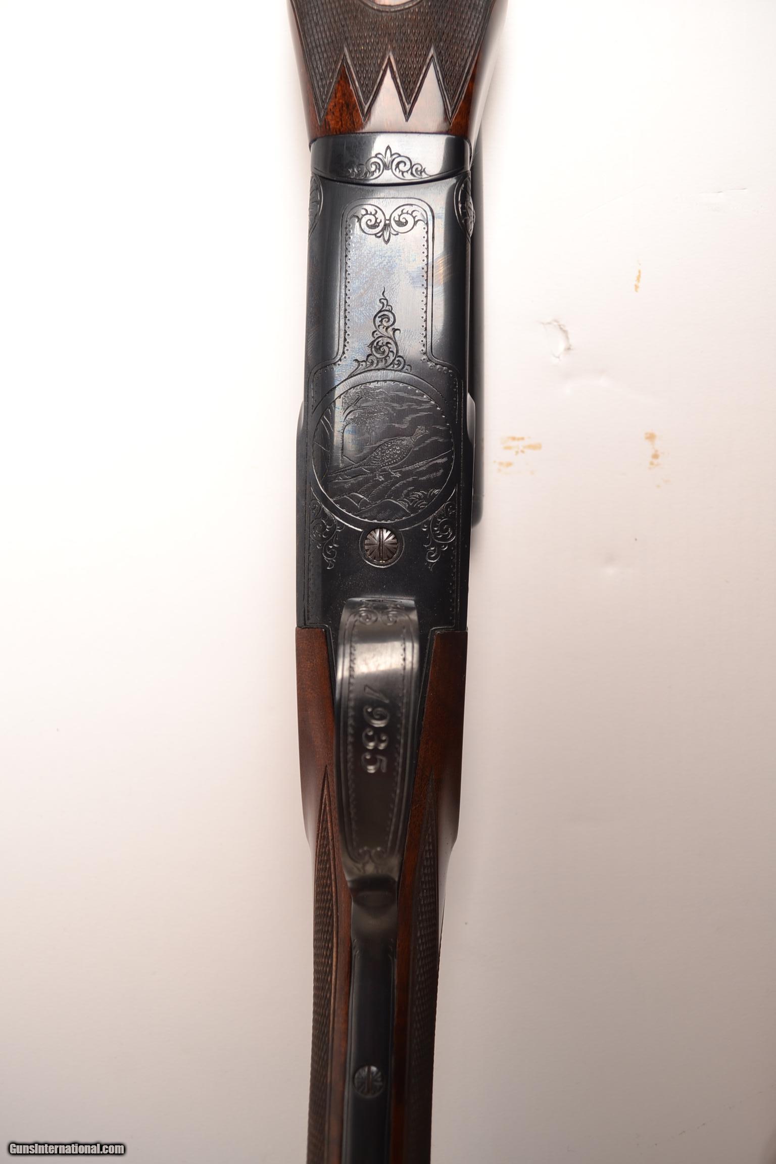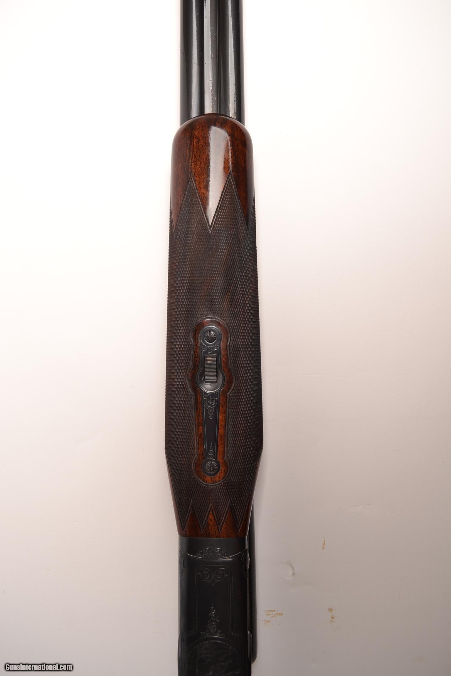 Description: Winchester Model 21 20ga. 26” Barrels choked Mod/Mod. Straight grip, checkered butt, gold single trigger, beavertailforend. Deluxe multi-point checkering pattern, #4 engraved with pheasant engraved on bottom and 1935 engraved on trigger guard. This gun has beautiful feather crotch black walnut. Engraved by George Ulrich. Superior great gun. Inventory # 29375 LOP – 14 3/8” Price - $19,995 SOLD |