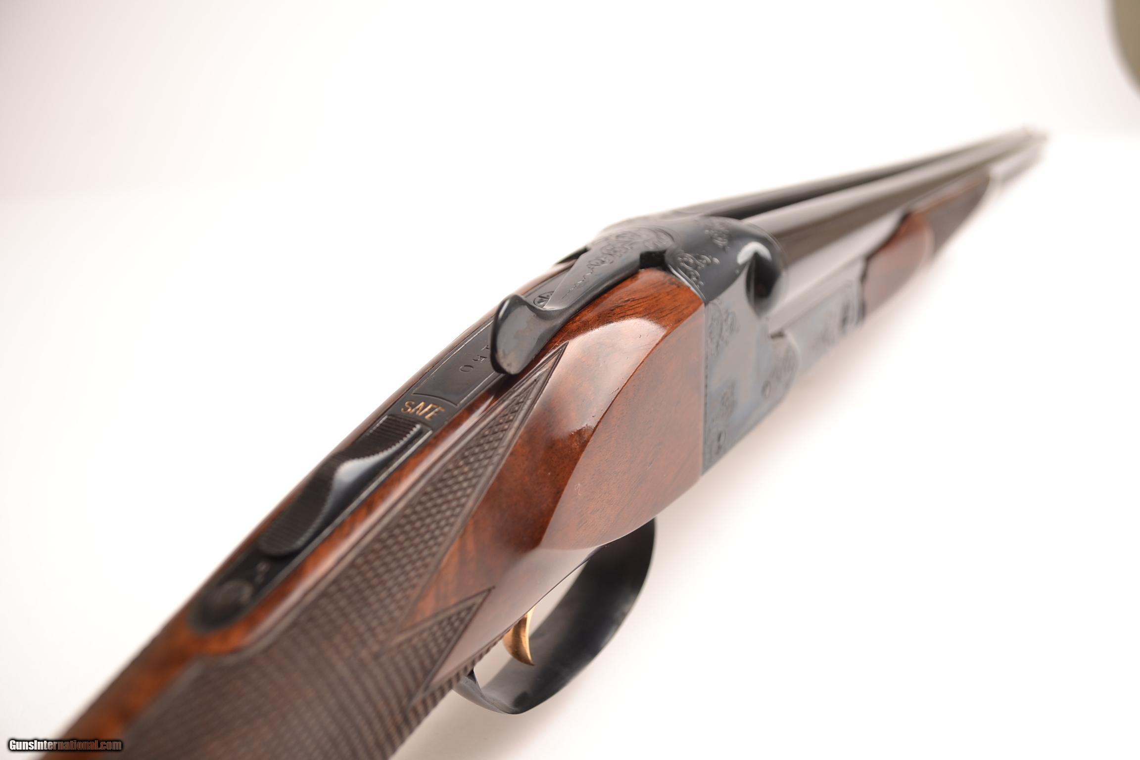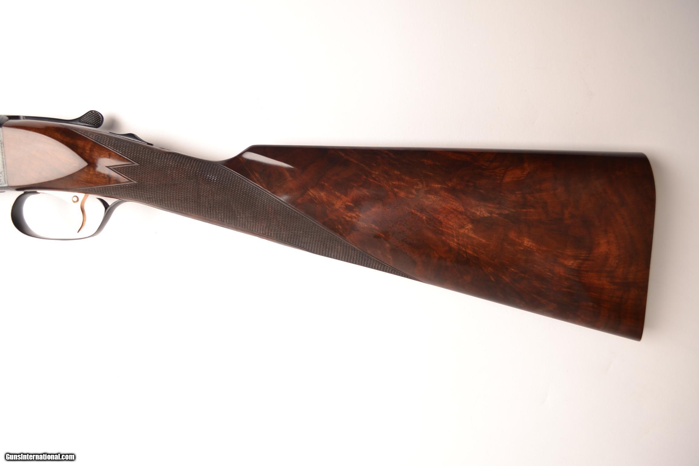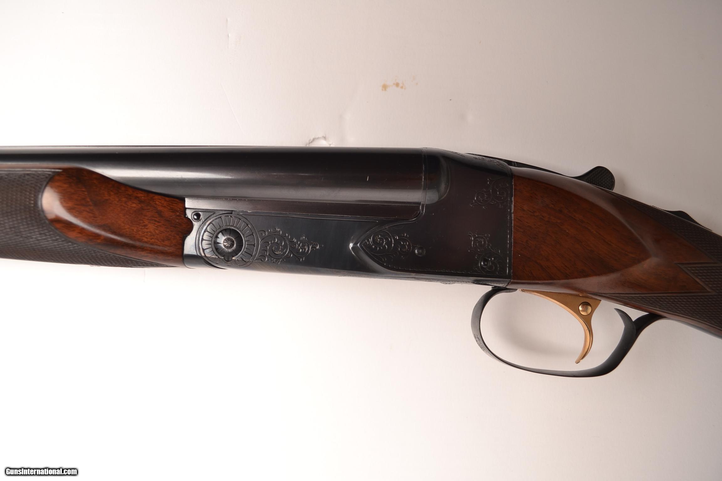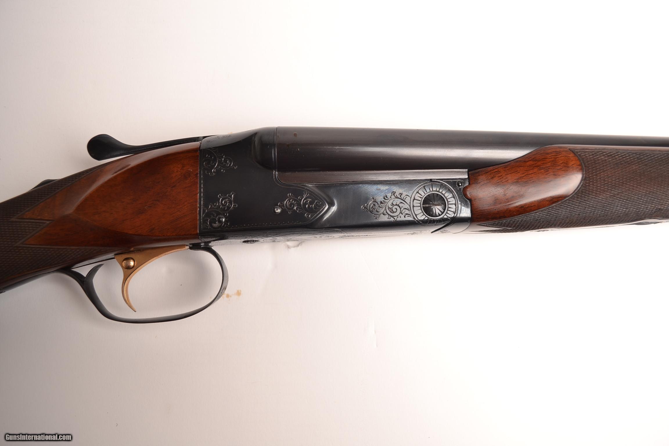 Description: Winchester Model 21 20ga. 26” Barrels choked Mod/Mod. Straight grip, checkered butt, gold single trigger, beavertailforend. Deluxe multi-point checkering pattern, #4 engraved with pheasant engraved on bottom and 1935 engraved on trigger guard. This gun has beautiful feather crotch black walnut. Engraved by George Ulrich. Superior great gun. Inventory # 29375 LOP – 14 3/8” Price - $19,995 SOLD |