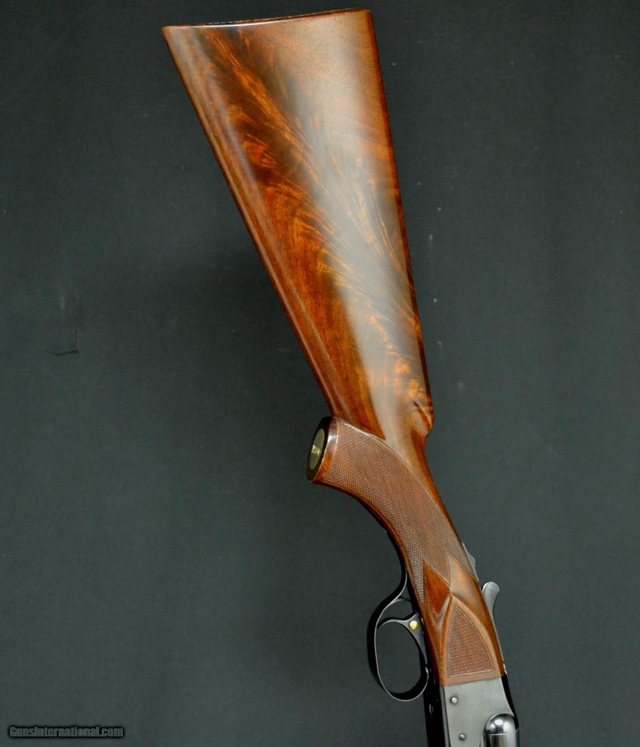 Description: Winchester Model 21, 20ga., 26" barrels choked WS1/WS2. Factory trap grade, checkered side panels, deluxe checkering, checkered butt, beavertail forend, matte rib. This is a 99% original gun, unaltered and is in original A&F case with all accessories. Owners initials on pistol grip, which can easily be changed, also initials are on the case. This gun was made for Royce G. Martin, President of Electric Auto Light Company. This is an outstanding, high condition, very rare gun, not altered in any way. Literally like new in the box. Beautiful piece of feathercrotch, with minor handling marks, available for immediate delivery. Inv# 36770 14 3/8" x 1 3/8" x 2 1/4" $12,995.00 SOLD |