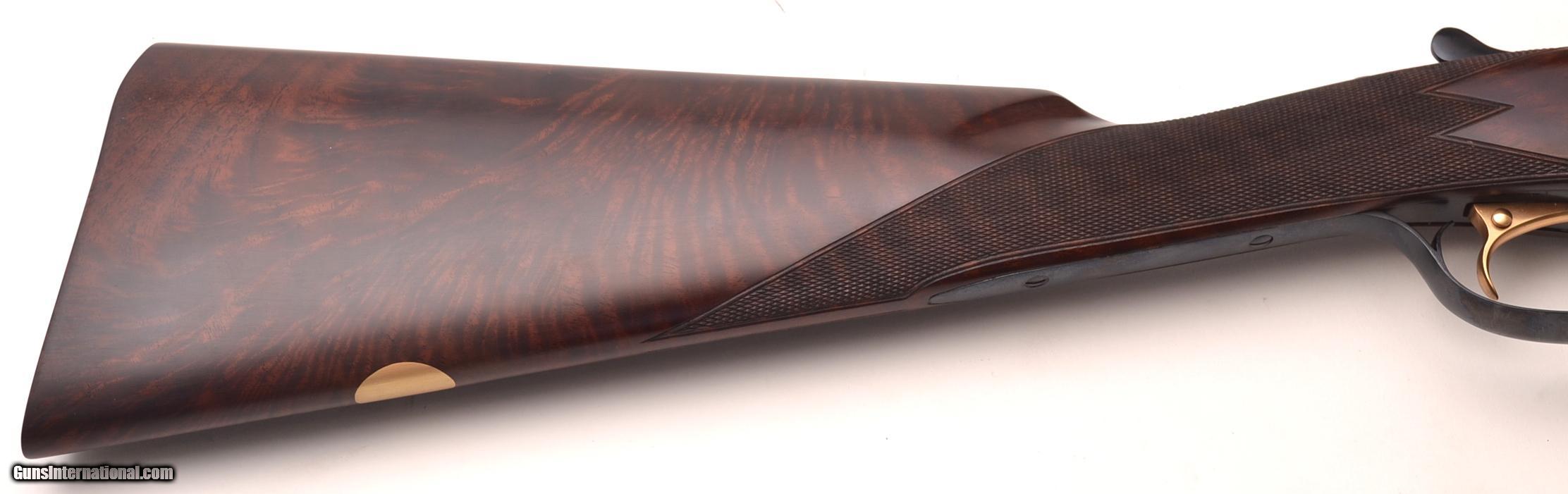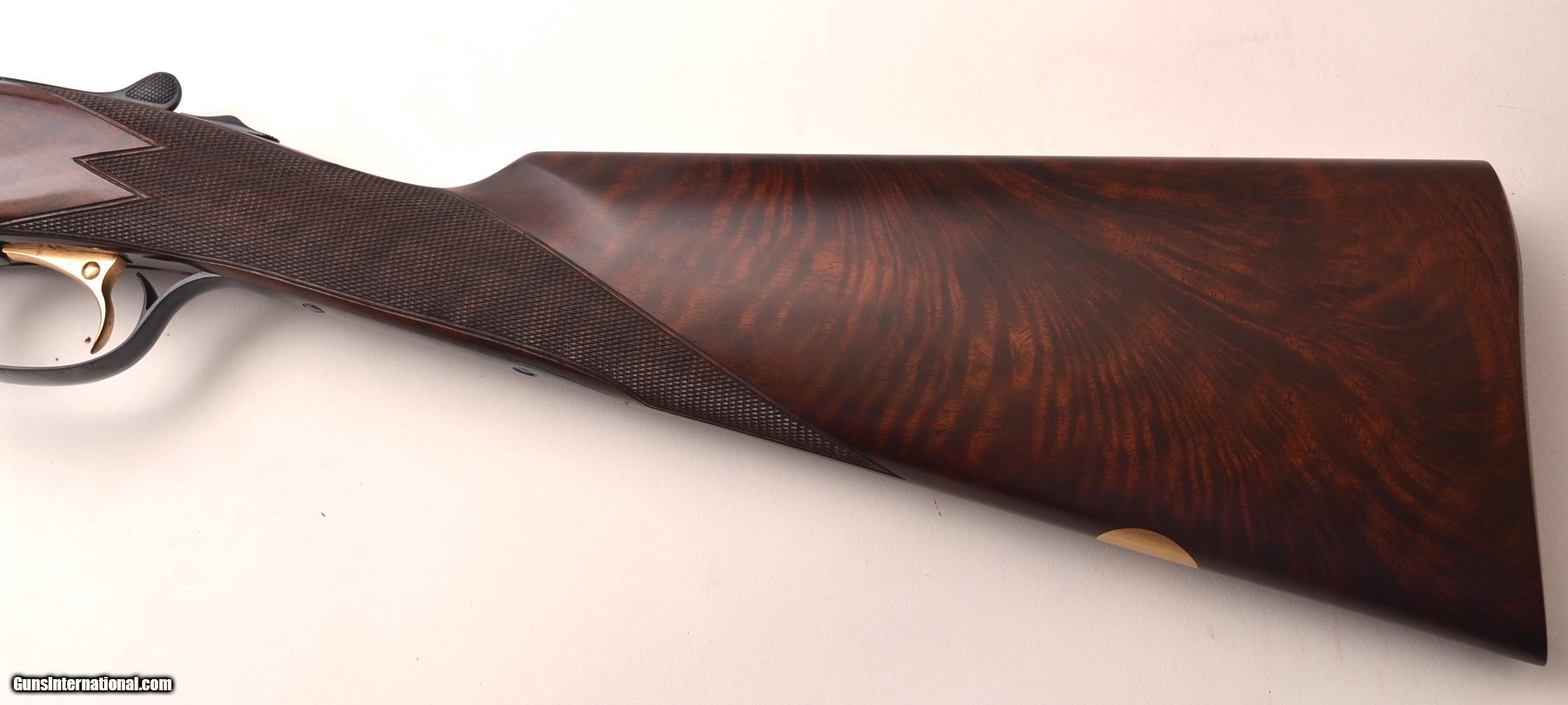 Description: Winchester Model 21, 20ga. 28” barrels, choked WS1/WS2. Superb, extremely unusual from the finest Model 21 collection. Flat side, custom checkering patter, straight grip, checkered butt, single selective trigger, vent rib beavertail forend, and 2 ivory sights. This gun has gold inlays of a Setter on the sideplates and a Labrador on the bottom of the receiver. The gold inlays are fantastic and highly detailed. This gun features 3 dimensional black feather crotched walnut. Brand new and unfired. Special ordered by Ernie Simmons. Inventory # 30851 14 1/4 x 1 3/8 x 2 1/4 6lbs 12oz Price - $18,995 SOLD |