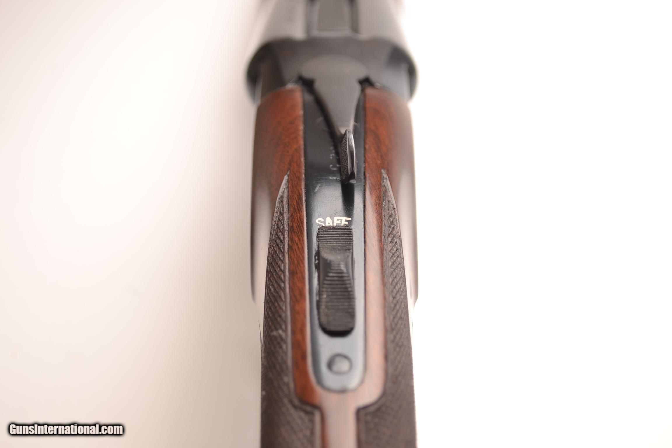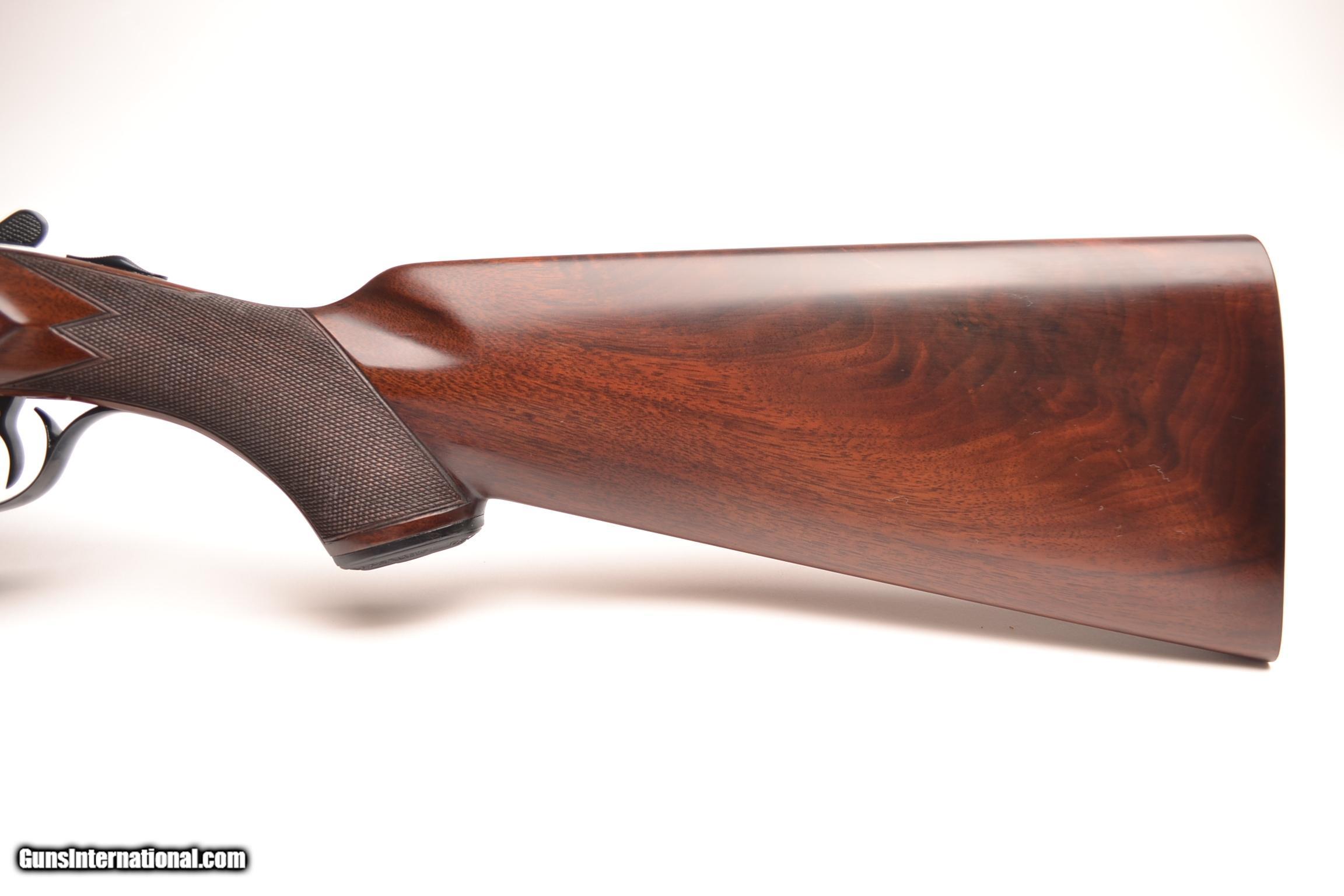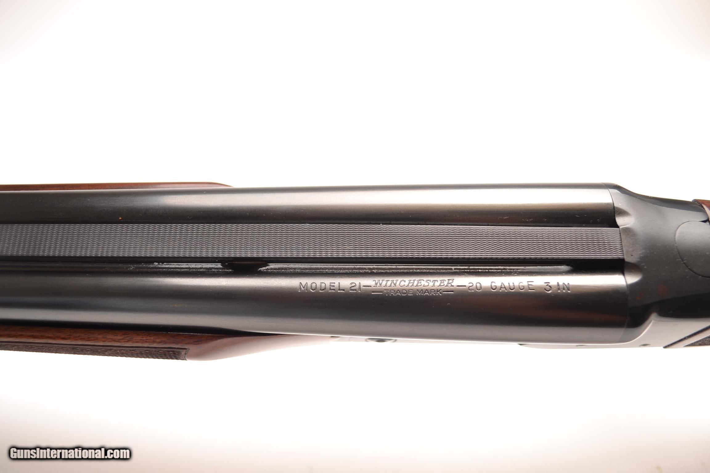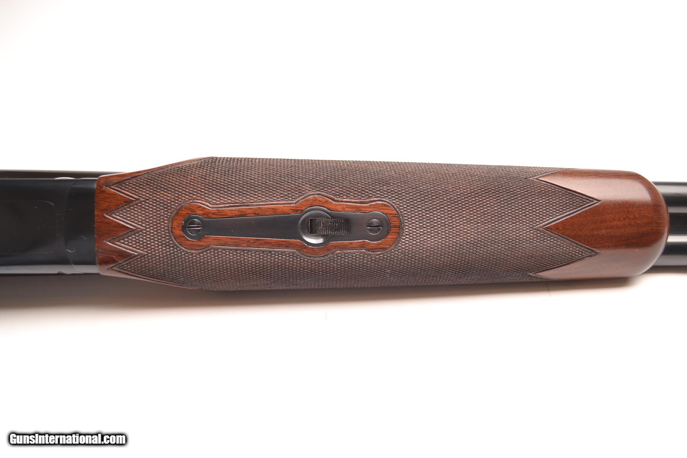 Description: Winchester Model 21, 20ga. , 28” barrels, choked WS1/WS2. Factory 3” magnum, capped pistol grip, checkered butt, 3 point checkering, checkered side panels. Nicely figured black walnut feathercrotch. Very unusual configuration. FACTORY VENT RIB, VERY RARE. This gun is 99% as new. A perfect gun. Inventory # 40537 Price - $12,995 SOLD |