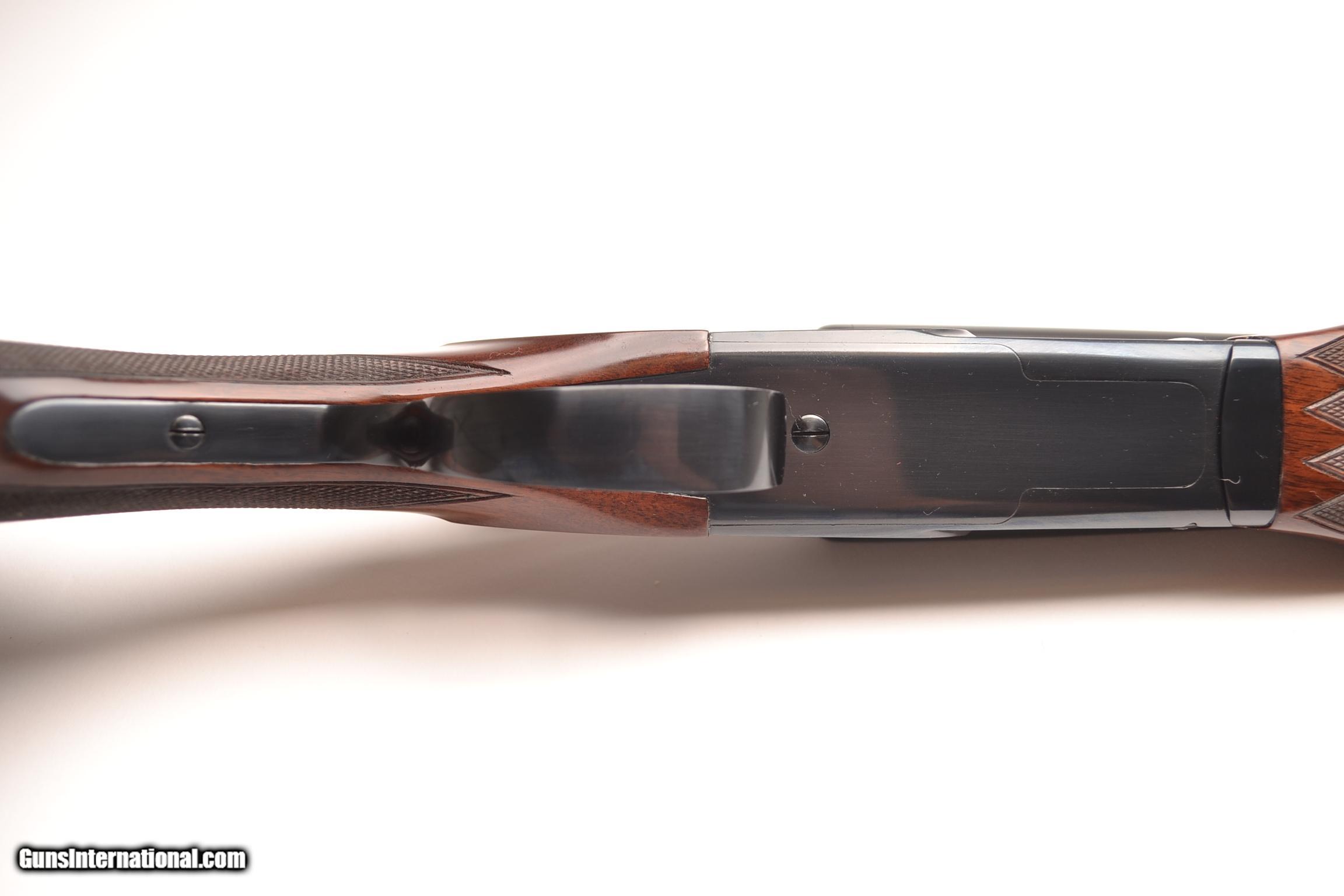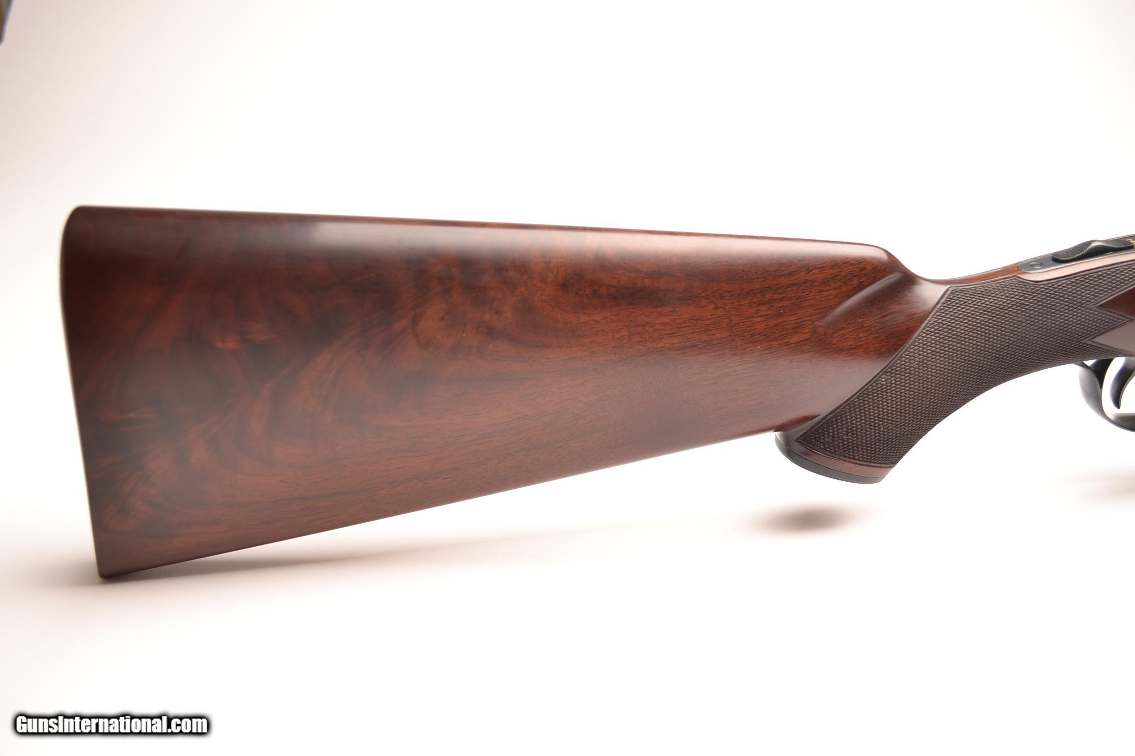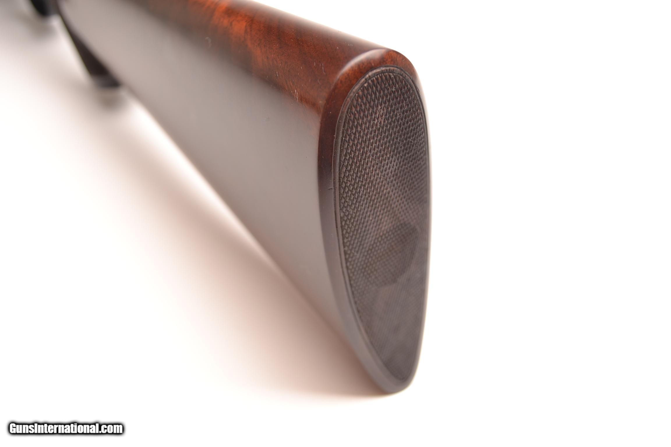 Description: Winchester Model 21, 20ga. , 28” barrels, choked WS1/WS2. Factory 3” magnum, capped pistol grip, checkered butt, 3 point checkering, checkered side panels. Nicely figured black walnut feathercrotch. Very unusual configuration. FACTORY VENT RIB, VERY RARE. This gun is 99% as new. A perfect gun. Inventory # 40537 Price - $12,995 SOLD |