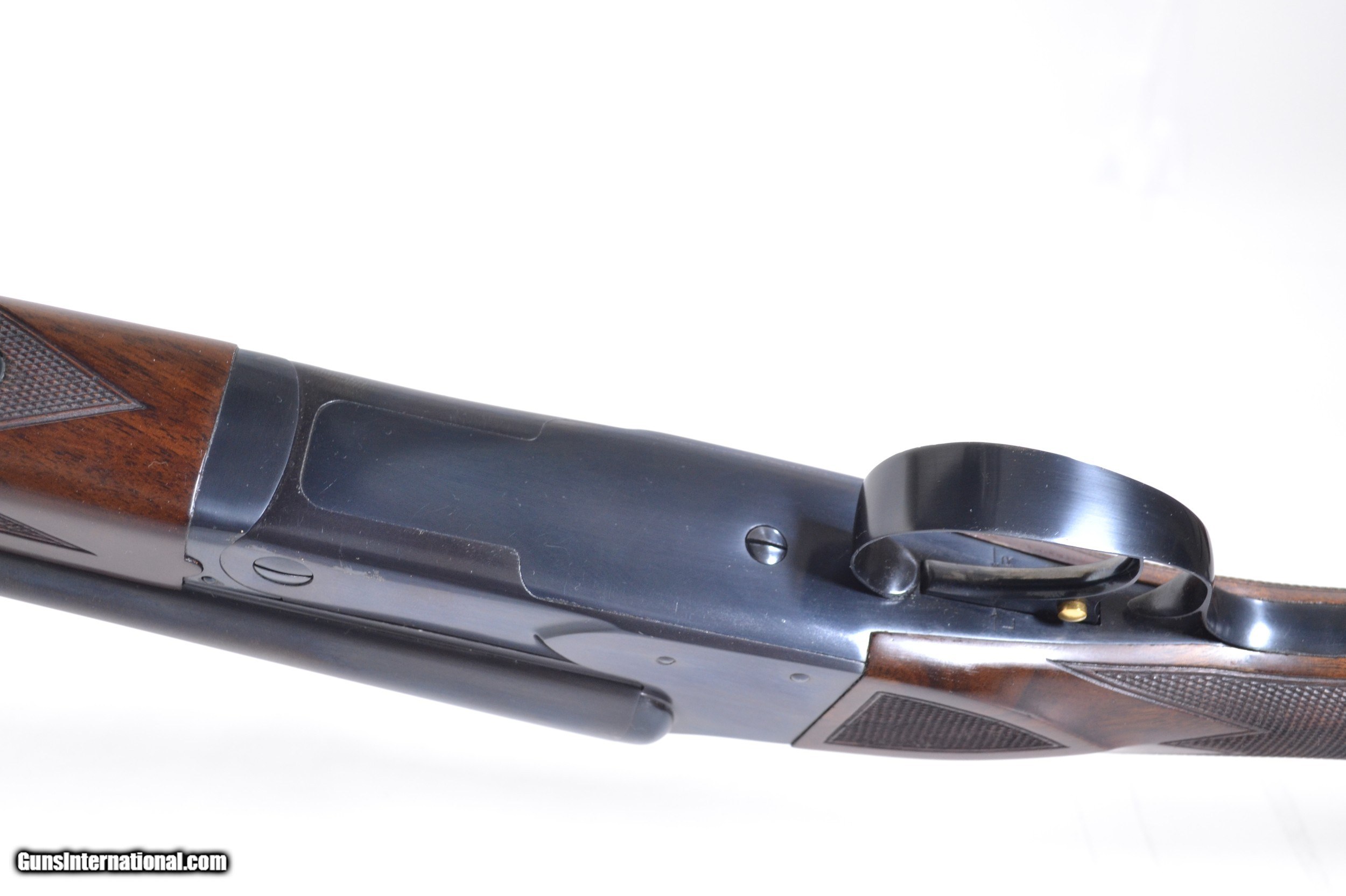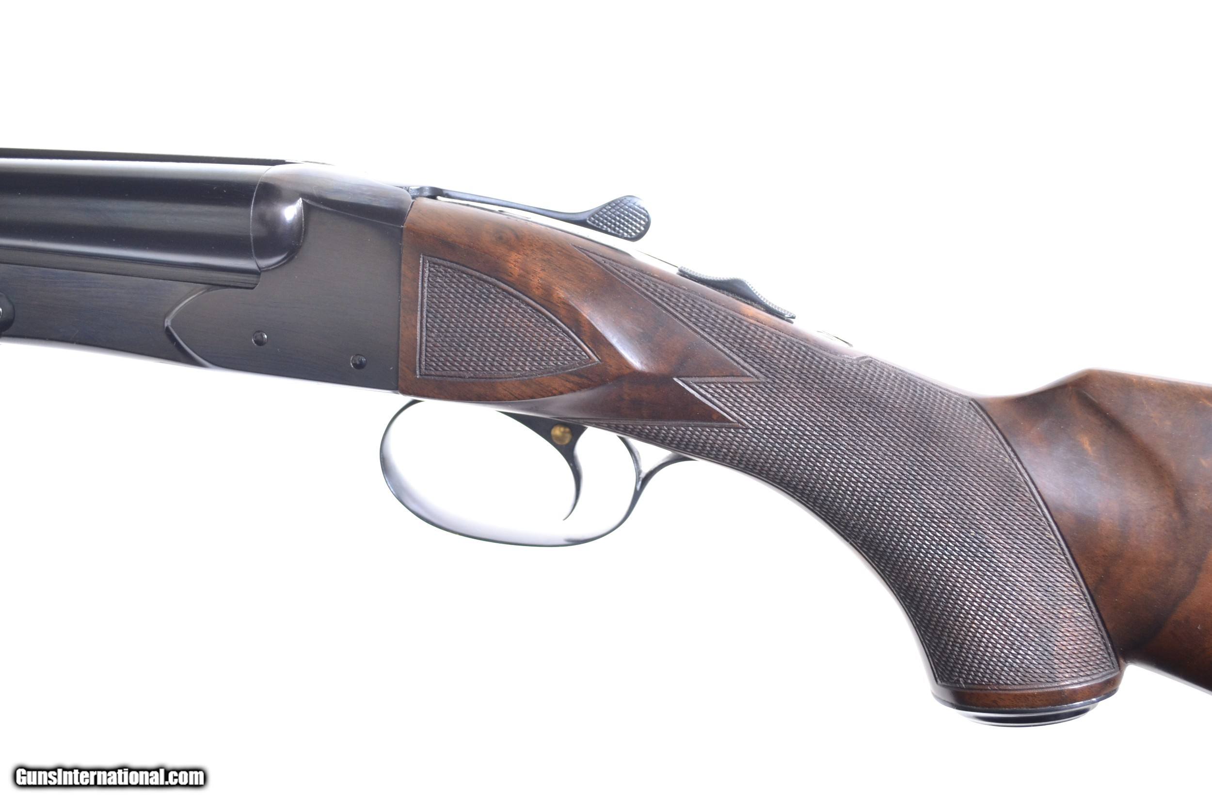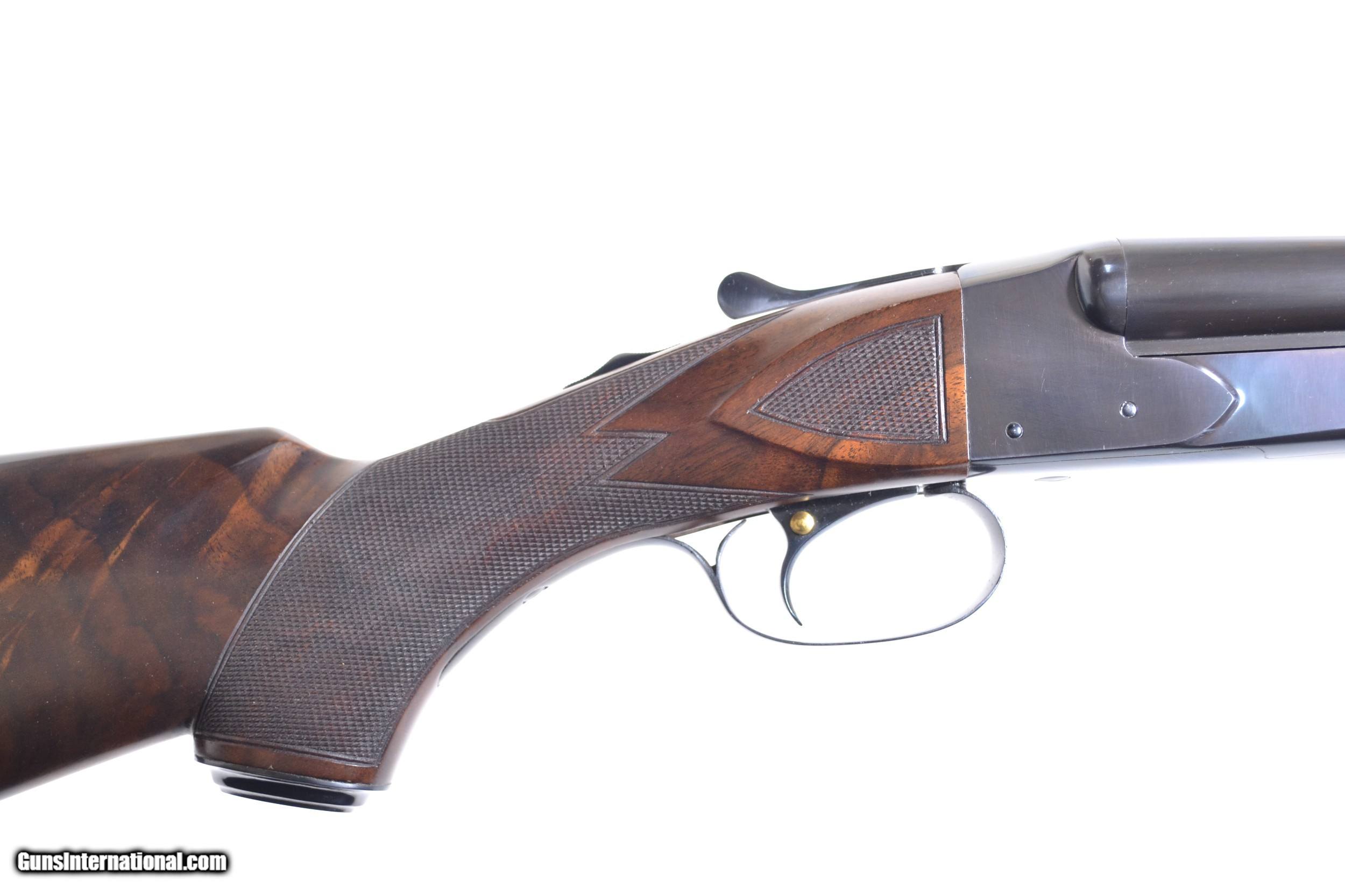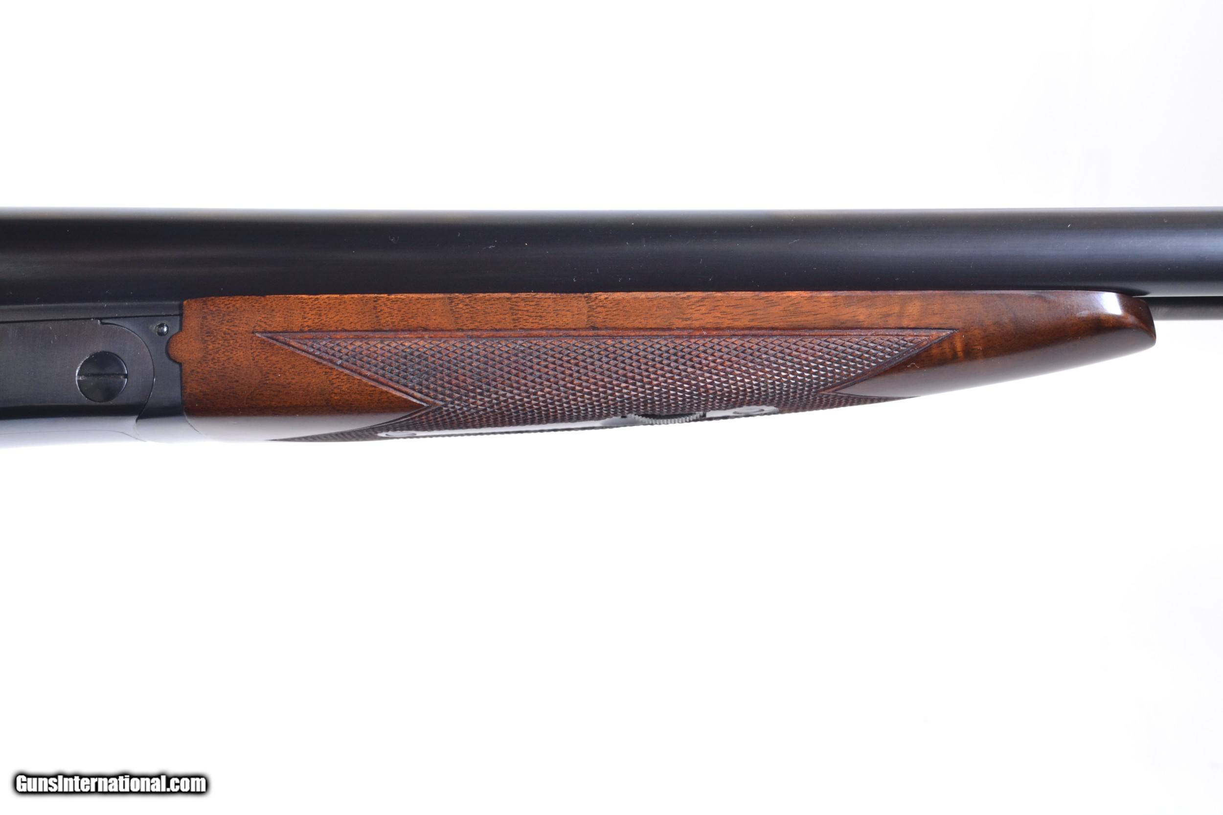 Description: Winchester - Model 21, 20ga. Two Barrel Set, 26" WS1/WS2 & 28" M/IM. Each with their own forend, one splinter one tail, matte rib, single selective trigger, auto-ejector, capped pistol grip, checkered butt, highly figured deluxe wood, checkered side panels with 3 point checkering. Completely Cody lettered. In as new condition, completely checked by our shop. This is truly a special ordered gun. Inv: 29383 7 lbs. 0 oz. 14 1/4" x 1 1/2” x 2 3/8” $13,995.00 SOLD |