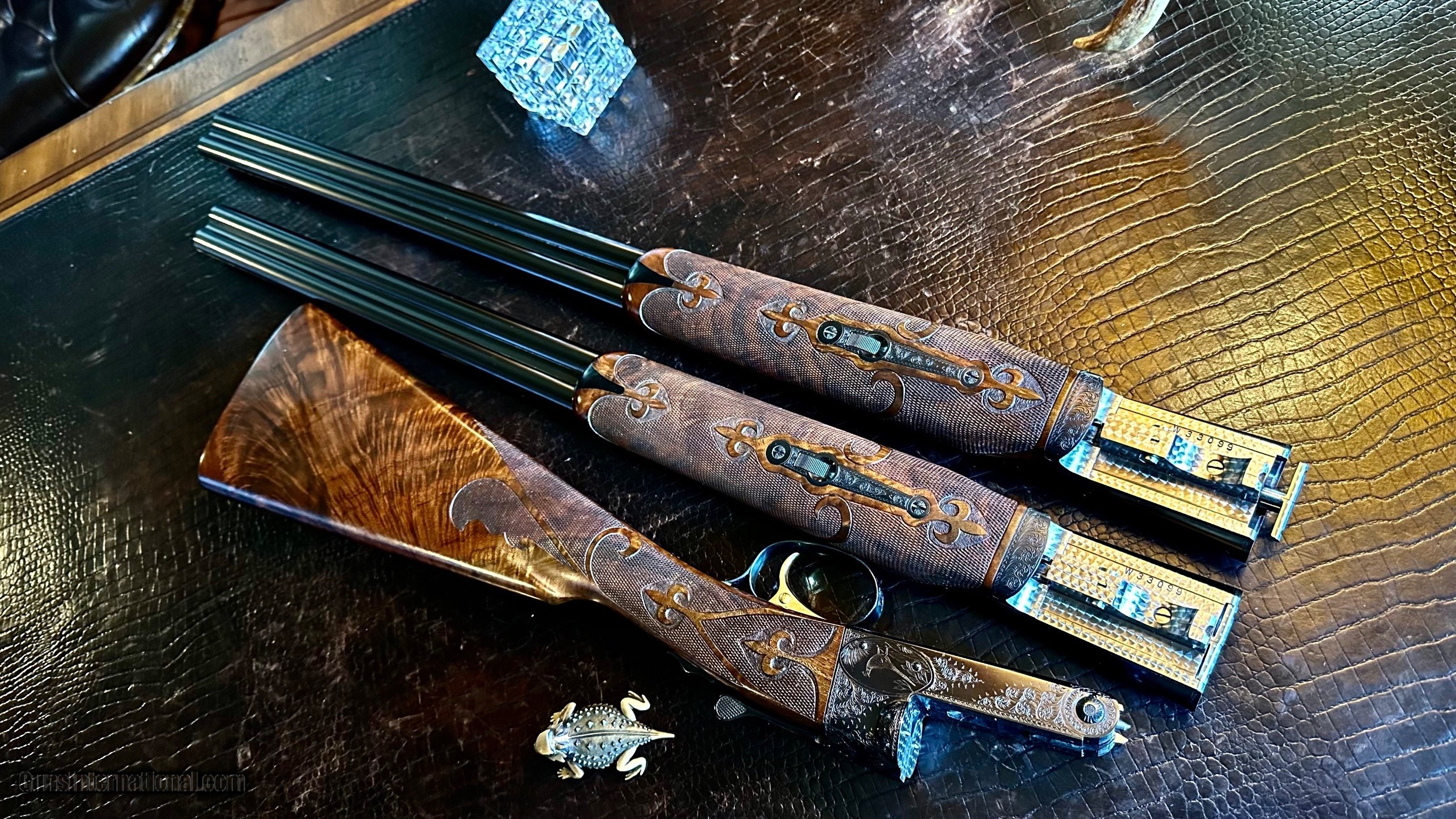 Description: Winchester Model 21 #5 - 20ga - Two Barrel - 26” 28” - Nick Kusmit Engraved Stated on Proper Cody Letter - Maker’s Case Cody Data: Cody Firearms Records Office THIS DOCUMENT DOES NOT CONSTITUTE A FACTORY LETTER **Do not accept this as a verification of firearm configuration** - Phone: 307-578-4031 Email:cfmrecordscenterofthewest ://centerofthewest/explore/firearms/firearms-records/ If the content of this search does not match the current configuration of your firearm, please contact the Records Office. Acknowledging that many firearms have been modified over the years, we will be happy to double-check the entry. WINCHESTER MODEL 21 - SERIAL NUMBER 33099 Order sheet: Not Available Custom Grade Symbol: MG21CG 20 gauge Barrel Length: 26 inches Right Barrel: Improved Cylinder, Left Barrel: Modified Chamber: 3 inches Vent Rib Sights: Ivory bead front and Metal middle Second barrel set: 20 gauge, 28 inches, Right Barrel - Modified, Left Barrel - Full, 3-inch chamber Non-Automatic safety Straight grip stock Checkered butt Field style beavertail forearm with black insert in tip Pitch: 1-1/2 in on 26-inch barrels in., Pull: 14 in., Drop at heel: 2-1/4 in., Drop at comb: 1-1/2 in. Comb Width: Medium Hand rubbed oil finish Grade of Wood: Full fancy grade AA American walnut Engraved: 21-5 Panel in rib: "Custom Built by Winchester" (no name) Gold oval name plate without initials Engine turn bright metal surfaces Gold plated trigger Engraved by Nick Kusmit Carved: 21-B Charge Symbol 3011-000-5005 Order number: 061180 Inspection started: September 14, 1982 Inspection finished: June 08, 1983 SOLD Shotgun Gauge: 20 Gauge |