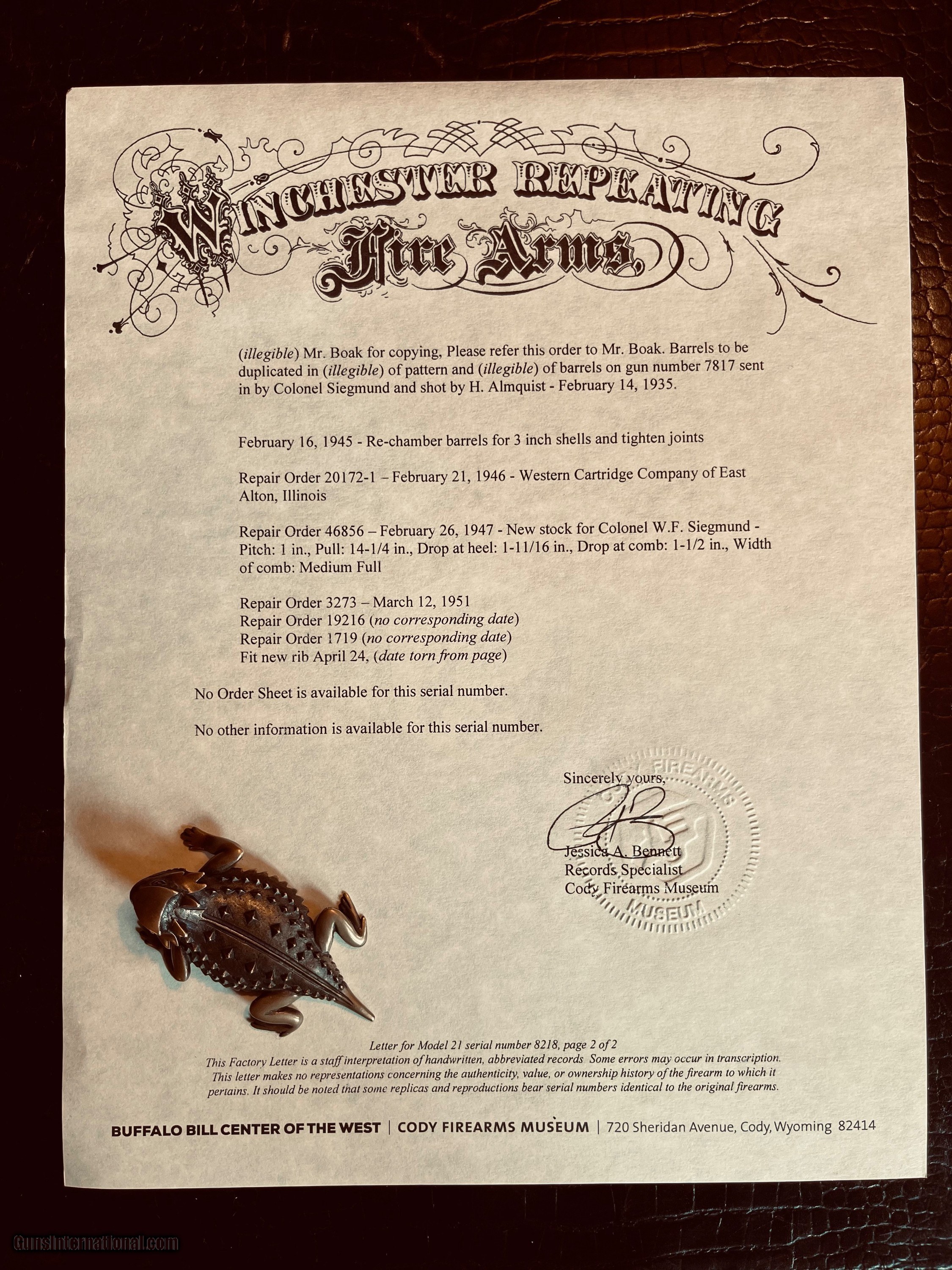 Description: *****SOLD SOLD SOLD***** Winchester Model 21 #6 ULRICH - 12ga - 30” - "Trap" - Heavily Documented - Ulrich Engraved - ca. 1935 - HIGH Condition - Untouched! CODY LETTER: PAGE 1 May 07, 2015 The original manufacturer's data for the Winchester Model 21 shotgun, serial number 8218, as extracted from the original Winchester records housed in this museum, are as follows: Trap Grade Symbol: G2100B 12 gauge Barrel Length: 30 inches Right Barrel: Full, Left Barrel: Full Sights: White metal #81A front, No middle sight Non-Automatic safety Single trigger Selective ejector Straight grip stock Winchester recoil pad Regular forend Pitch up: 3/8 in., Pull: 15 in., Drop at heel: 1-3/8 in., Drop at comb: 1-7/16 in., Grip dimensions to be exactly like Model 21 number 7817. Be sure there is no cast off or on Weight: 7 lbs. 11 oz. Comb Width: ordered with Thick comb, inspected with Trap comb Grade of Wood: Trap Engraved #6 Made for: Colonel W. F, Siegmund Order number: 5475, Item #1 Inspection started: April 23, 1935 Inspection finished: May 15, 1935 Colonel Siegmund desires that we follow closely the general handling and dimensions of Model 21 number 7817. Letter for Model 2i serial number 8218, page 1 of22 This Factory Letter is a staff interpretation of handwritten, abbreviated records pome exrors may Occur in'transcription. This letter makes no representations concerning the authenticity, value, or ownéw hip history of the firéarm to which it BUFFALO BILL CENTER OF THE WEST CODY FIREARMS MUSEUM | 720 Sheridan Avenue, Cody, Wyoming 82414 CODY LETTER PAGE 2: Mr. Boak for copying, Please refer this order to Mr. Boak. Barrels to be duplicated in (illegible) of pattern and (illegible) of barrels on gun number 7817 sent in by Colonel Siegmund and shot by H. Almquist - February 14, 1935. February 16, 1945 - Re-chamber barrels for 3 inch shells and tighten joints Repair Order 20172-1 - February 21, 1946 - Western Cartridge Company of East Alton, Illinois Repair Order 46856 - February 26, 1947 - New stock for Colonel W.F. Siegmund- Pitch: 1 in., Pull: 14-1/4 in., Drop at heel: 1-11/16 in., Drop at comb: 1-1/2 in., Width of comb: Medium Full Repair Order 3273 - March 12, 1951 Repair Order 19216 (no corresponding date) Repair Order 1719 (no corresponding date) Fit new rib April 24, (date torn from page) No Order Sheet is available for this serial number. No other information is available for this serial number. Sincerelv yours, Jessica A. Bennett Récords Specialist MUSEUW Letter for Model 21 serial number 8218, page 2 of 2 This Factory Letter is a staff interpretation of handwritten, abbreviated records Some errors may occur in transcription. This letter makes no representations concerning the authenticity, value, or ownership history of the firearm to which it pertains. It should be noted that some replicas and reproductions bear serial numbers identical to the original firearms. BUFFALO BILL CENTER OF THE WEST | CODY FIREARMS MUSEUM | 720 Sheridan Avenue, Cody, Wyoming 82414 OLD DATA: 2519. *SPLENDID PRE-WAR WINCHESTER MODEL 21 TRAP WITH NO.6 ENGRAVING FOR OLIN EXEC COL. W.F. SIEGMUND(SN 8218X1935) Cal. 12 ga. 3' Chambers. 30" Bbls with matted game rib, have 2-1/2" wedges of scroll engraved at breech ends. Bbl flats stamped with "12 GAUGE 3 IN CHAM" and SN. Bottoms of bbls are stamped with "Full and Full". blued action with standard Winchester markings and patents, are on engine turned water table, is fitted with checkered single selective trigger and automatic safety. Action is finely engraved in wonderful 21-6 patterns with nearly full coverage well cut scrollwork framing vignettes of dogs in ovals; a setter on left and a pointer on right; a pair of pheasants is in circular scene on trigger plate. Fences are relief engraved with oak leaves and acorns. This superb engraving is most certainly the work of master Winchester engraver Alden George Ulrich. Trigger guard is also scroll engraved with portrait of spaniel on bow. Straight grip buttstock of XXX crotch figured American walnut measures 14-1/4" over Winchester #2 leather covered pad, and features deluxe style checkering with beaded borders at grip and side panels. Matching trap grade beavertail forend with standard latch has inset ebony tip and SN on iron and wood. Bore diameter: left-.728, right -.727. Bore restrictions: left -.031, right -.028. Wall thickness: left -.030, right -032. Drop at heel: 1-3/4", drop at comb: 1-1/2'. Weight: 7 lbs. 11 oz. LOP: 14-1/4". PROVENANCE: Cody Firearms Museum fact sheet confirming orig specs for this unique shotgun showing that it was started April 23, 1935 for Col. W. F. Siegmund, a Winchester/ Olin exec. Siegmund was instrumental in the design of the M52 Sporter along with John Hessian. Per Col. Siegmund's orders, this gun was to copy M21 #7817 exactly in form, general handling and dimensions. Changes to be affected by Mr Boak. CONDITION: Excellent, as refinished, possibly by factory. Bbls retain essentially all of a lustrous re-black. Action retains 95% of a fine old re-black, edges slightly silvered. Trigger guard is silvering at grip. Stocks retain nearly all of their orig varnish finish with a number of minor marks, some areas chipped, and worn through on sharp edges. Bores are excellent. Action is tight. Ejectors are in time. Trigger works. A very fine example of Winchester's elite pre-war custom work 4-46022 MGM314 (15,000-20,000) Session 2 Page 423 **scroll down for specs** Quillen & Worfe Fine Guns Disclosures and Important Information: