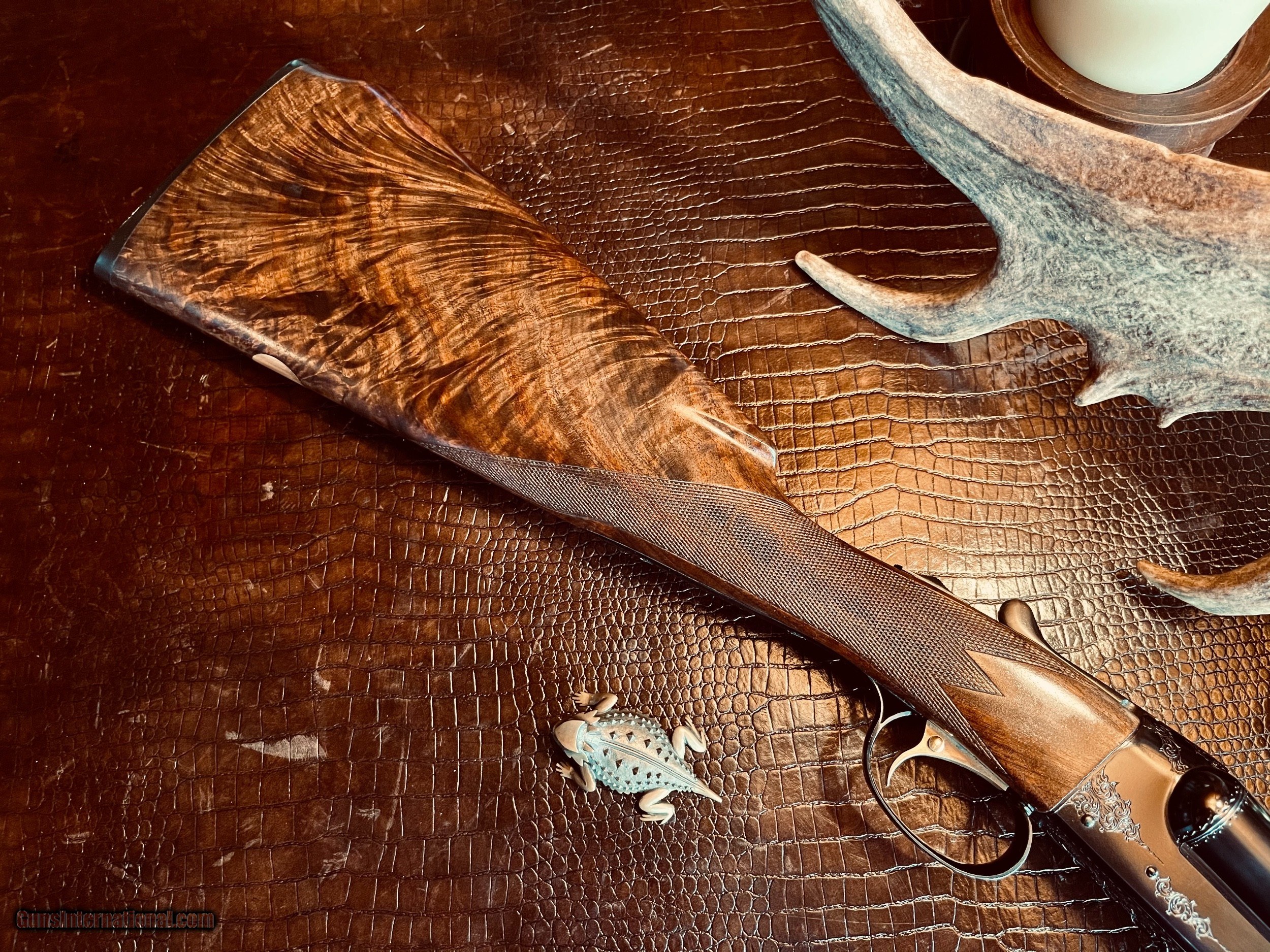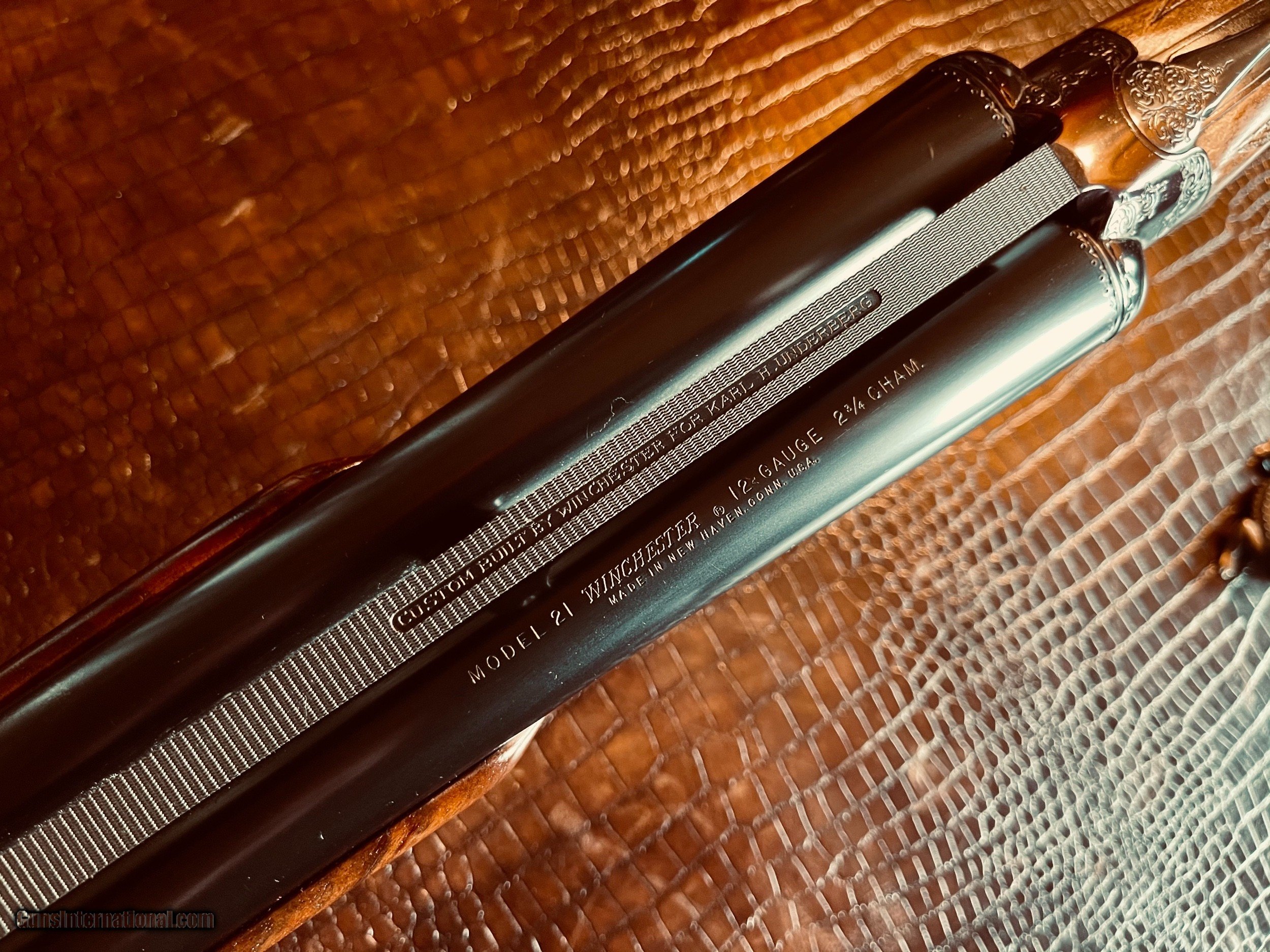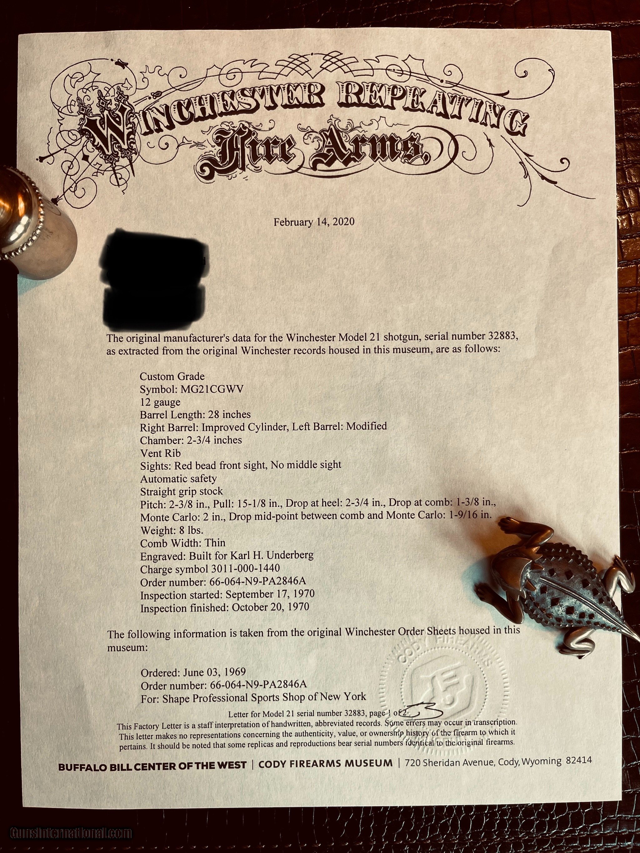 Description: Winchester Model 21 Custom Grade - 12ga - 28” - IC/M - Cody Letter - Special Order Flatside - ca. 1970 - English Grip - Vent Rib - High Condition! 14 1/2 x 1 3/8 x 2 3/4 - 7.13 lbs - SN: W32883 - Further Notes: Factory "Custom Grade", English 2" Monte Carlo Stock, Vacant Gold Oval in Buttstock, Ebony Insert in Forend, Vent Rib, Flatside Receiver with 21-1 Engraving, "Custom Built By Winchester For Karl H. Underberg" on Rib, 2 3/4" Chambers, Red Bradley Bead at Muzzle End, No Middle Bead, 14 1/2" LOP, 1 3/8" Drop at Comb, 2 3/4" Drop at Heel, Beautiful Figured Walnut on Stock and Forend, Jeweled Barrel Flat, Watertable and Forend Iron, Automatic Safety, Winchester Factory Letter The Quillen-Worfe Private Gun Collection - Guns International page – please read prior to making a purchase: