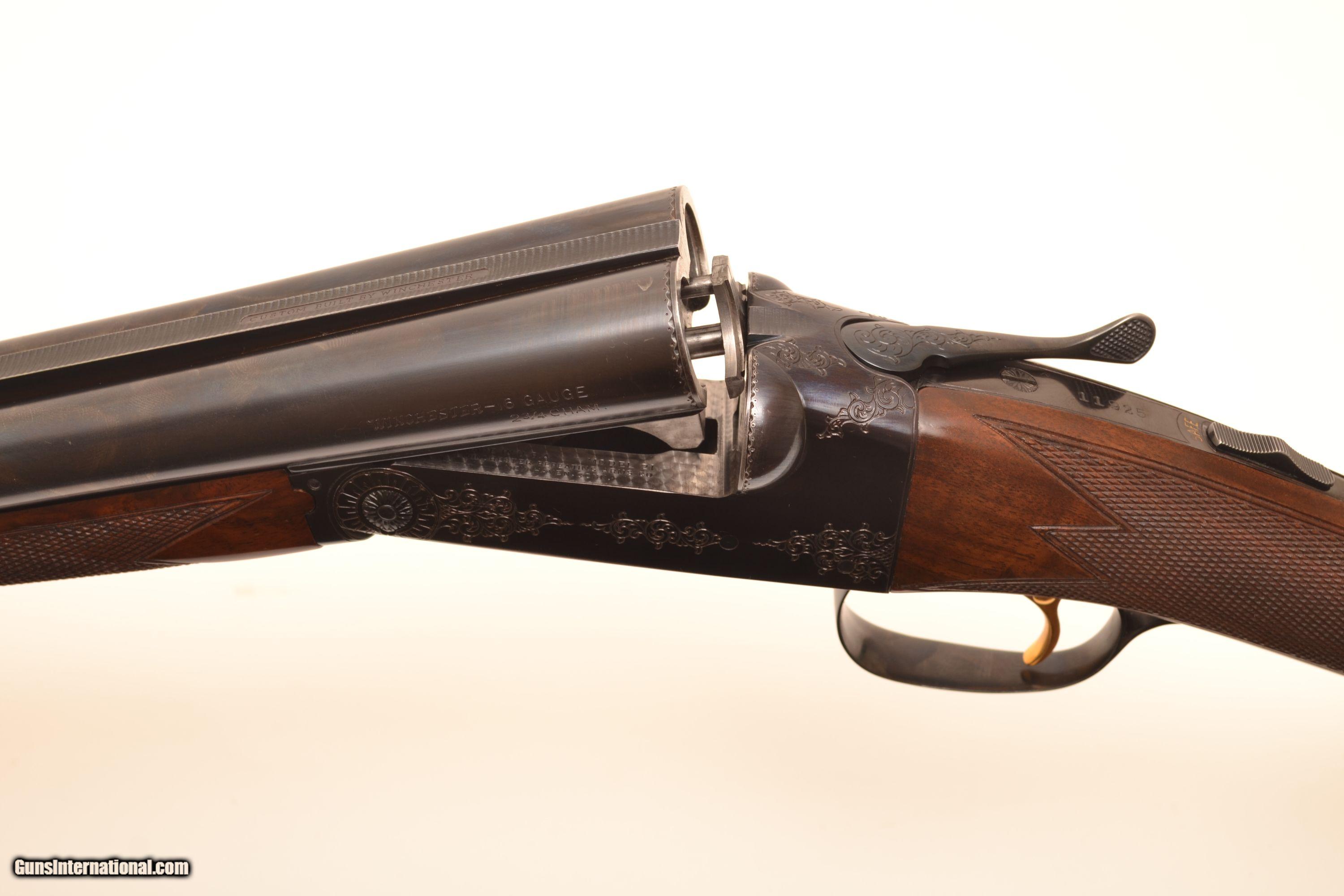 Description: Winchester- Model 21 Custom Grade- 16ga. two barrel set, 26” barrels choked Cyl/Imp Cyl, and 26” barrels choked Mod/Full, fancy straight grip stock, one splinter forend, Winchester custom pattern checkering, factory #1 engraving pattern, flat side round frame receiver, jeweled flats, gold oval, single trigger, automatic ejectors, solid ribs, marked CUSTOM BUILT BY WINCHESTER on ribs, leather covered recoil pad, a phenomenal two barrel set, the gun remains in pristine condition, available for immediate delivery. Inv# 42824 6lbs., 10oz. 14 ¾” x 1 3/8” x 2” $12,500.00 SOLD |