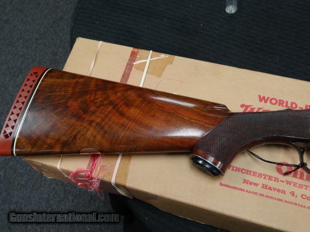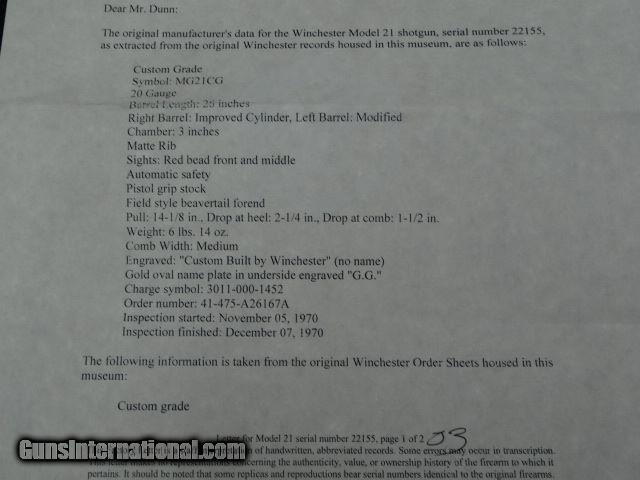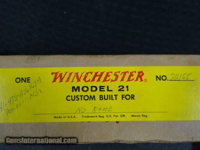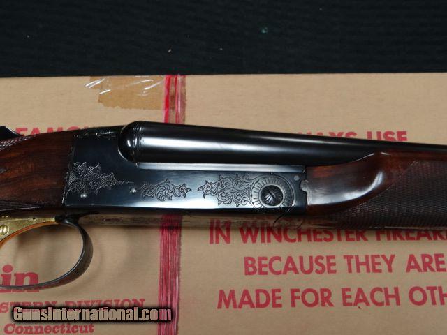 Description: Winchester Model 21 Custom Grade in 20 gauge with 26" matted rib barrels choked IC&M with 3" chambers. Pistol grip stock of beautiful full figure black walnut. 14 1/8 " LOP over original pad. Beavertail forend with ebony inlay at tip. Number 1 engraving on a deep blue action. An outstanding gun made in the Winchester Custom Shop in 1970 . Cody letter outlines all details. Gun remains in 98% + original and unaltered condition in original box serialed top gun. SOLD |