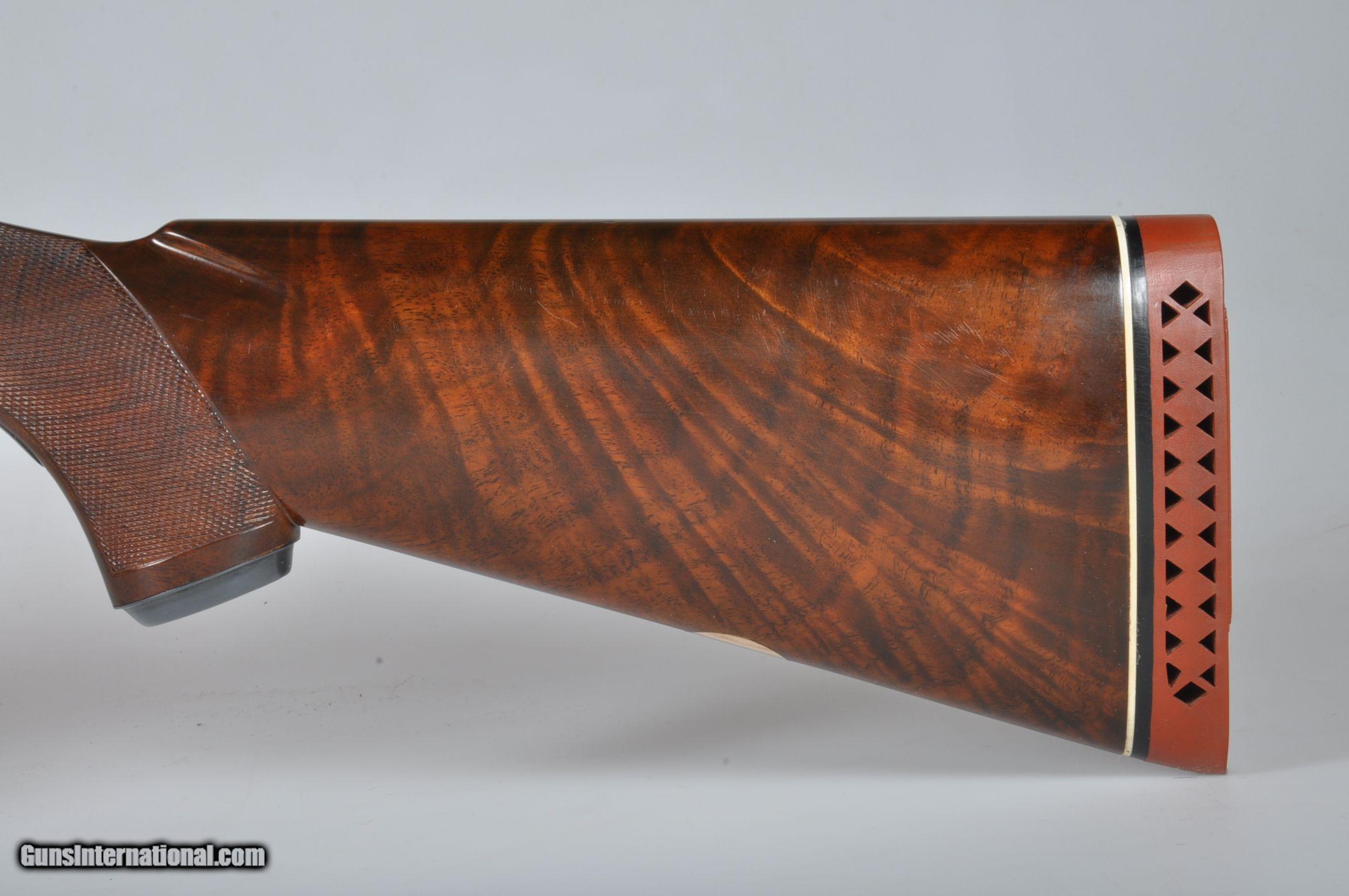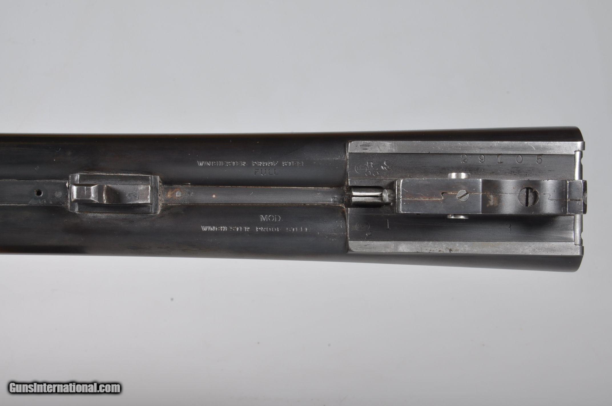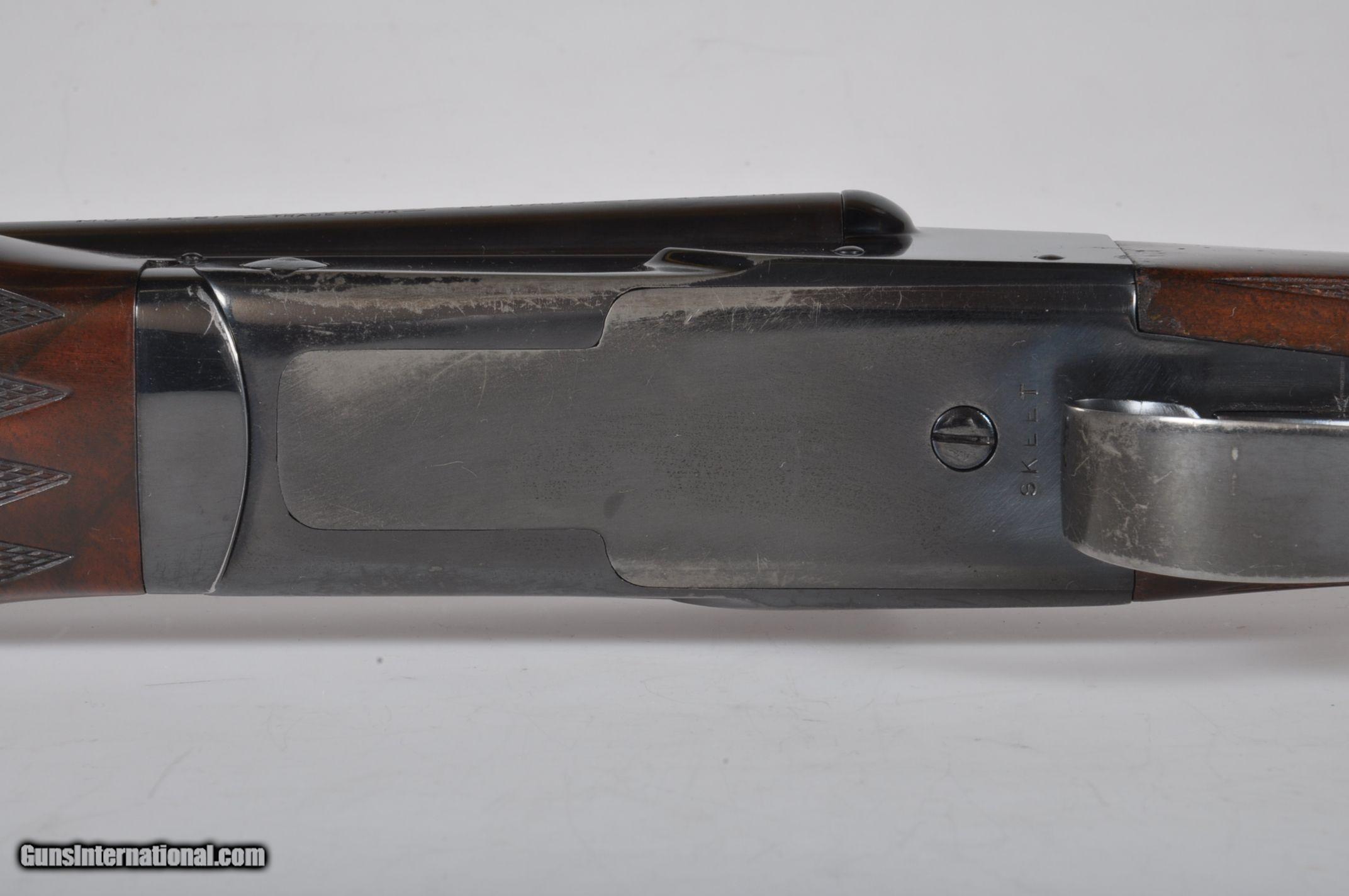 Description: 20 gauge, 28″ barrels, 3″ chambers. Chokes are marked MOD/FULL and measure .014 right and .023 left. Square post ventilated rib with dual white beads. Bores are bright and shiny. Single selective trigger, automatic ejectors, automatic safety. Floorplate is marked SKEET. Pistol grip stock checkered in Deluxe three point pattern with a 13 3/8” length of pull over a vented Winchester recoil pad. Beavertail forearm with roll type release checkered in Deluxe pattern with black wood inset. Condition: Barrels retain 95% original bluing with various light handling marks. Receiver retains 90% original bluing with a couple of small areas of light pitting. Floorplate and forend iron retain 85% original bluing. Trigger guard retains 50% original bluing. The stocks and forearm retain most of their original finish with numerous light handling marks. Drop at comb: 1 3/4”. Drop at heel: 2 13/16”. Weight: 7.1 lbs. Mechanics are excellent. If you are looking for a particular Parker Double or Winchester 21 please email me. We have nearly 1,000 in stock of all gauges and grades. We prefer to communicate by email. We can not accept credit cards for collectible firearms. We have more than 500 Winchester Model 21s in stock in every grade and gauge. We also have hundreds of Parkers, Fox and LC Smith Shotguns so feel free inquire other fine shotguns. SOLD Manufacturer: Winchester Model: 21 Skeet Serial Number: 29105 Chambers: 3 Ejectors: Yes Barrels: 28 Triggers: SST Gauge Info: 20 Stock: Pistol Grip Fore End: Beavertail LOP: 13 3/8 Rib: Ventilated Weight: 7.1 lbs |
