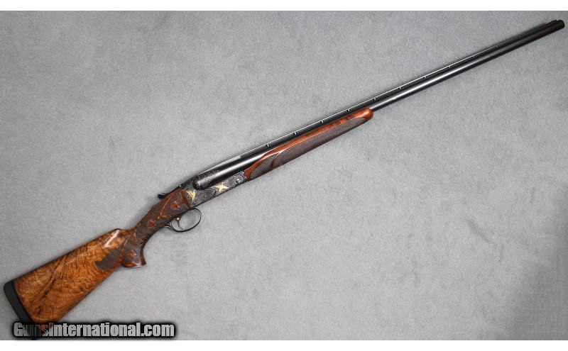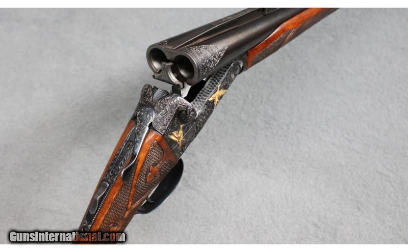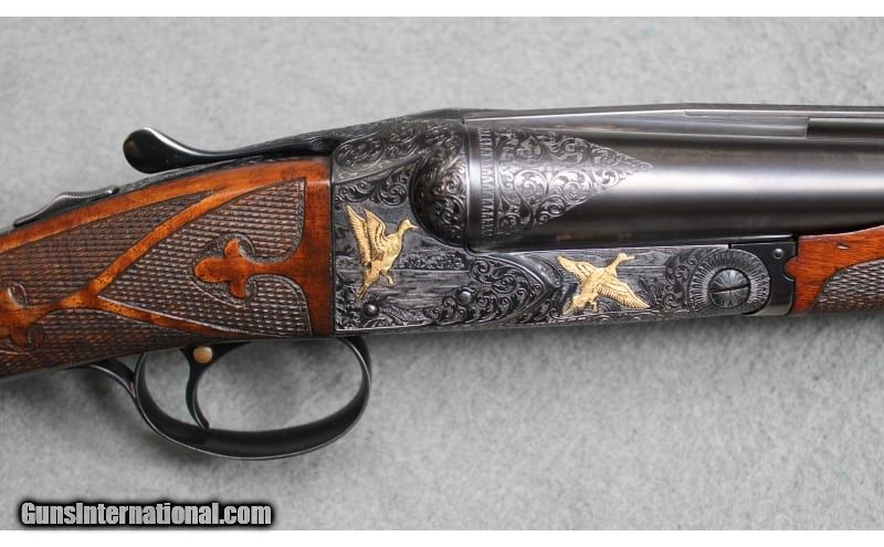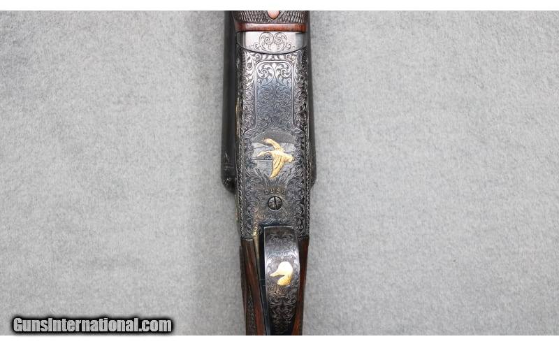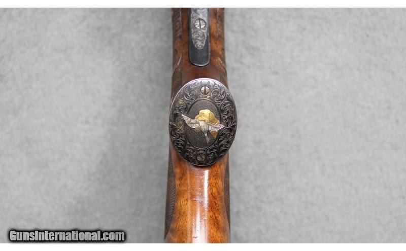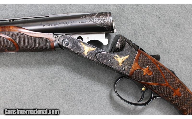 Description: Winchester Model 21 Duck Custom side-by-side shotgun chambered in 12 Gauge. Introduced as a production line gun in 1931 and moved to the Custom Shop in 1960, the Model 21 was one of Winchester's finest efforts with regard to quality, reliability, and strength. Duck Guns were manufactured from 1940 to 1952 and this piece is estimated to have been produced in 1949. Features include 32-inch blued barrels with light scroll engraving at the breach and white mid bead on a ventilated rib. The front bead is missing. The action, trigger guard, break lever, and forearm hardware are very nicely relief floral scroll engraved with an oval panel on each side of a wooded marsh scene with a gold inlaid ducks. Gold inlayed retriever with a duck in its mouth on the grip cap. No accessories. 12 Gauge SOLD Chambers: 3 inch Metal Condition: Very Good with Minor Handling Marks Wood Condition: Very Good with Minor Handling Marks Bore Condition: Bright And Clear with No Pitting Barrels: 32 inch Triggers: Single Selectable Stock Dimensions: 14 inch LoP Butt Pad: Rubber Sights: Missing Front and White Mid Bead on Ventilated Rib Chokes: Fixed IM / IM Item Location: Fort Worth, TX |