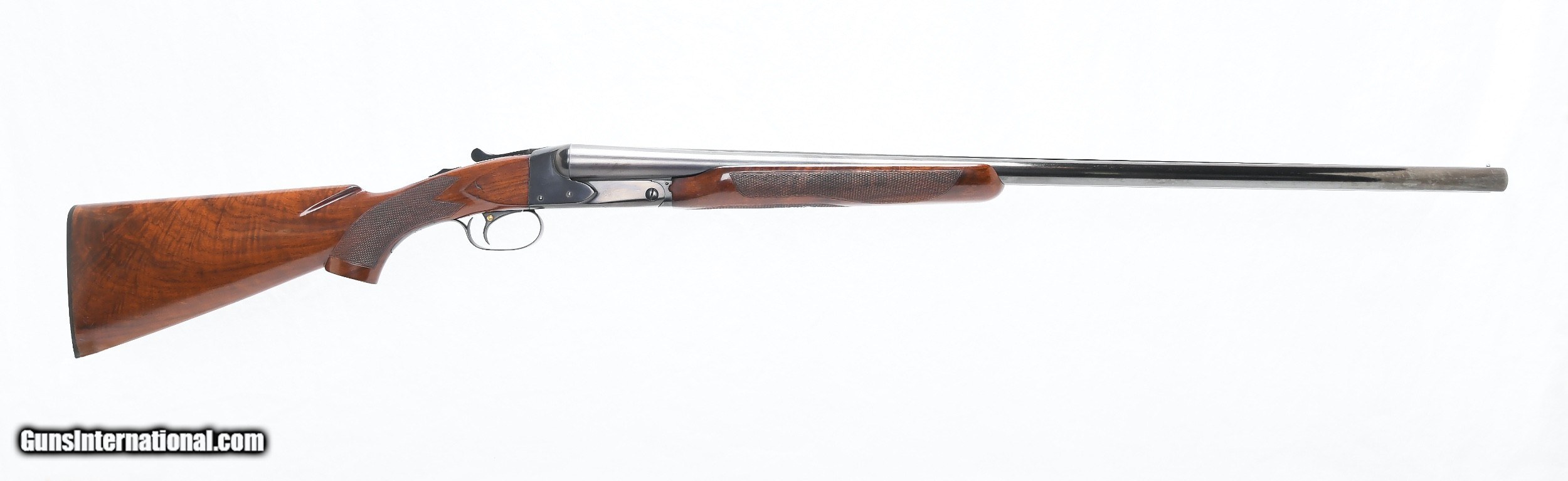 Description: SOLD Winchester Model 21 12 gauge SxS field grade shotgun. The iconic American double, the venerable Model 21. This gun was made during the 1950’s and for many 21 enthusiasts the 50’s was the “Golden” era of these guns! This one has 30” barrels with a solid rib and chokes marked M/F, however the chokes measure .012” and .038” (IC & XF) with bores of .733” and wall thicknesses of .036” and 2 ¾” chambers with perfect bores. The handsomely figured walnut pistol grip buttstock has a 14” LOP to the factory buttplate, 1 ½” DAC and 2 3/8” DAH with neutral cast. The beavertail forearm is original to gun and matches the buttstock perfectly in figure, fit and finish. Mechanically excellent. Metal was professionally redone years ago and is fading in places. Wood finish appears to be original and in fine condition. Weighs 7 lbs. 9 oz. It balances well between the hands and it would be ideal for SxS sporting clays. $3,850.00 SN: 20297 SOLD |
