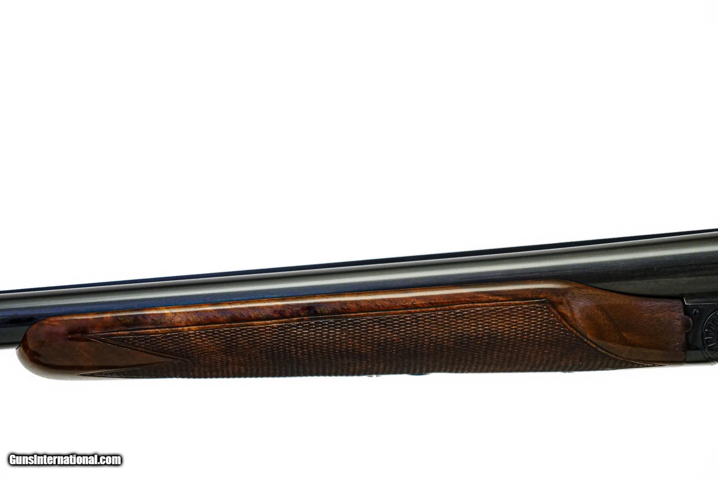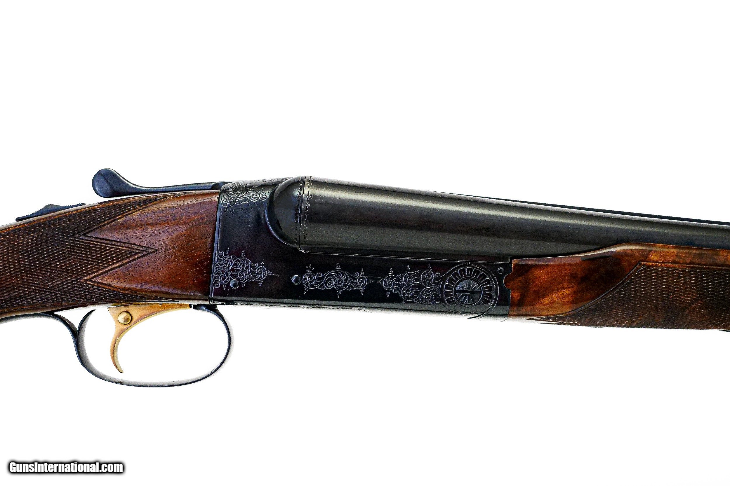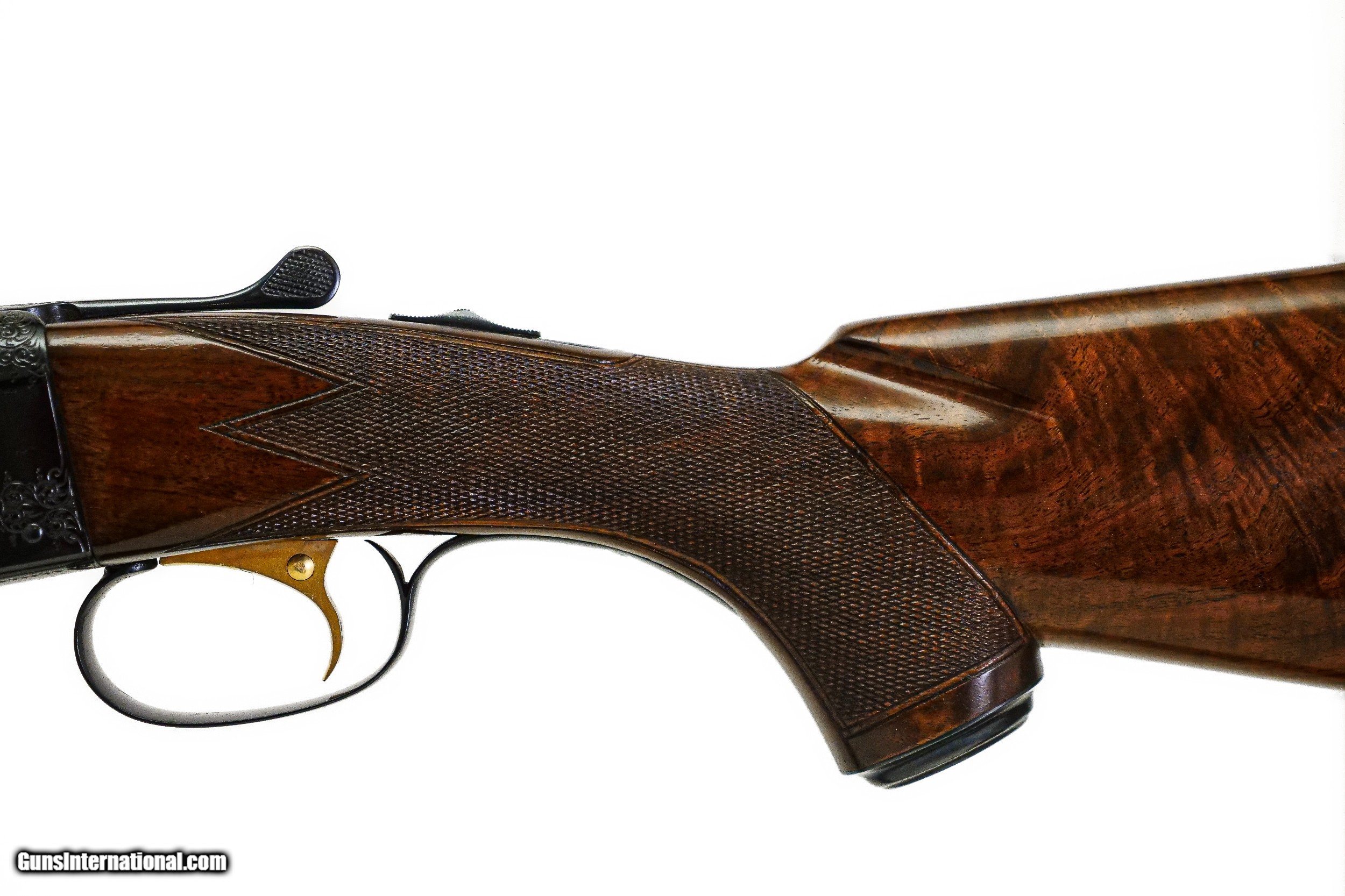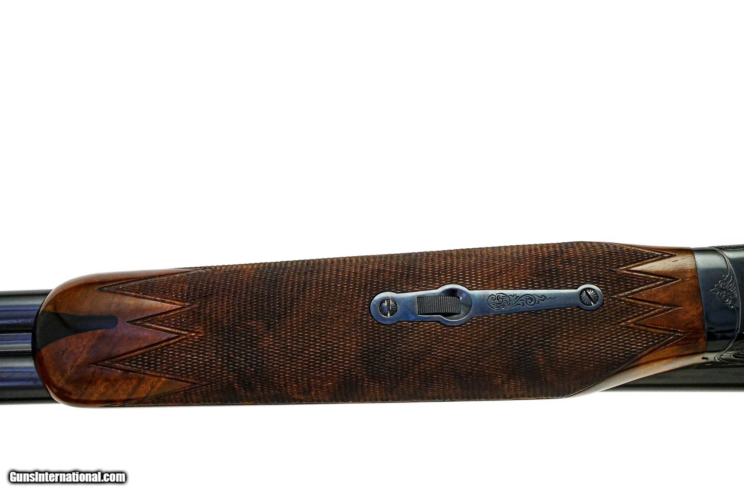 Description: Winchester - Model 21, Flatside Custom, #1 Engraving Pattern, 12ga. Factory Two Barrel Set, 26" IC/IC & 26" M/M. Solid ribs marked CUSTOM BUILT BY WINCHESTER FOR LGC, full fancy feathercrotch American black walnut metal capped pistol grip stock, Winchester leather covered recoil pad, gold single selective trigger, automatic ejectors, one beavertail forend with ebony insert, Winchester custom pattern checkering, jeweled flats, white Bradley front sight, 99% everything, near new and perfect gun, original factory box, available for immediate delivery. S & H - $50.00. CT Shotgun/Galazan buys, sells and trades the world’s largest inventory of Model 21 shotguns. We are experts in all phases of buying, selling and repairing as well as restoration of these very complex guns. We purchased the Winchester custom shop from U.S. Repeating Arms Company, And we are the sole authorized repair facility for the Model 21. We also carry all accessories, original style cases and recoil pads. Inv: 51766 7 lbs. 2 oz. 14”x 1 ½” x 2 5/8” $14,999.00 SOLD |