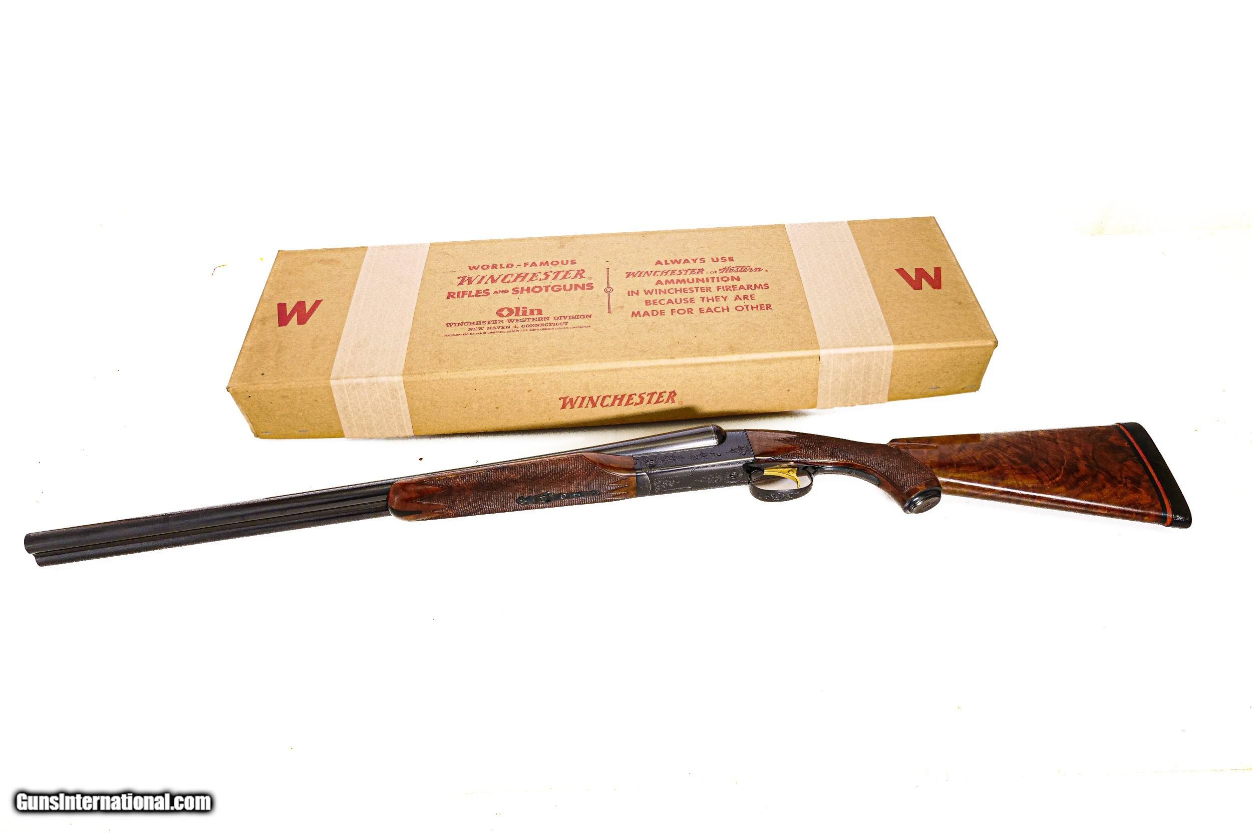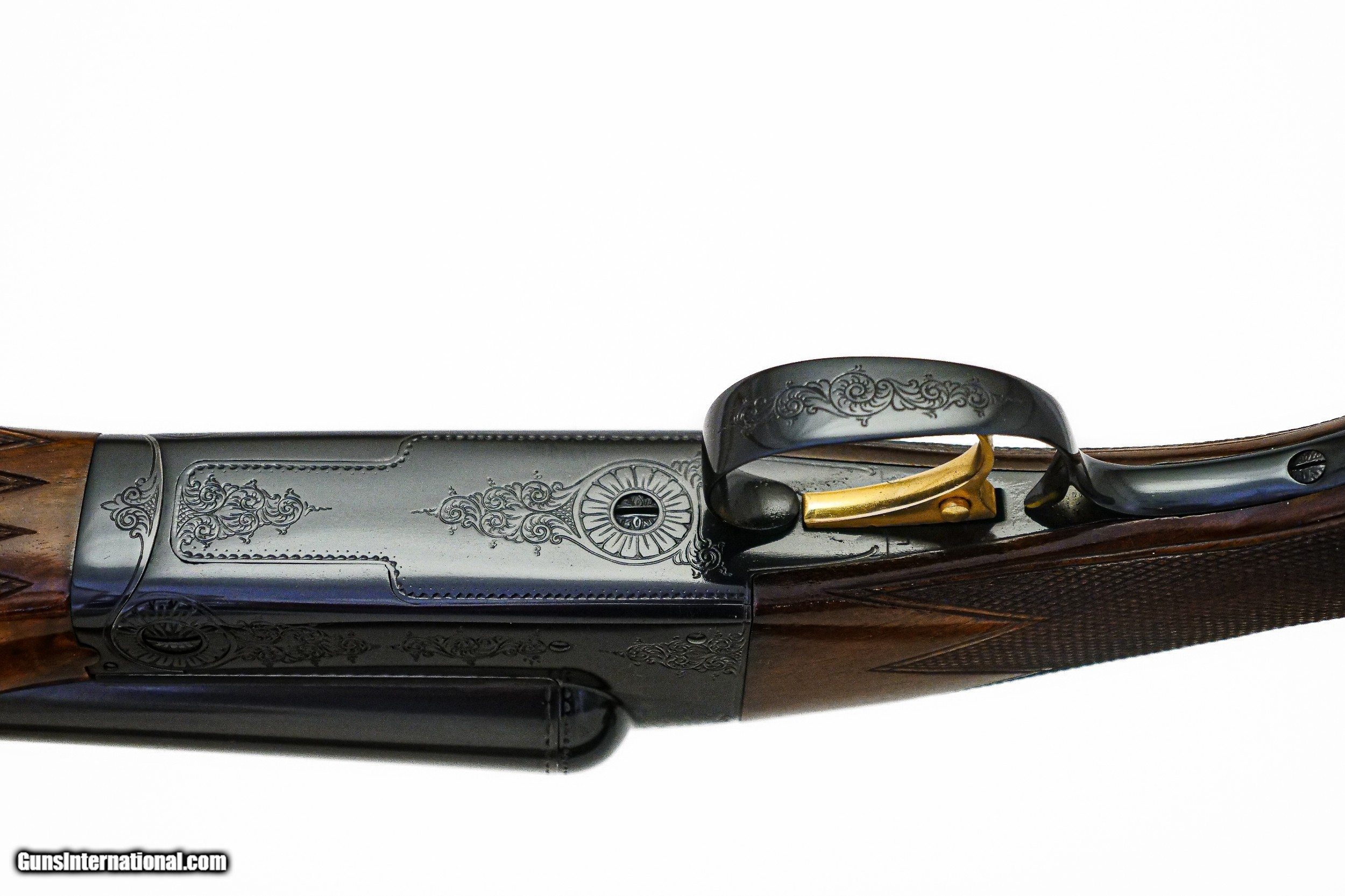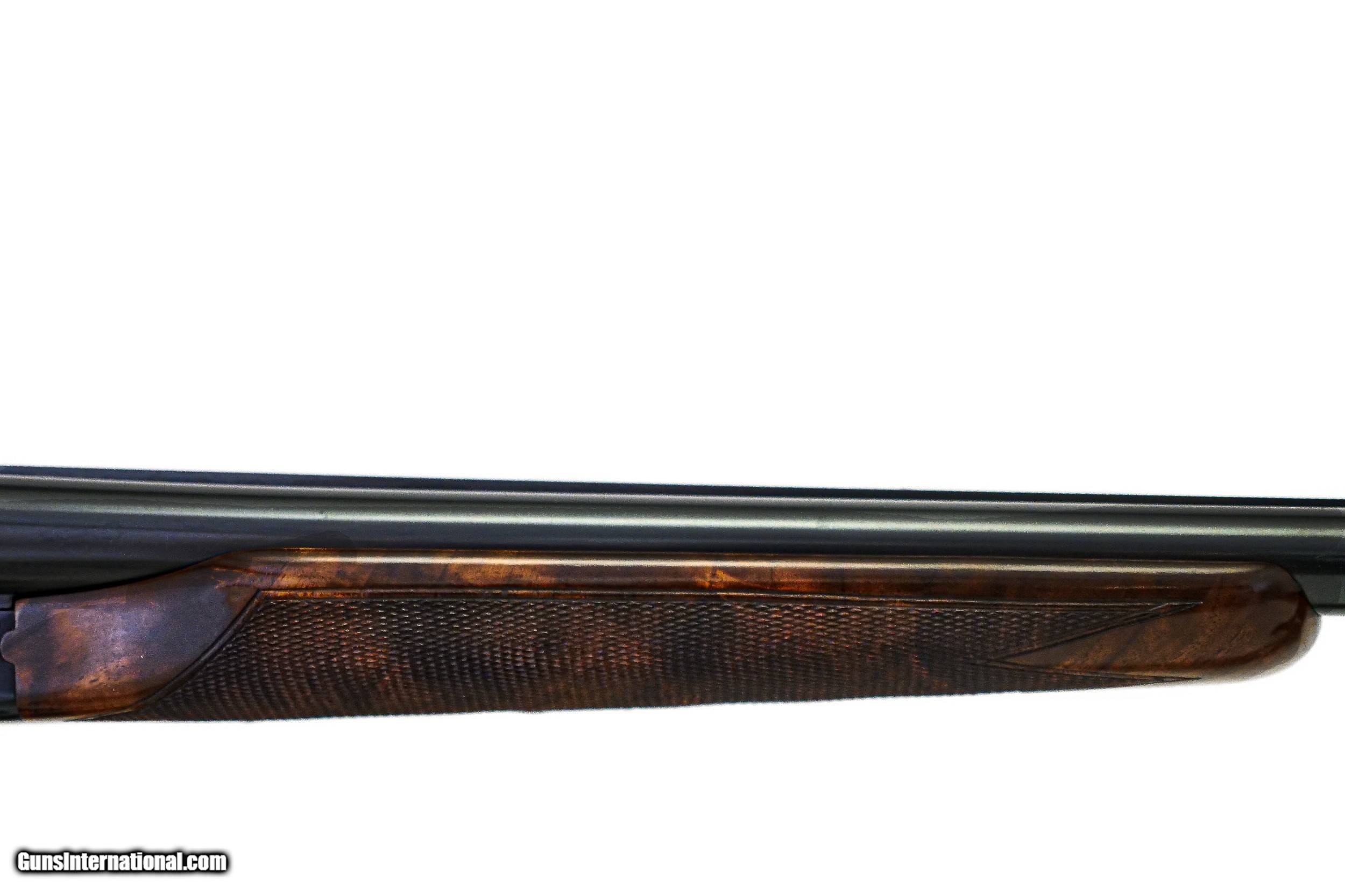 Description: Winchester - Model 21, Flatside Custom, #1 Engraving Pattern, 12ga. Factory Two Barrel Set, 26" IC/IC & 26" M/M. Solid ribs marked CUSTOM BUILT BY WINCHESTER FOR LGC, full fancy feathercrotch American black walnut metal capped pistol grip stock, Winchester leather covered recoil pad, gold single selective trigger, automatic ejectors, one beavertail forend with ebony insert, Winchester custom pattern checkering, jeweled flats, white Bradley front sight, 99% everything, near new and perfect gun, original factory box, available for immediate delivery. S & H - $50.00. CT Shotgun/Galazan buys, sells and trades the world’s largest inventory of Model 21 shotguns. We are experts in all phases of buying, selling and repairing as well as restoration of these very complex guns. We purchased the Winchester custom shop from U.S. Repeating Arms Company, And we are the sole authorized repair facility for the Model 21. We also carry all accessories, original style cases and recoil pads. Inv: 51766 7 lbs. 2 oz. 14”x 1 ½” x 2 5/8” $14,999.00 SOLD |