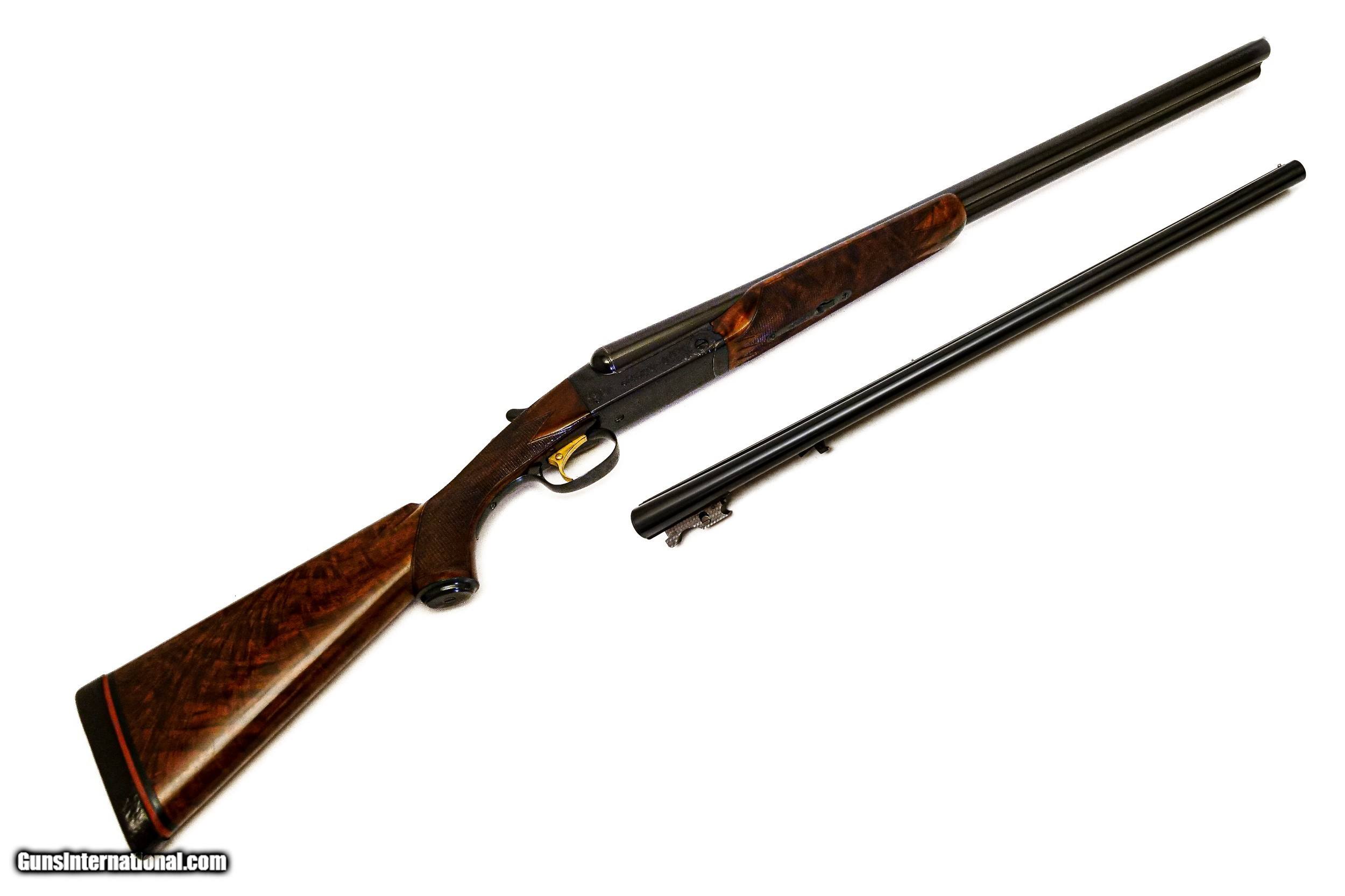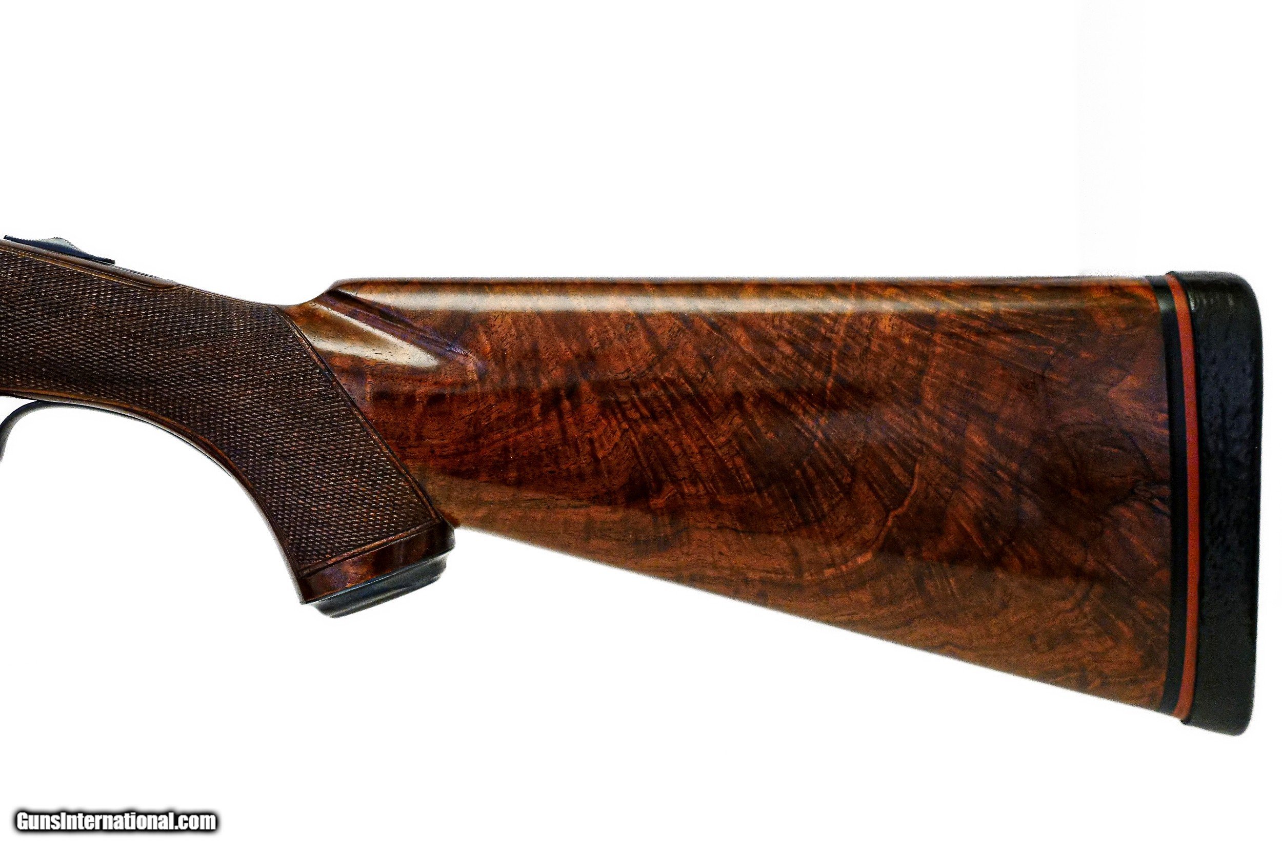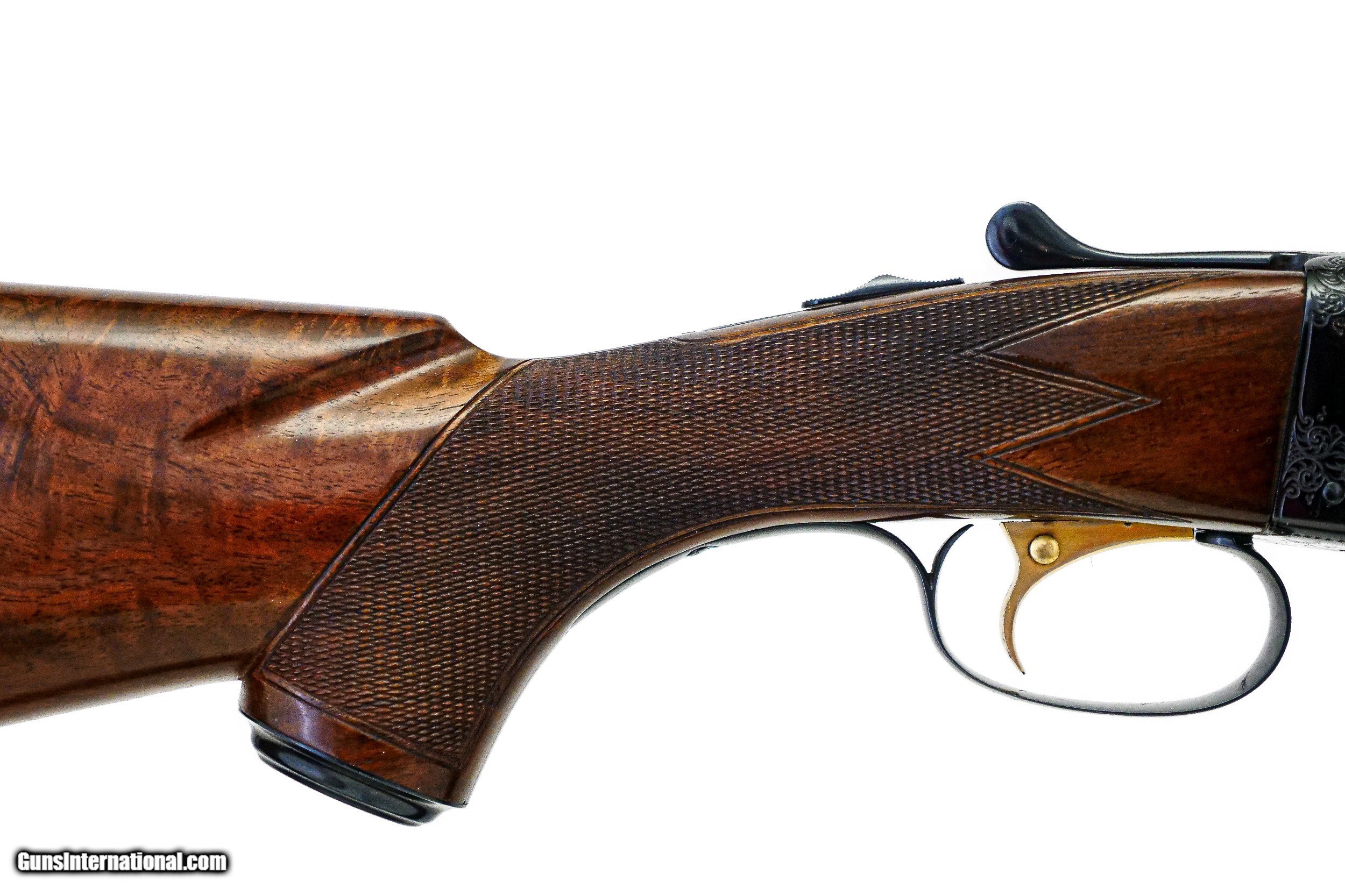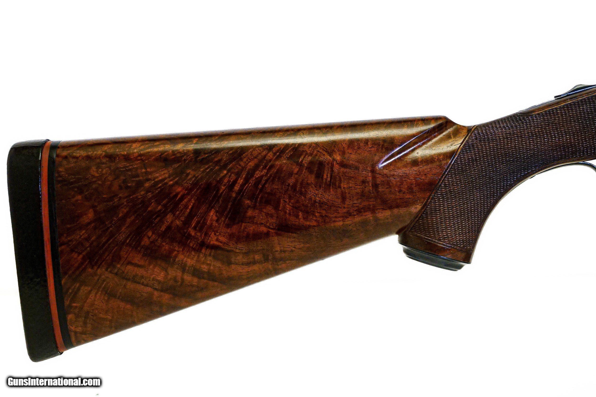 Description: Winchester - Model 21, Flatside Custom, #1 Engraving Pattern, 12ga. Factory Two Barrel Set, 26" IC/IC & 26" M/M. Solid ribs marked CUSTOM BUILT BY WINCHESTER FOR LGC, full fancy feathercrotch American black walnut metal capped pistol grip stock, Winchester leather covered recoil pad, gold single selective trigger, automatic ejectors, one beavertail forend with ebony insert, Winchester custom pattern checkering, jeweled flats, white Bradley front sight, 99% everything, near new and perfect gun, original factory box, available for immediate delivery. S & H - $50.00. CT Shotgun/Galazan buys, sells and trades the world’s largest inventory of Model 21 shotguns. We are experts in all phases of buying, selling and repairing as well as restoration of these very complex guns. We purchased the Winchester custom shop from U.S. Repeating Arms Company, And we are the sole authorized repair facility for the Model 21. We also carry all accessories, original style cases and recoil pads. Inv: 51766 7 lbs. 2 oz. 14”x 1 ½” x 2 5/8” $14,999.00 SOLD |
