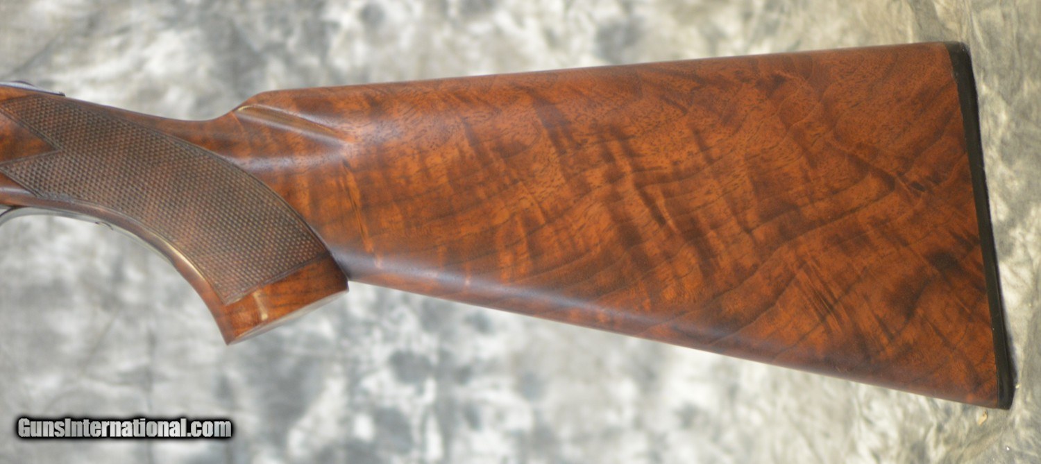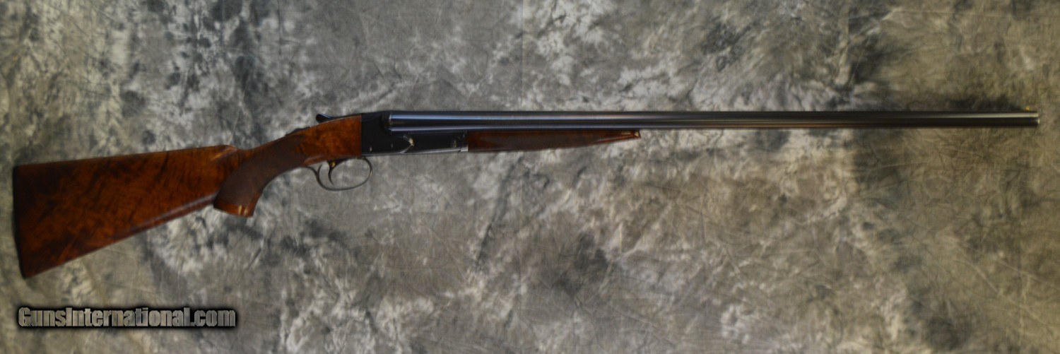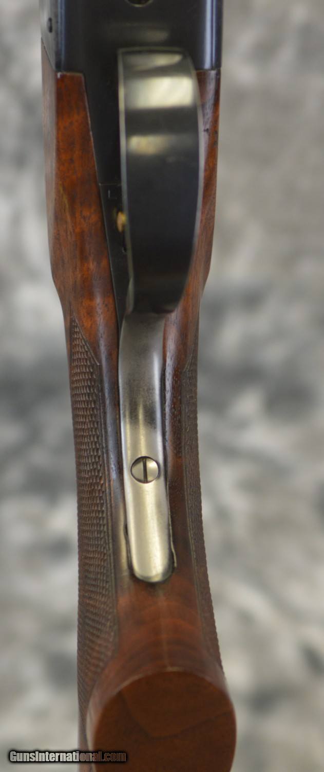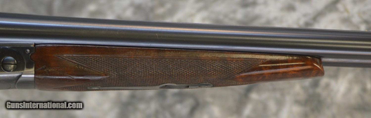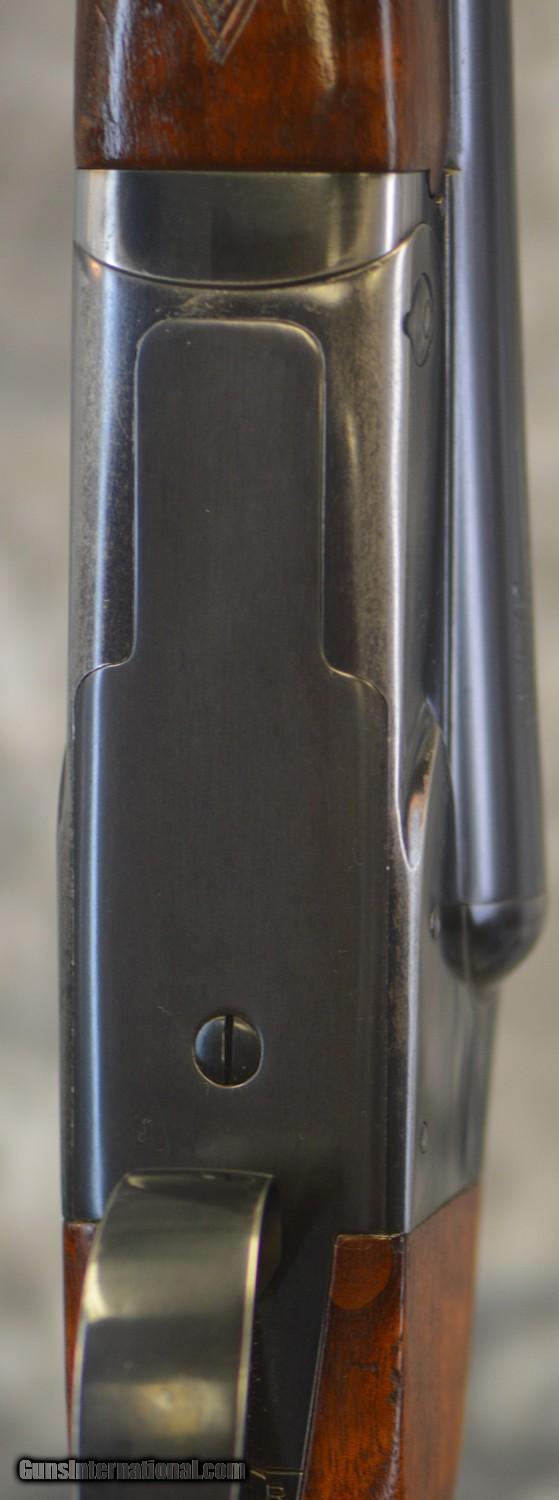Description: Pre-Owned Winchester Model 21 Game with 28" fixed choke (Mod/Full) barrels, solid concave rib. Factory blued, scalloped receiver with bluing wear on edges of action and trigger guard/tang. Original factory bluing. Single, selective trigger, ejectors. Factory pistol grip stock to factory butt plate and splinter forearm. Handling marks in stock and forearm, minor bluing wear on barrels. 100% original condition, does not include case. SOLD |