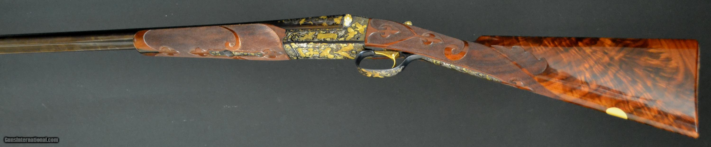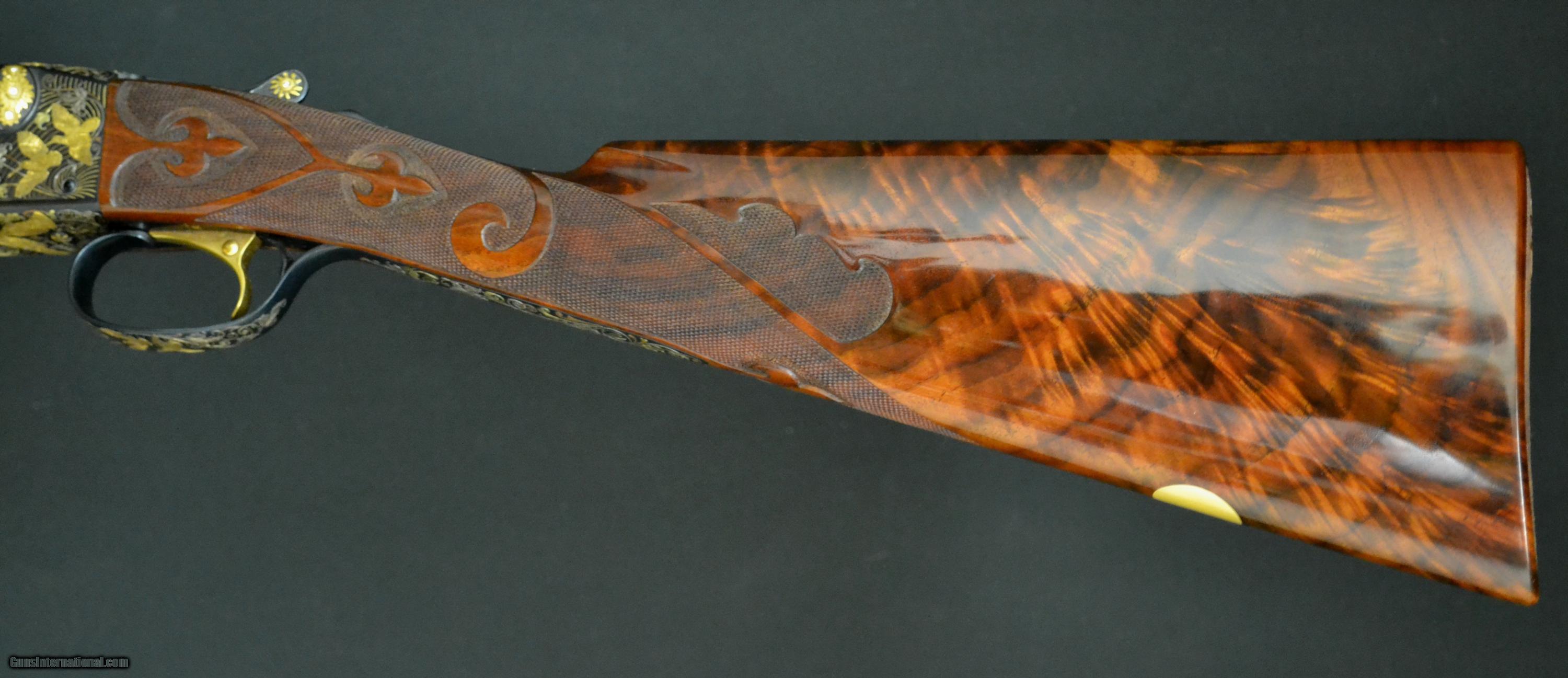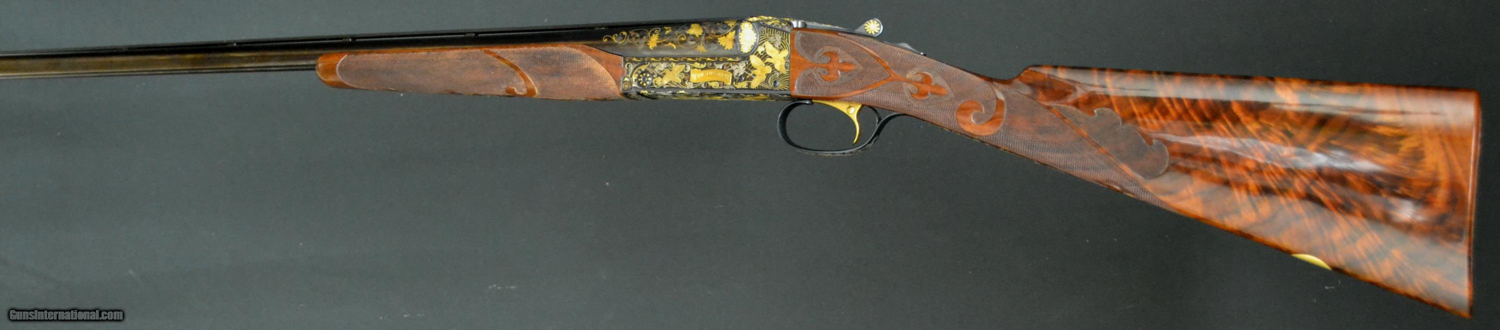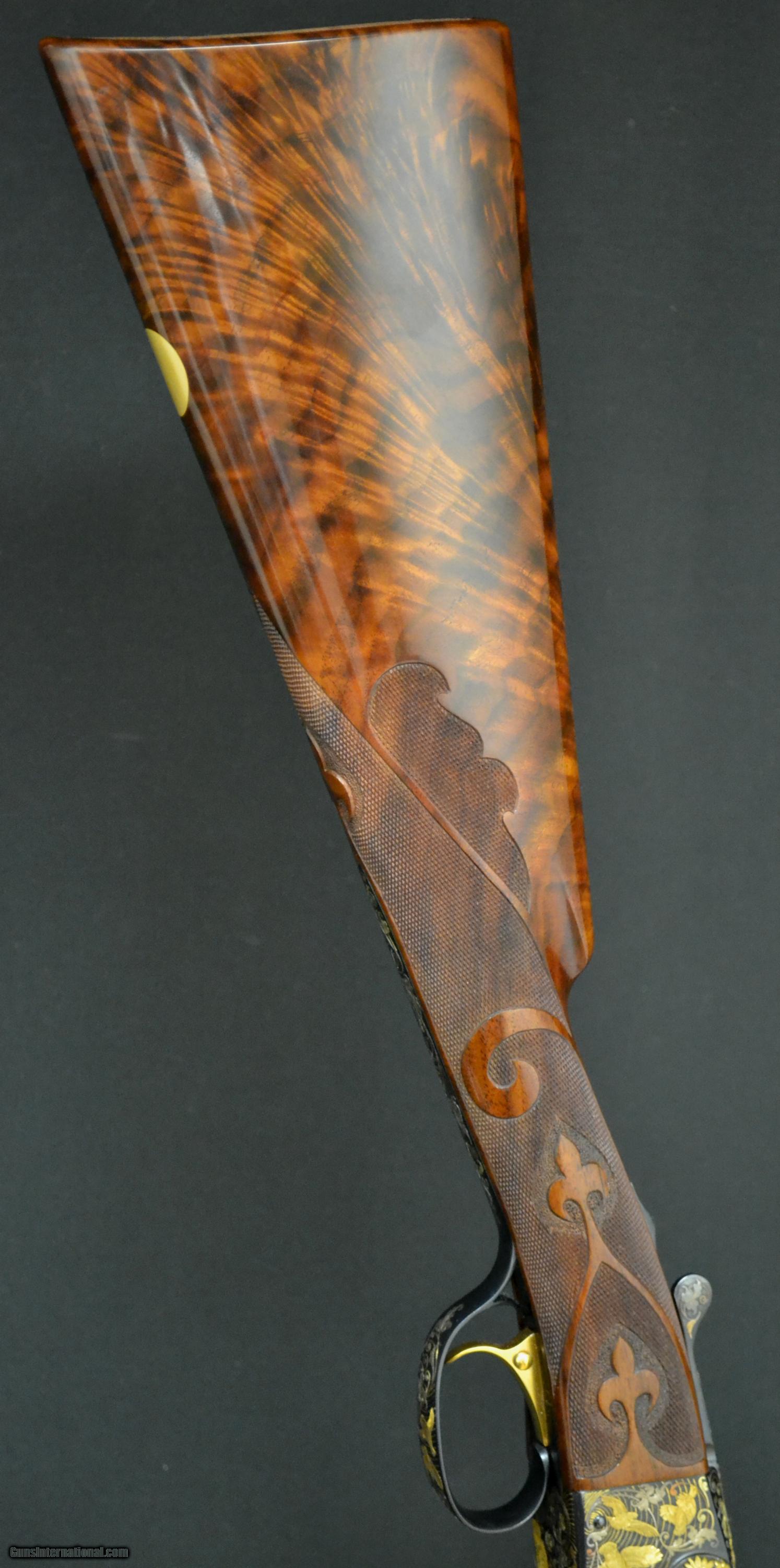 Description: WINCHESTER- Model 21 Grand Royal, The most important American shotgun ever offered for sale, 3 barrel set, 20/28/.410 gauge, 26” barrels choked IC/M, AAA fancy feather American black walnut straight grip stock to a checkered butt, beavertail forends with ebony tips, B-Carve checkering pattern, single selective trigger, automatic ejectors, automatic safety, engine turned flats, round frame scalloped receiver with lightening cuts on water table, full coverage engraving featuring Winchester ribbons, gold inlayed woodcock, grouse, and quail surrounded by multi colored gold scroll and encrusted diamonds over a blued receiver, multi colored gold breech and muzzle wedges on barrels. An opportunity to possess one of the most important and historically significant Model 21’s ever made, this is an authentic Winchester Model 21, the most elaborate ever made, 20 years in the making, we were selected to sell this gun. This gun marks the end of an era of the old Winchester production, not only is it a Grand Royal but it is also the last of the Winchester production, there were two of these that were ordered, they were to be the most ornate Winchesters ever made, a center piece of any collection or on its own. This is the very best, one of the finest names in gun making and their premier products, made under the direction of John Olin to be the most ornate shotgun ever made, complete factory documentation including Cody and Browning letters and the designs for the engraving from John Olin, cradling to grave documentation, for someone that demands and appreciates the very best double guns, an extraordinary and rare opportunity, there is no equal to this gun in any gun collection, the finest piece by all regards. Inv# 22283 14” x 1 ½” x 2 ¼” $250,000.00 SOLD |