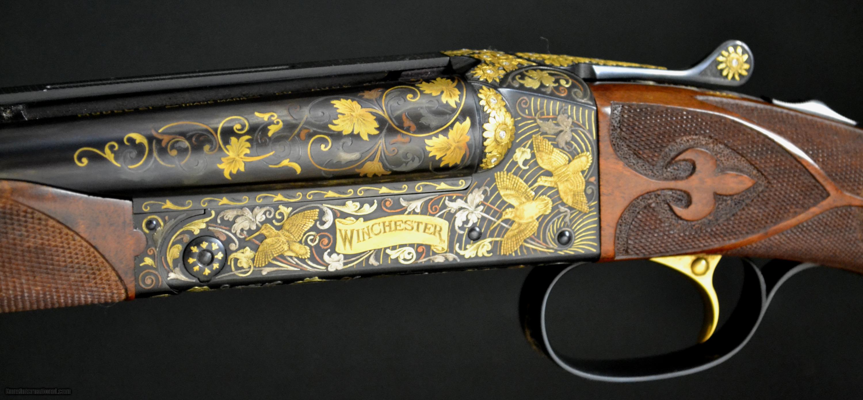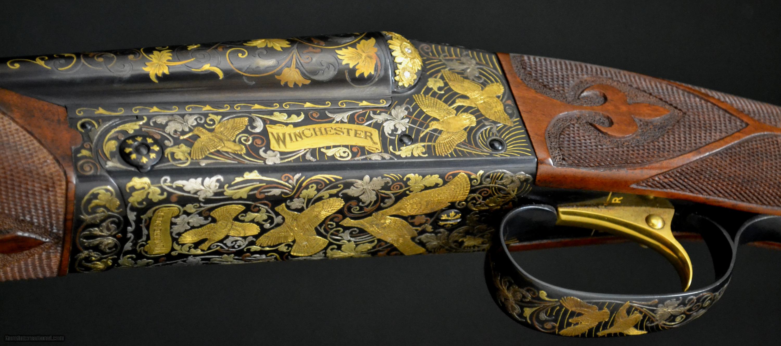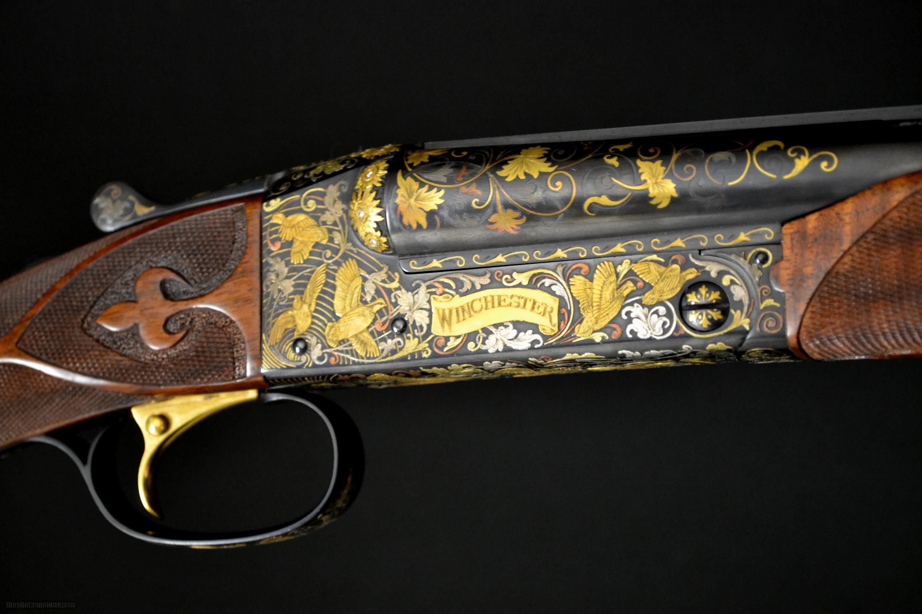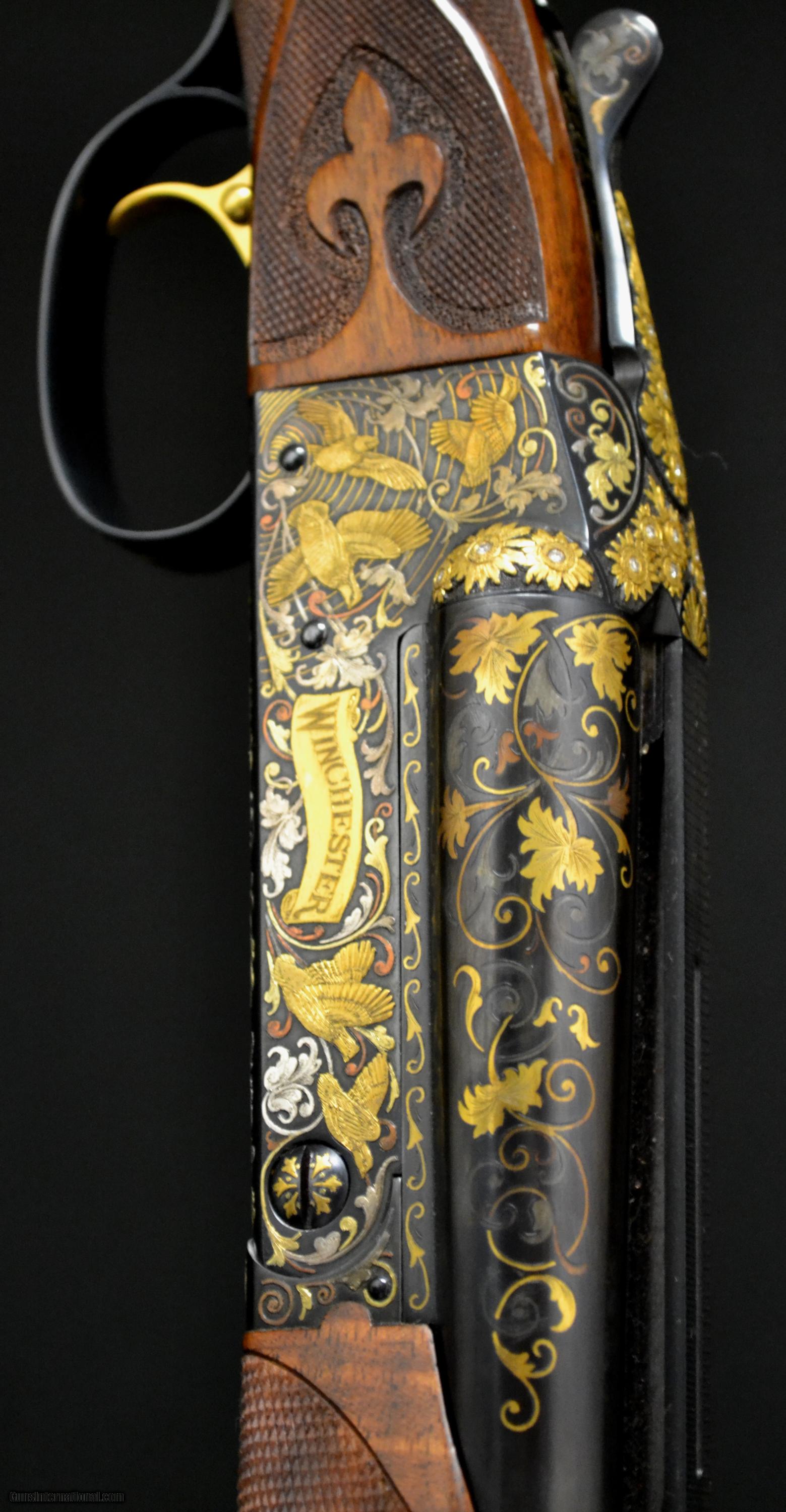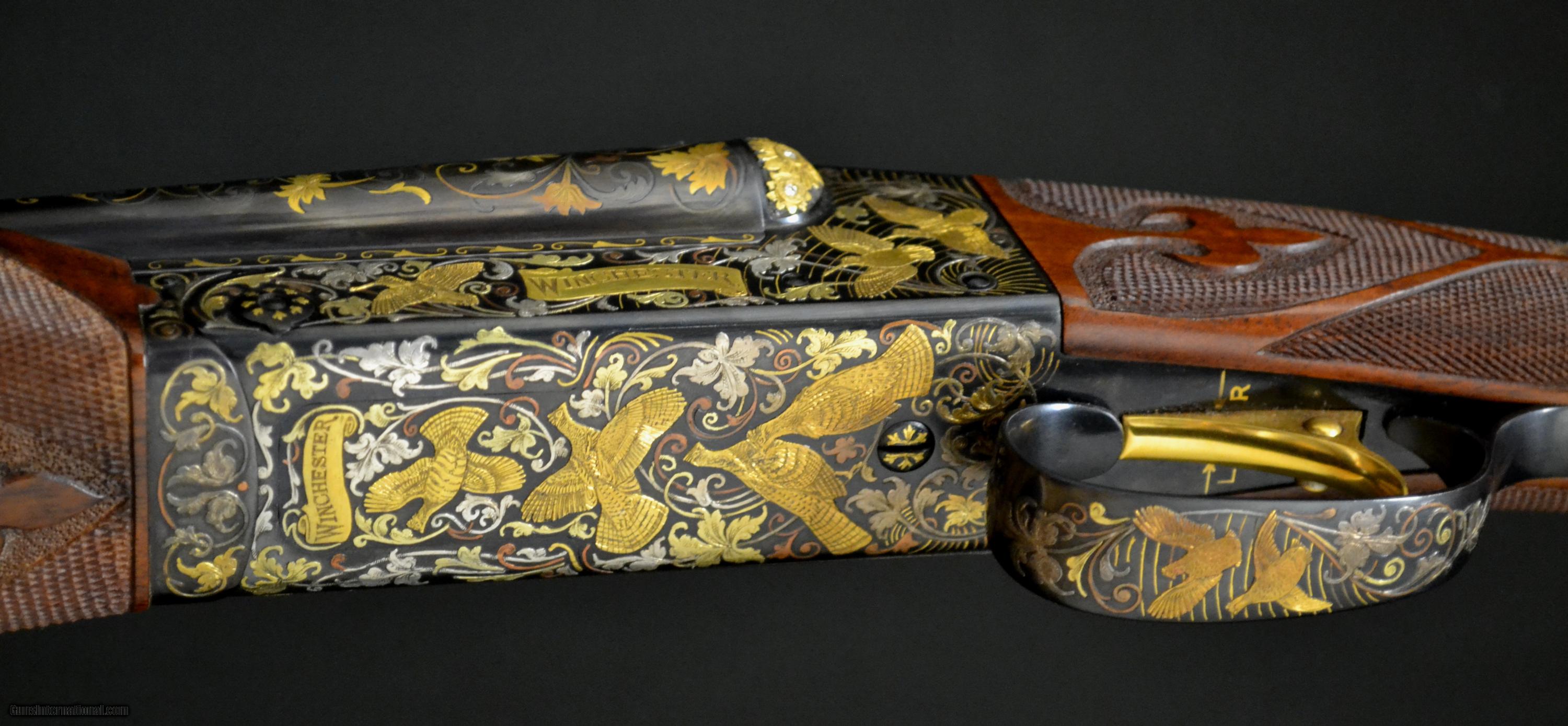 Description: WINCHESTER- Model 21 Grand Royal, The most important American shotgun ever offered for sale, 3 barrel set, 20/28/.410 gauge, 26” barrels choked IC/M, AAA fancy feather American black walnut straight grip stock to a checkered butt, beavertail forends with ebony tips, B-Carve checkering pattern, single selective trigger, automatic ejectors, automatic safety, engine turned flats, round frame scalloped receiver with lightening cuts on water table, full coverage engraving featuring Winchester ribbons, gold inlayed woodcock, grouse, and quail surrounded by multi colored gold scroll and encrusted diamonds over a blued receiver, multi colored gold breech and muzzle wedges on barrels. An opportunity to possess one of the most important and historically significant Model 21’s ever made, this is an authentic Winchester Model 21, the most elaborate ever made, 20 years in the making, we were selected to sell this gun. This gun marks the end of an era of the old Winchester production, not only is it a Grand Royal but it is also the last of the Winchester production, there were two of these that were ordered, they were to be the most ornate Winchesters ever made, a center piece of any collection or on its own. This is the very best, one of the finest names in gun making and their premier products, made under the direction of John Olin to be the most ornate shotgun ever made, complete factory documentation including Cody and Browning letters and the designs for the engraving from John Olin, cradling to grave documentation, for someone that demands and appreciates the very best double guns, an extraordinary and rare opportunity, there is no equal to this gun in any gun collection, the finest piece by all regards. Inv# 22283 14” x 1 ½” x 2 ¼” $250,000.00 SOLD |