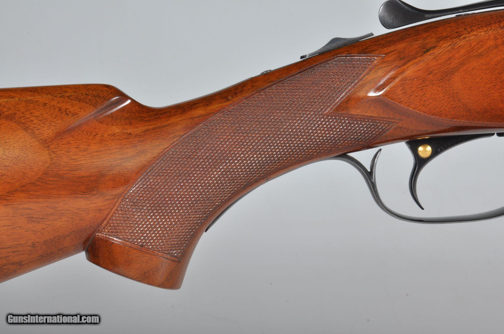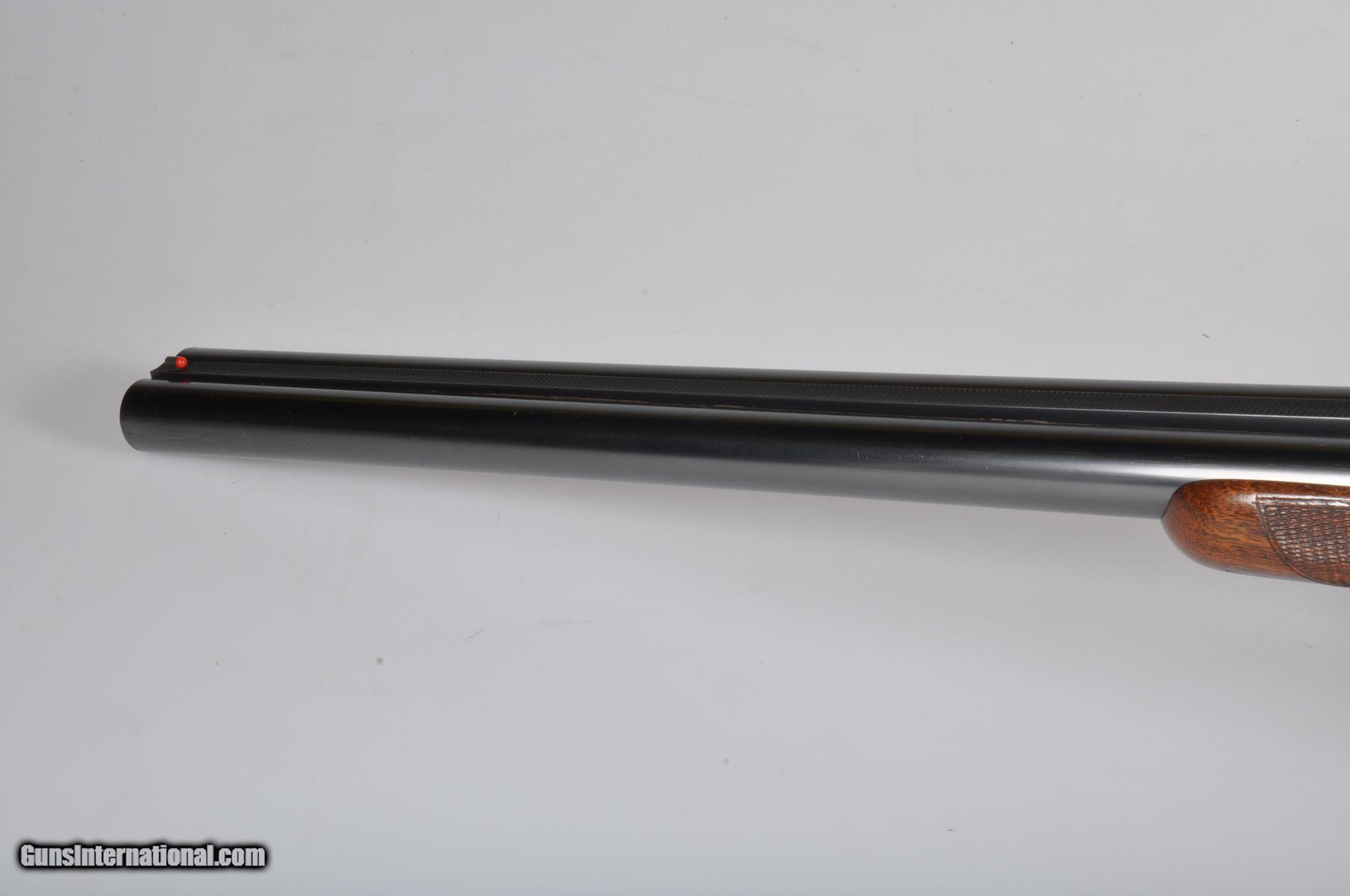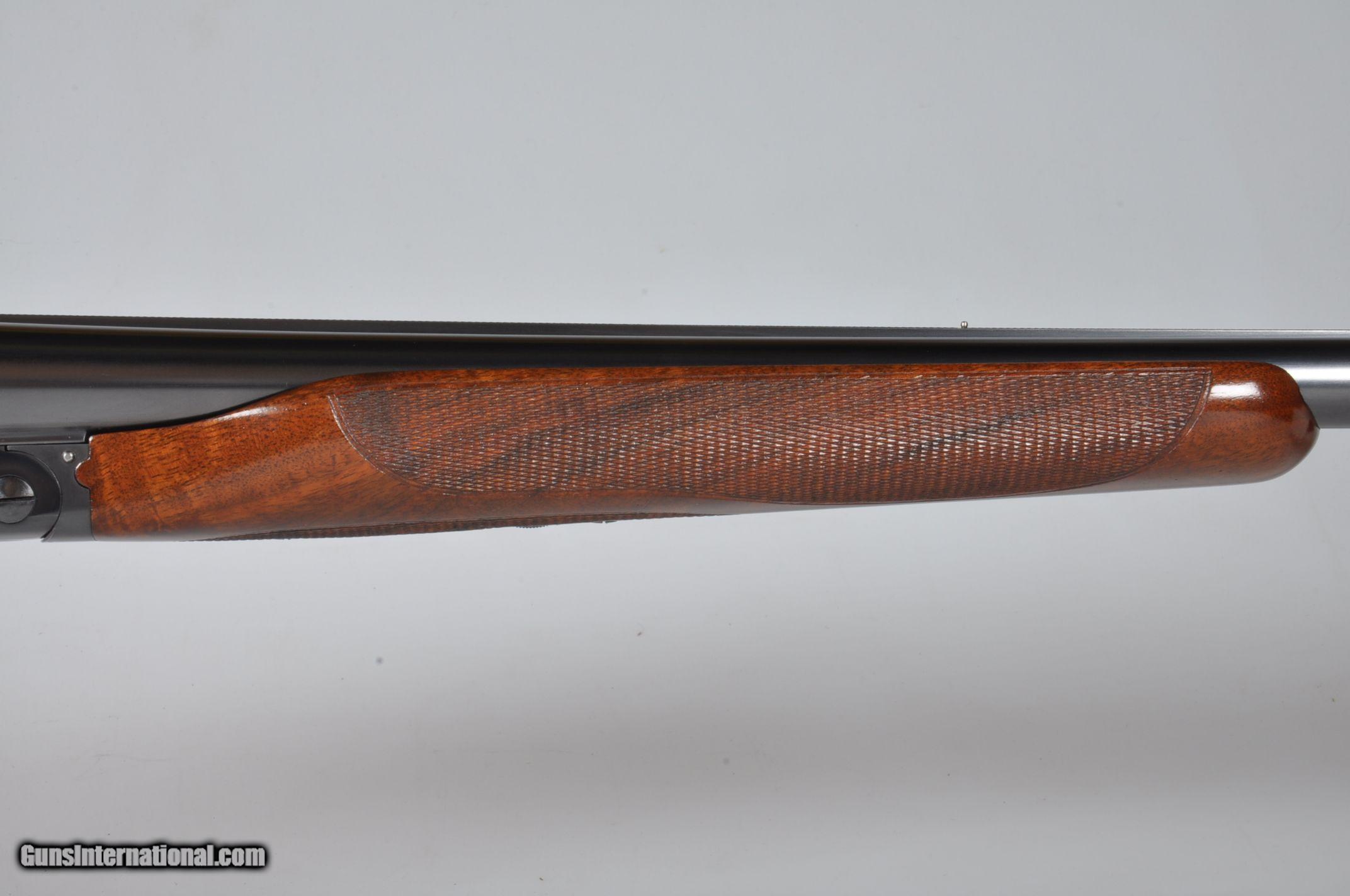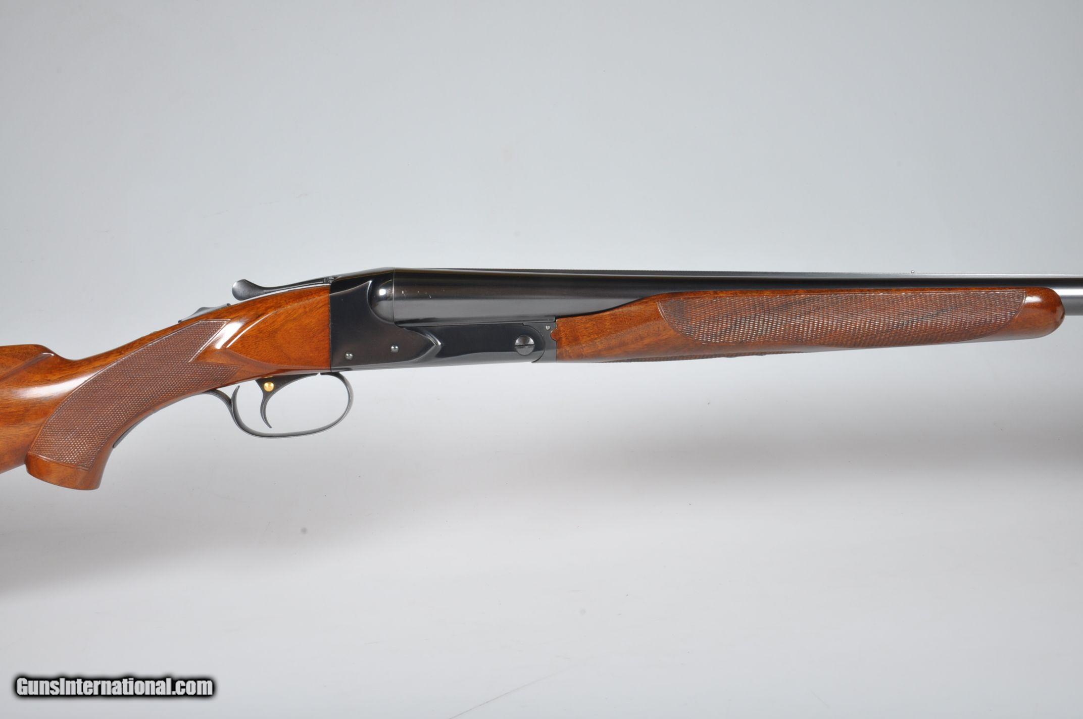 Description: 12 gauge, 26″ barrels, 2 3/4″ chambers. Chokes are marked WS-1/WS-2 and measure +.015 right and .011 left. Full length matted rib with silver mid and red front beads. Bores are bright and shiny. Single selective trigger, automatic ejectors, non-automatic safety. Floorplate is marked SKEET. Pistol grip stock checkered in two point pattern with a 13 7/8” length of pull over a checkered butt. Beavertail forearm with roll type release checkered in Kidney pattern. Condition: All metal retains 95-99% original bluing with the exception of the floorplate which retains 85% original bluing. The stocks retain most of their original finish with a few light handling marks. Drop at comb: 1 3/4”. Drop at heel: 2 5/8”. Weight: 7.2 lbs. Mechanics are excellent. We prefer to communicate by email. We can not accept credit cards for collectible firearms. We have more than 500 Winchester Model 21s in stock in every grade and gauge. We also have hundreds of Parkers, Fox and LC Smith Shotguns so feel free inquire other fine shotguns. SOLD Manufacturer: Winchester Model: 21 Skeet Serial Number: 3513 Chambers: 2 3/4 Ejectors: Yes Barrels: 26 Triggers: SST Gauge Info: 12 Stock: Pistol Grip Fore End: Beavertail LOP: 13 7/8 Weight: 7.2 lbs |