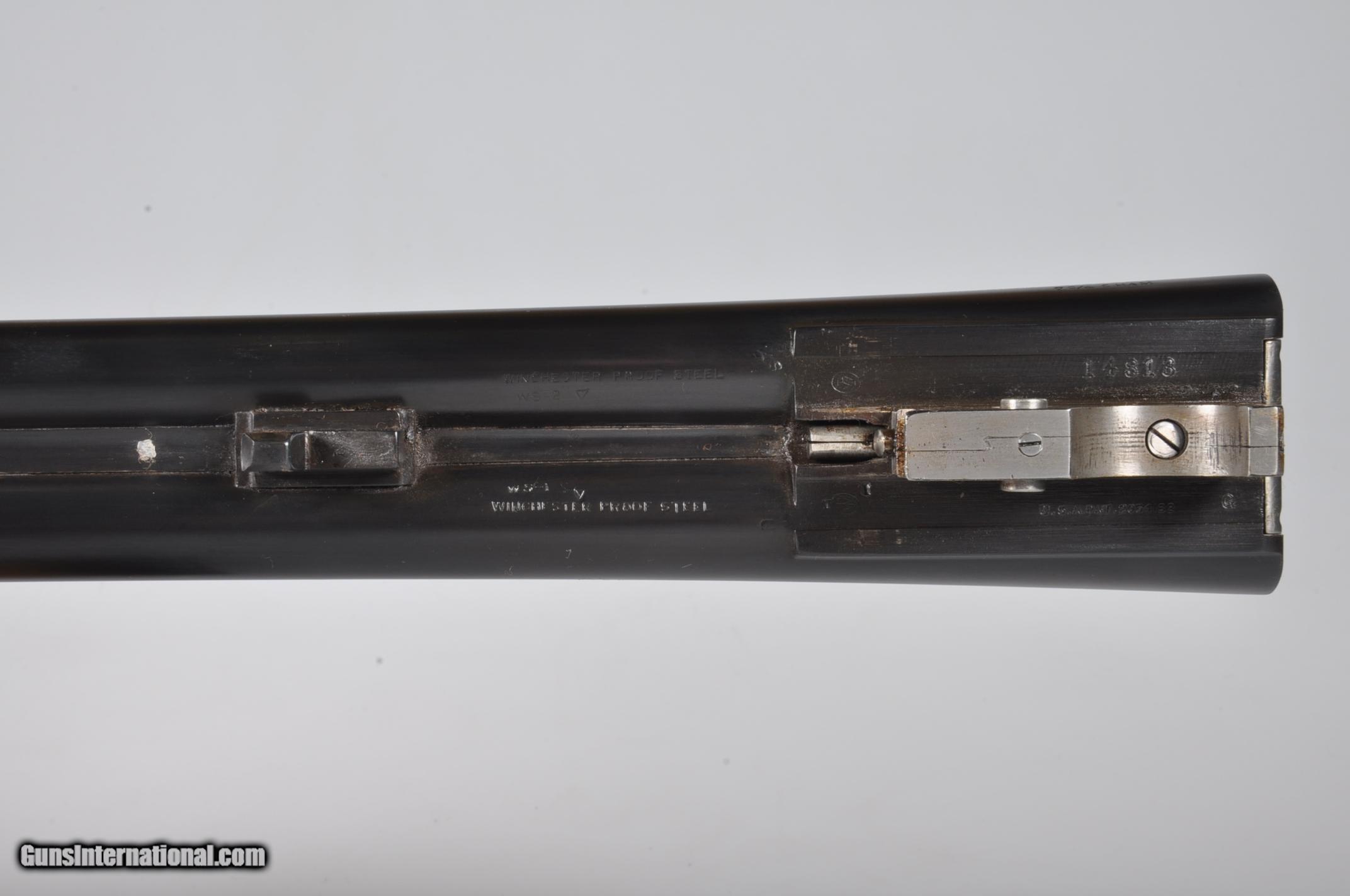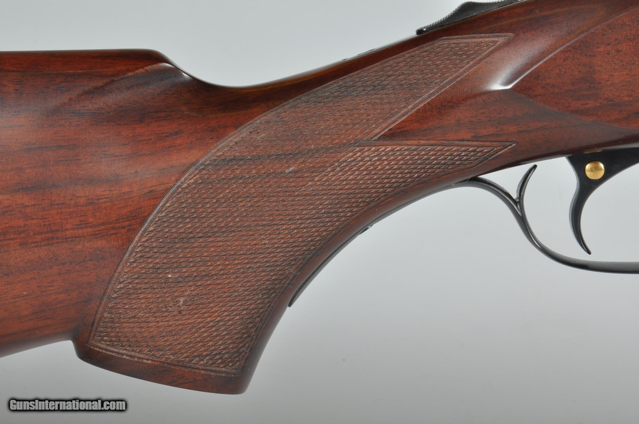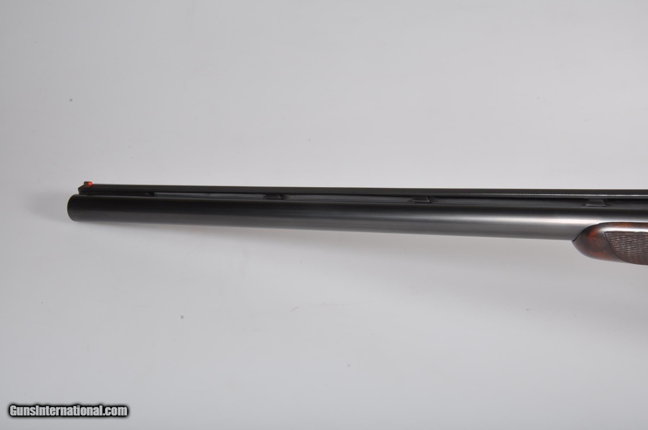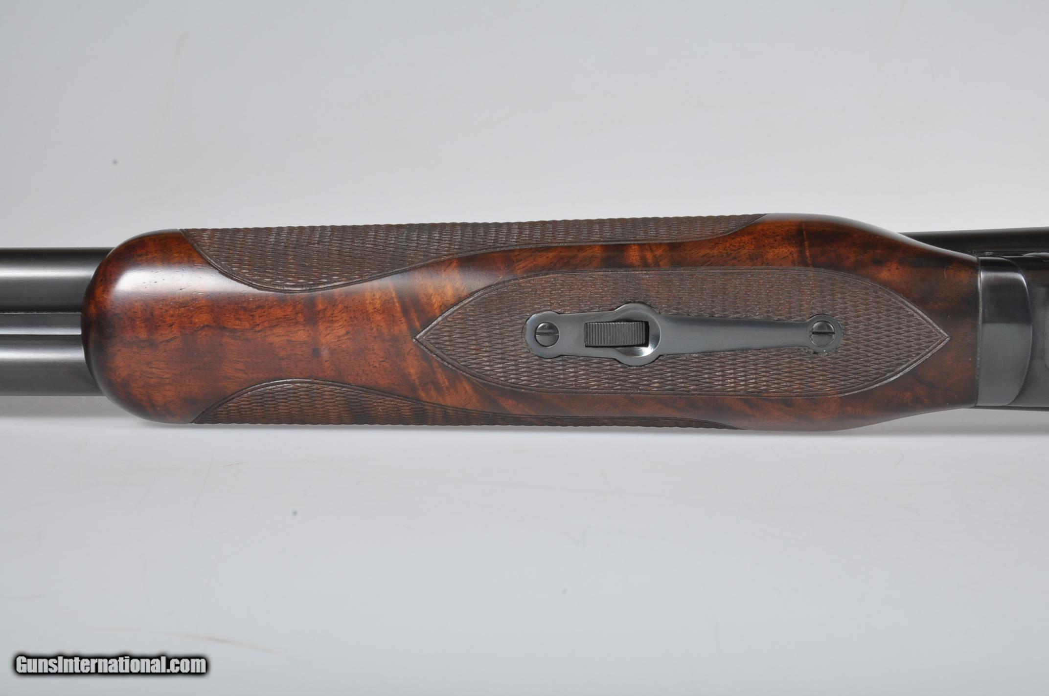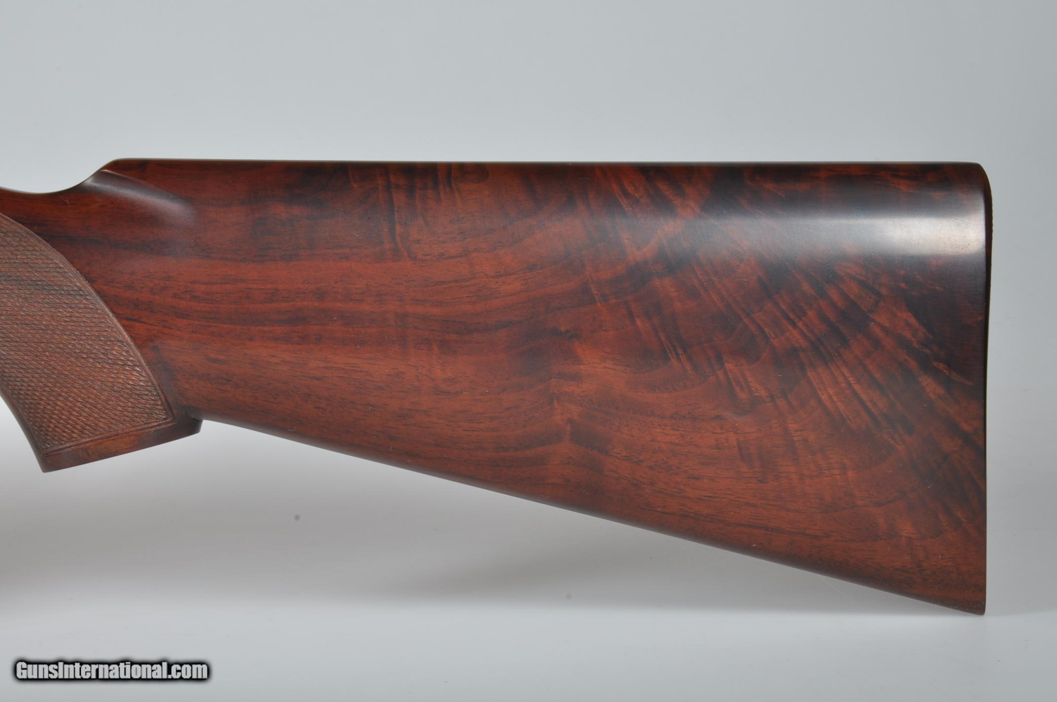 Description: 16 gauge, 26″ barrels, 2 3/4″ chambers. Chokes are marked WS-1/WS-2 and measure +.015 right and .007 left. Factory ventilated rib with a silver mid and red front bead. Bores are bright and shiny. Floorplate is marked SKEET. Single selective trigger, automatic ejectors, non-automatic safety. Nicely feathered pistol grip stock checkered in two point pattern with a 14 1/4” length of pull over a checkered butt. Beavertail forearm with roll type release checkered in “Kidney” pattern. Condition: Excellent as completely and professionally refinished. Wood and metal are near 100%. Drop at comb: 1 1/2”. Drop at heel: 2 1/4”. Weight: 7.4 lbs. Mechanics are good. If you are looking for a particular Parker Double or Winchester 21 please email me. We have nearly 1,000 in stock of all gauges and grades. California Sales OK PLEASE NOTE! My office hours are 7am-5pm CST Monday through Wednesday. Emails or phone calls received after hours and on the weekend will be answered on the following business day. SOLD Manufacturer: Winchester Model: 21 Skeet Serial Number: 14813 Chambers: 2 3/4 Ejectors: Yes Barrels: 26 Triggers: SST Gauge Info: 16 Stock: Pistol Grip Fore End: Beavertail LOP: 14 1/4 Rib: Ventilated |