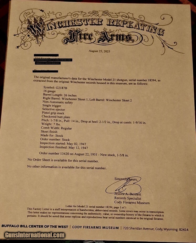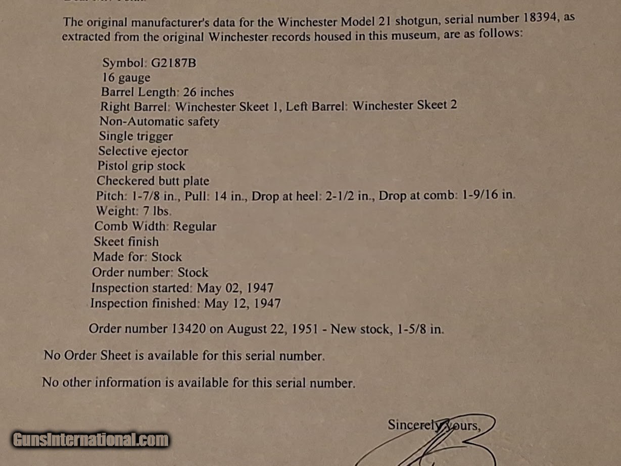 Description: I inherited this beautiful shotgun from my father's estate when he passed a year ago. I know almost nothing about fine shotguns, but was told this one was special. It is a Winchester Model 21 in 16ga and is a Skeet model. I was told it is in excellent original condition and has not been refinished. Furthermore, I met with my father's attorney while settling the estate and he indicated that he used to own this shotgun. He purchased three Winchester Model 21s, all original and un-fired, in calibers 20ga, 16ga, and 12ga. He bought the matching set of shotguns in the 80's from my father's gun store in the 80's for a price of just under $5k. He took the 16ga out hunting, and fired it in the field, harvesting a few birds. When my father found out, he told him that he really shouldn't have done that, since it was a pristine un-fired Model 21 and he just drastically lowered the value. My father ended up buying the shotgun back, and used it to take a few Chukkar and quail. It appears to still be in excellent condition with very little discernable wear. I have a Winchester shotgun case that I assume is for this shotgun. It appears to be an original factory case from the 1940s in excellent condition. Letter of certification completed by the Cody Firearms Museum. $9200 Shotgun Gauge: 16 Gauge Manufacturer: Winchester Model: 21 Serial Number: 18394 Condition: Excellent Price: $9,200.00 Shipping: $39.99 Pay with