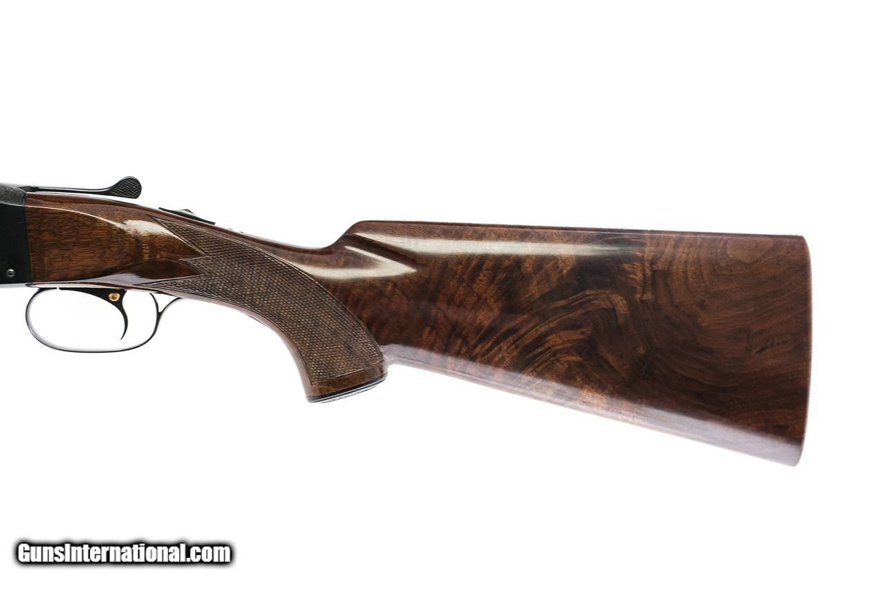 Description: Winchester - Model 21, SxS, 16ga. 26" Barrels Choked WS1/WS2. Factory vent rib, 2 ¾", capped pistol grip, checkered butt, single selective trigger, automatic ejector, deluxe checker, multi point pattern, very highly figured wood. The gun has been professionally reblued, and stippled by the top rib on the frame ( very common). The work done on this gun is very good, it looks like a new gun at this point. This a very rare configuration. Inv: 76587 7 lbs. 4 oz. 13 ¾" x 1 ½" x 2 5/8" $9,250.00 SOLD |