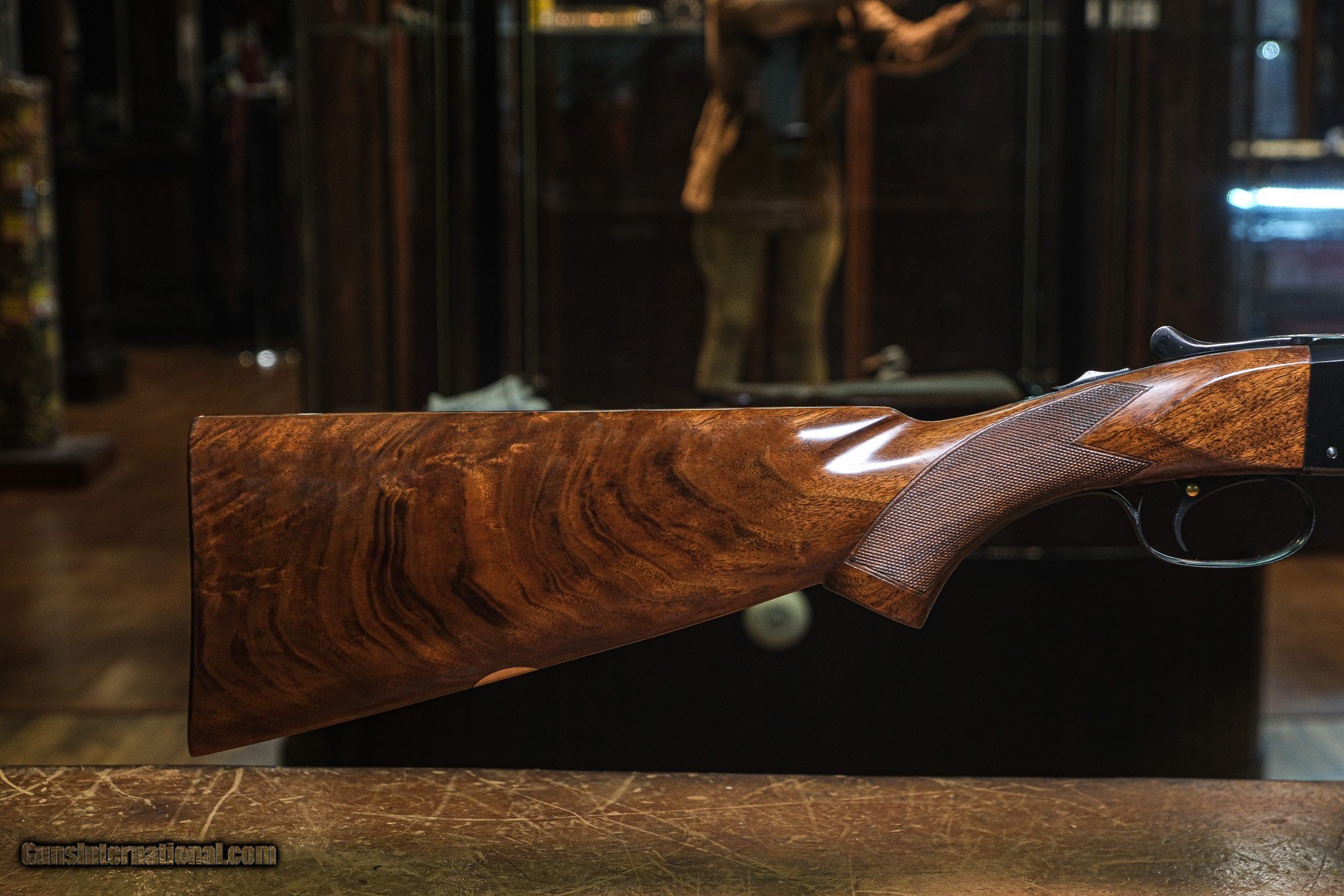 Description: Winchester - Model 21, SxS, 20ga. 26" Barrels Choked WS1/WS1. Matte rib, Bradley red front sight, choked WS1/WS1, kidney style beavertail, pistol grip, gold oval, checkered butt, single selective trigger, automatic ejector, 99% bluing, perfect with not even sharp edge wear, perfect checkering. Factory skeet grade. Magnificent all original collector grade gun. Comes with a lifetime warranty to original owner courtesy of Connecticut Shotgun. Inv: 83323 6 lbs. 8 oz. 14" x 1 ½" x 2 ½" $9,450.00 CT Shotgun/Galazan buys sells and trades the world’s largest inventory on Model 21 shotguns. We are experts in all phases of buying, selling, and repairing as well as restoration of these very complex guns we have handled more Model 21 in all regards than all other companies put together. we have bought sold and manufactured most of the Grand Royal and Grand American grade guns and we understand them intimately. In 1994, Galazan/CT Shotgun purchased the Winchester Custom Shop from U.S. Repeating Arms Company and at that time designated the sole manufacturer and authorized repair for the Model 21, we purchased all of the inventory machining tooling and highly regarded trade secrets in regards to manufacturing and repairing maintaining these intricate shotguns. CT Shotgun/Galazan continues to perform the only authorized factory service on all these fine guns if you are interested in purchasing repairing or altering a Model 21 we should be your sole source when it comes to a Model 21 every gun we sell is serviced and inspected, comes with our lifetime warranty. CT/Galazan also has all assorted accessories, original style cases and recoil pads. WHY BUY A MODEL 21? 1. No one knows the gun better than us. 2. We are the only authorized repair facility for Model 21s. 3. We build the new Winchester Model 21. 4. We build the CSMC Model 21. 5. Every gun receives a safety inspection before sold to a customer. 6. Most guns are detailed, cleaned & lubricated and any parts charged to make them as factory new. 7. Fair honesty, reputable dealing for over 20 years. 8. Very competitive pricing. If you compare our guns to any other gun on the market, you will find in most instance that our guns are the best value. The best are brought up to factory specs which, in some cases, can be more than the gun. 9. The largest collection of Model 21s in the world. 10. With any Model 21 SxS you buy from us; we offer a lifetime mechanical warranty. SOLD |