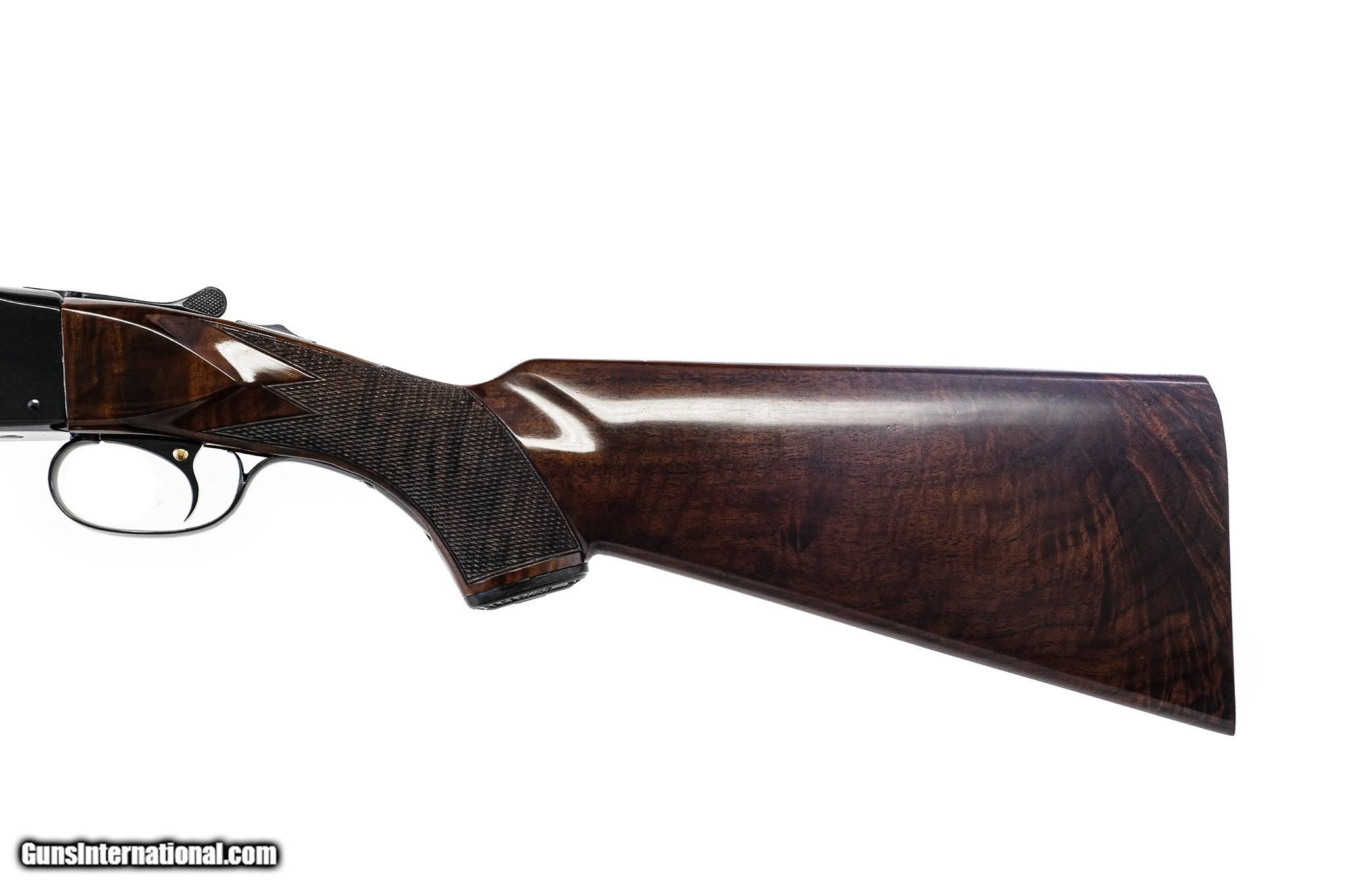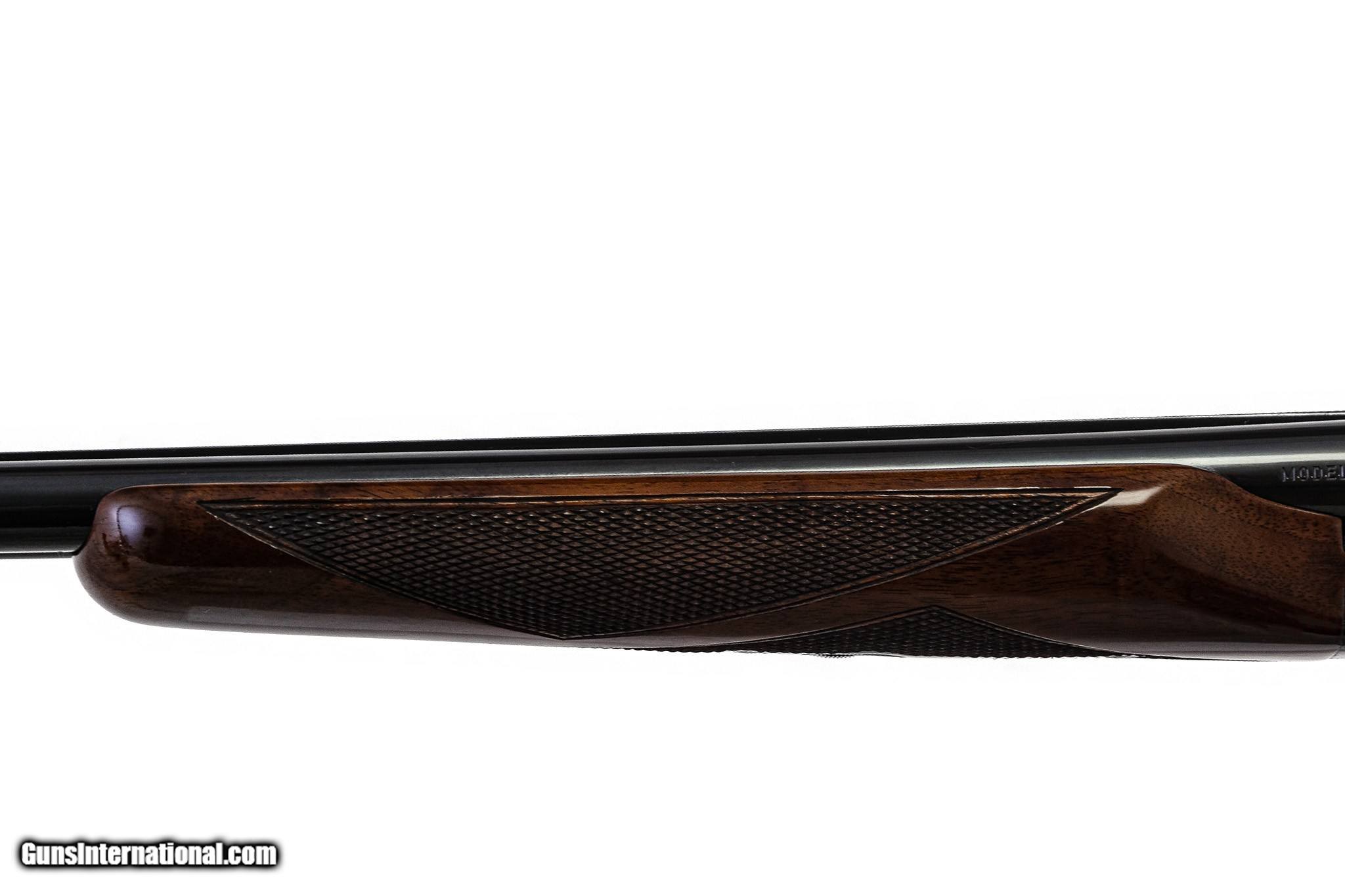 Description: Winchester - Model 21, SxS, 20ga. 28" Barrels Choked M/F. 1950s gun, 3-point deluxe checkering with DIAMOND checkering pattern on forend, single selective trigger, automatic ejector, beautifully figured Black American Feather Crotch, matte rib, capped pistol grip, 99% of perfect blue, wood finish, and checkering, all the edges and corners are sharp and crisp! Screws are perfect. Just an outstanding gun! Comes with a lifetime warrant for this fair above average gun! Inv: 76297 6 lbs. 5 oz. 14 ½" (to a checkered butt) x 1 3/8" x 2 ½" $10,250.00 SOLD |