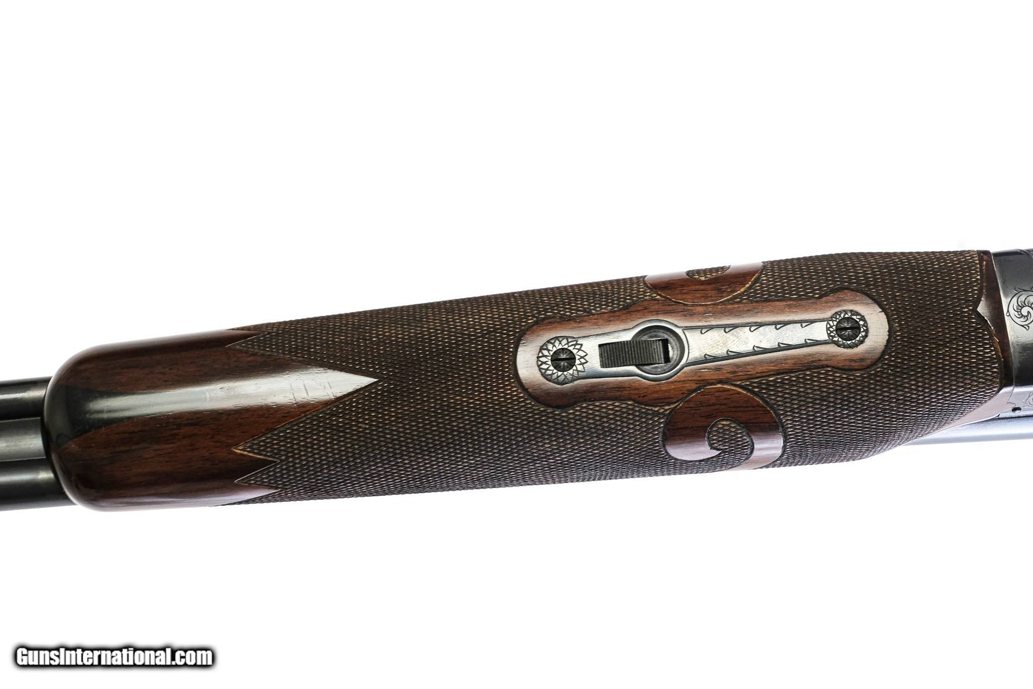 Description: Winchester - Model 21, SxS, #3 Engraving Pattern, .410ga. 28" Barrels Choked WS1/WS2. Straight grip full fancy feathercrotch American black walnut stock, checkered butt, beavertail forend with ebony insert, A-Carve checkering, 3” chambers, automatic ejectors, gold single selective trigger, #3 engraving pattern, vent rib marked CUSTOM BUILT BY WINCHESTER, jeweled flats, flat side round frame receiver with lightning cuts and lightning cuts in barrels, gun remains in 98% condition, leather cased, available for immediate delivery. Inv: 79464 7 lbs. 6 oz. 14 3/8” x 1 3/8” x 2 3/16” $17,999.00 SOLD |
