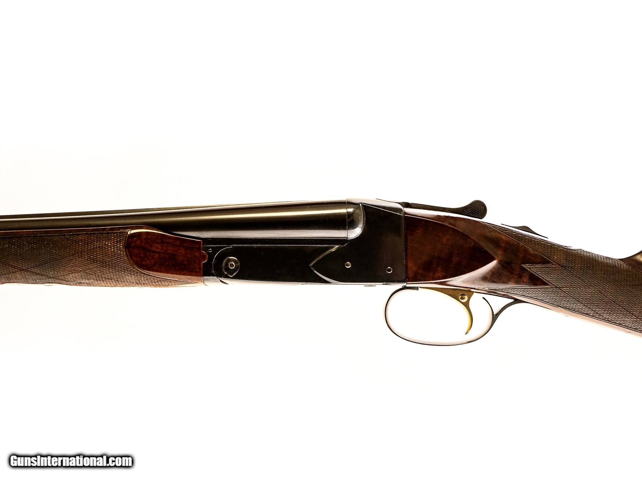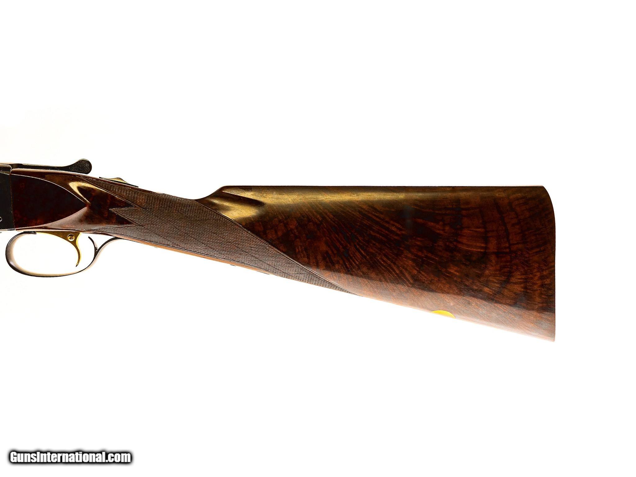 Description: Winchester - Model 21, SxS, Extremely Rare Small Bore Set, 28ga/.410ga. 28 IC/M & 28" IC/M. 28” barrels: IC/M Special order, matte rib, with lighting cut barrels with lightweight lightning cut frame. 28ga 28” barrels, IC/M, with matte rib. Both barrels have Bradley beads, Winchester proof steel, jeweled barrel flat forend iron, and water table. Has custom 3-point checkering pattern, forend has black ebony tips. This was a special order gun with a spear side old style frame, gold single selective trigger, straight grip, checkered butt. Ordered with the finest piece of black walnut that Winchester had available and it is just magnificent. A wonderful special order gun that shows no wear at all, it is brand new. We just went through whole gun, clean it, tested it, and can attest that it is perfect. Very unusual it being with all milled out lightweight features, matte rib, and two beaver tail forends. Just a great find, I believe that it is the only one we’ve had like this. Comes from a large selection of 21’s we are just starting to post. Inv: 64738 $32,500.00 - MAKE OFFER SOLD |